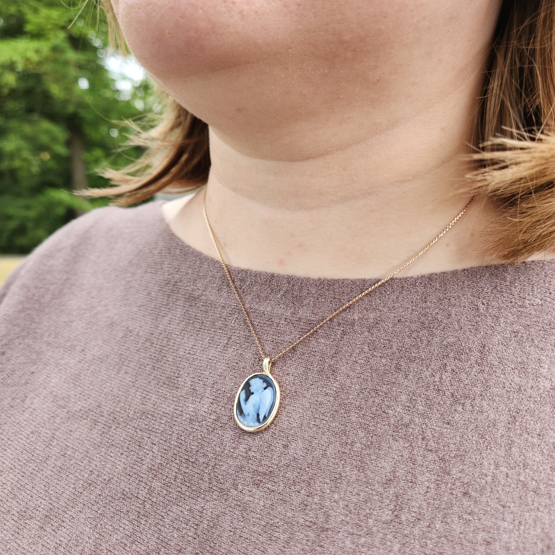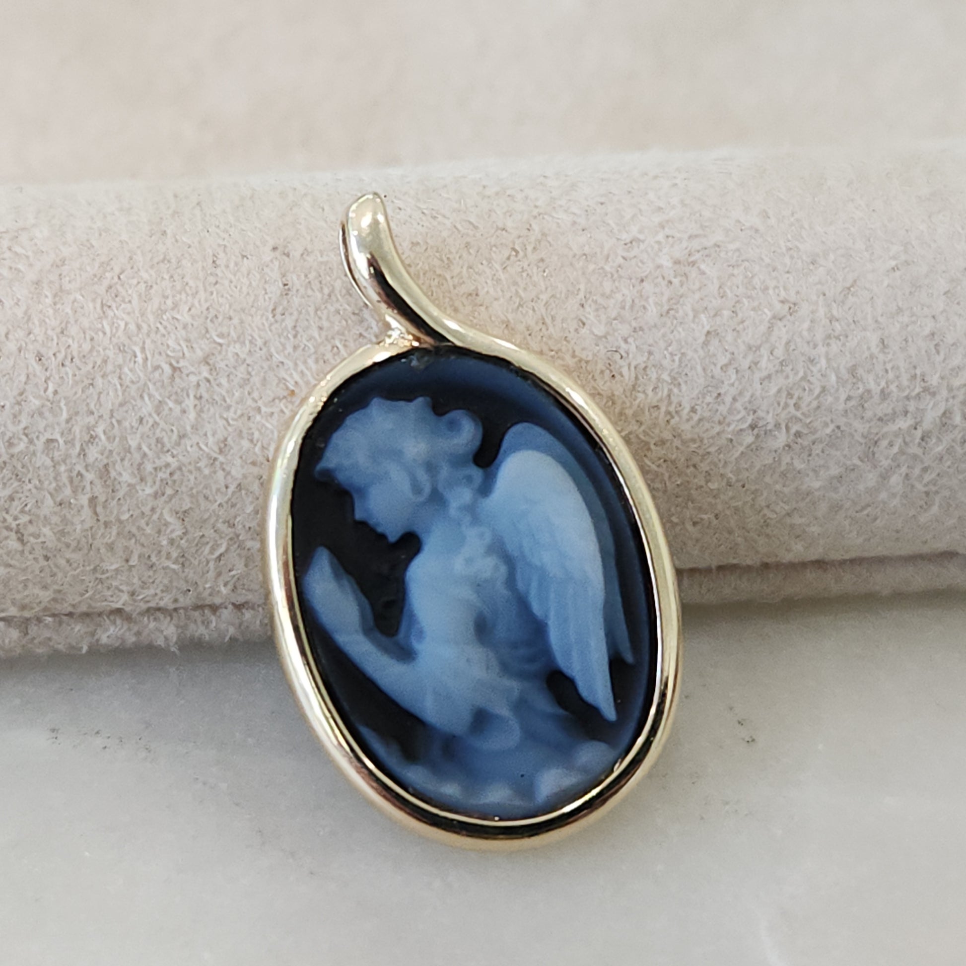 Carved from a banded agate stone, the angel has incredible detail, down to feathers in her wings. This is a more recent cameo, carved using a laser to capture such details. She has a delicate appearance that fades into a deep dark background.