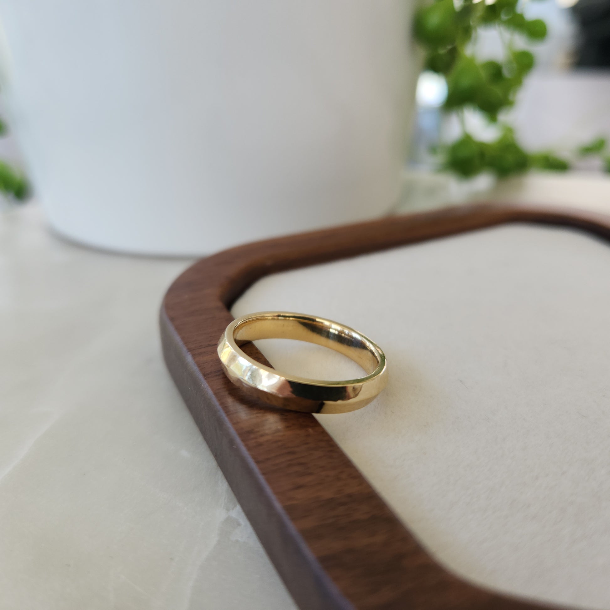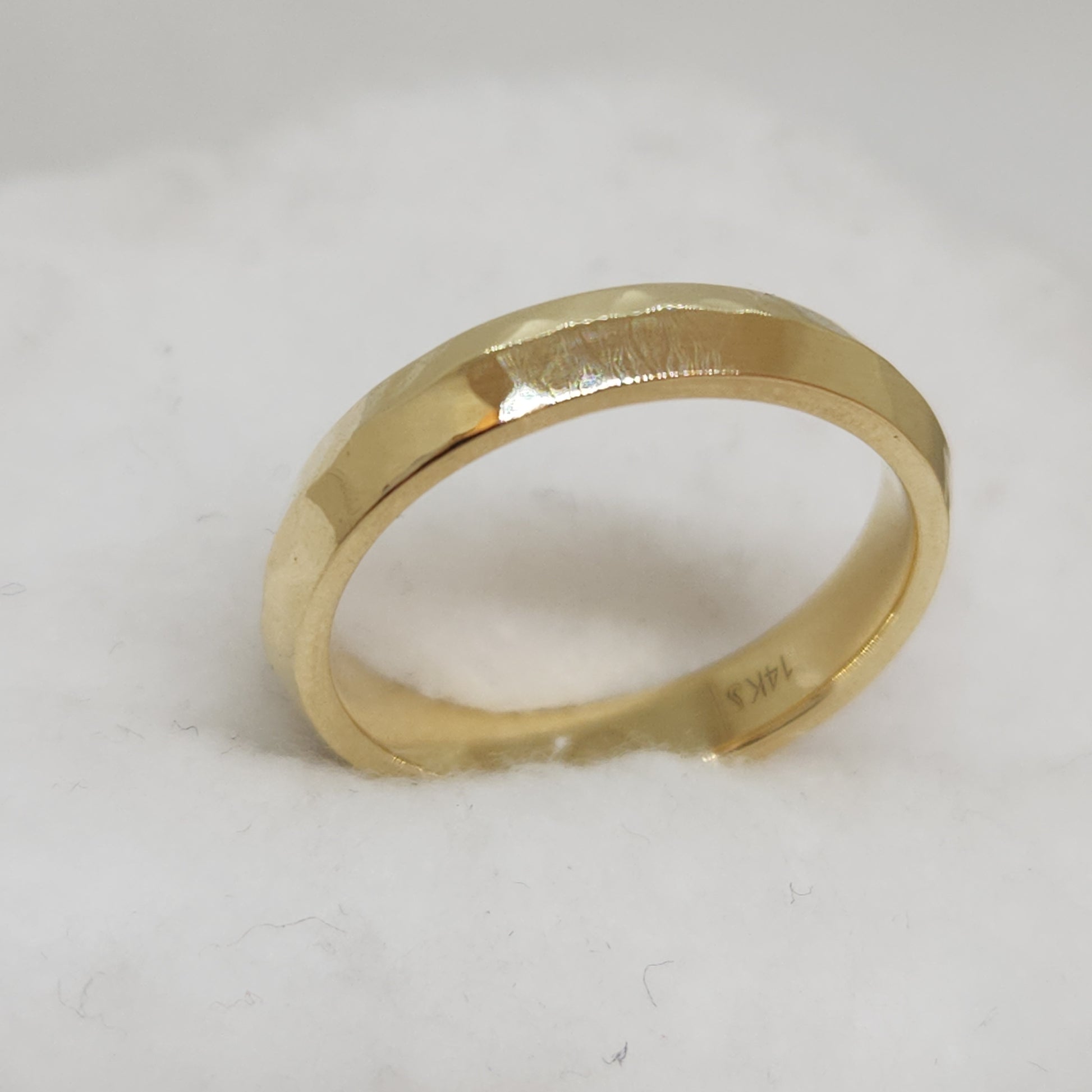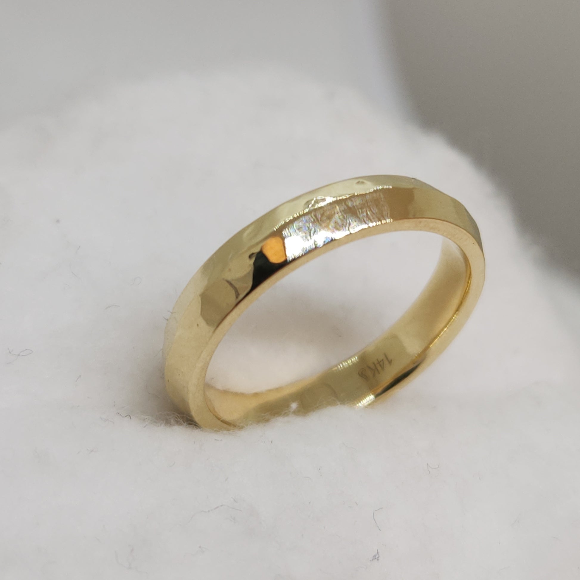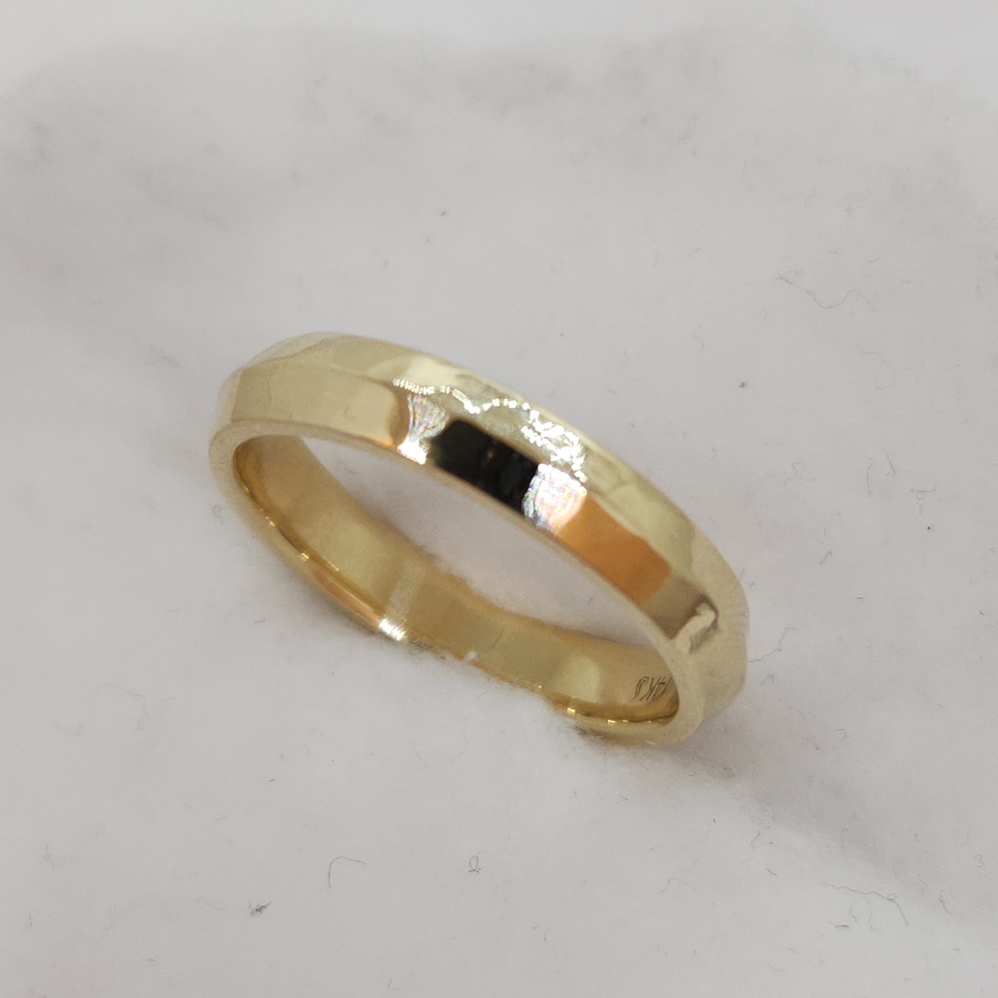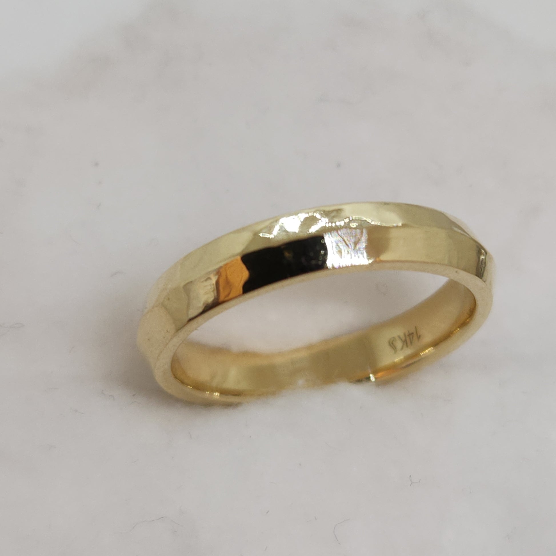 The knife-edge style ring was developed in 1886 by Tiffany. allowing for more light reflection and maximum shine. This band brings a twist to the traditional design with an added hammered texture. This will be a striking and comfortable band for everyday wear through all of life's adventures.