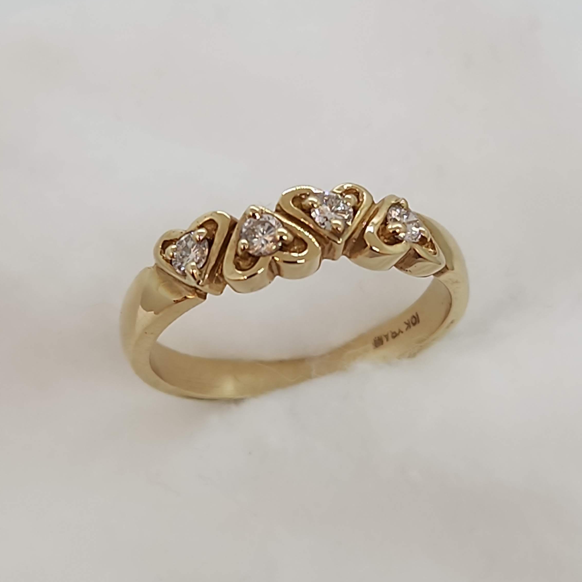 Love is in the air! We love this ring of hearts, each features a sparkling diamond. The stones are set low down, perfect for everyday wear or someone who works with their hands. Four hearts can symbolize four members of the family, four children or four beloved pets.