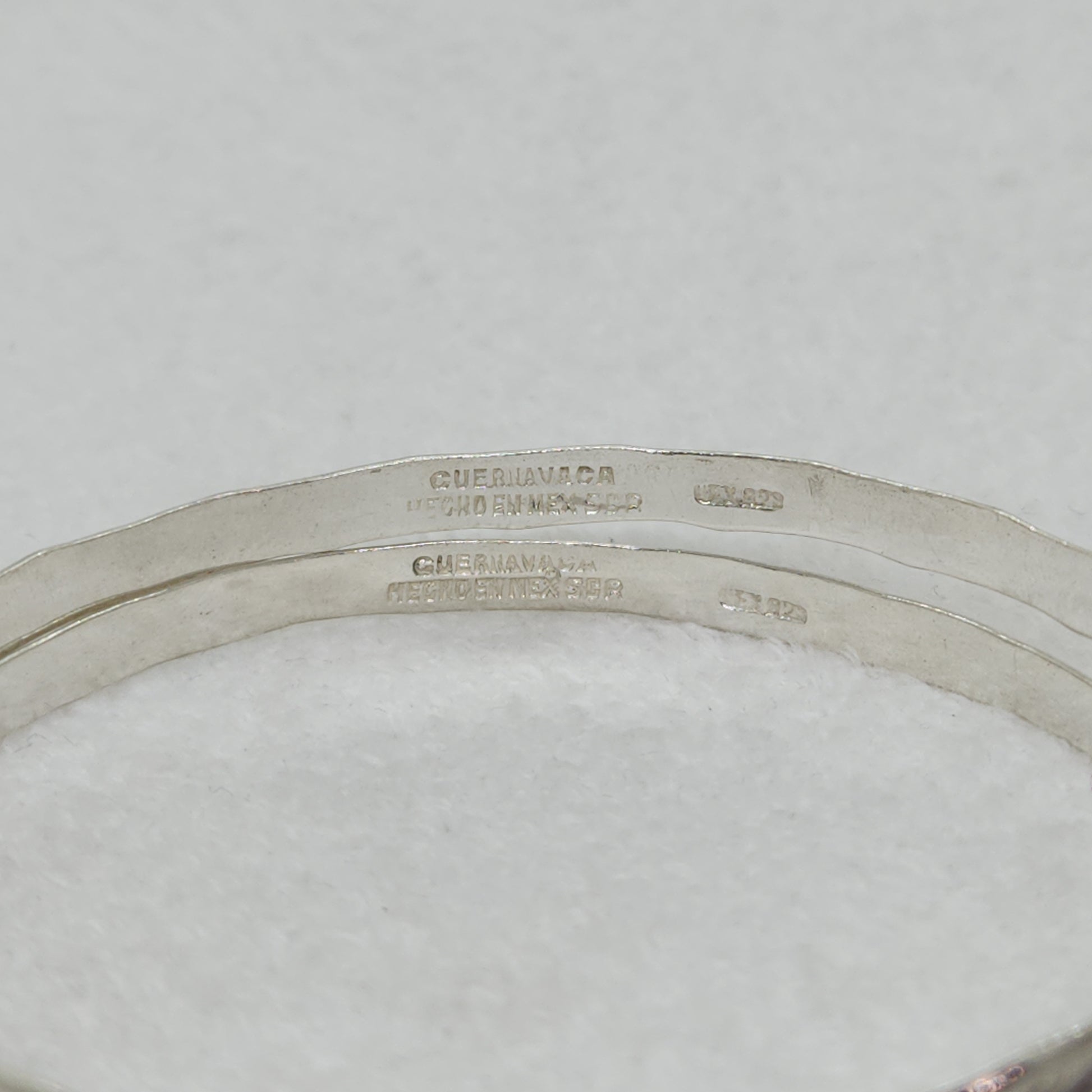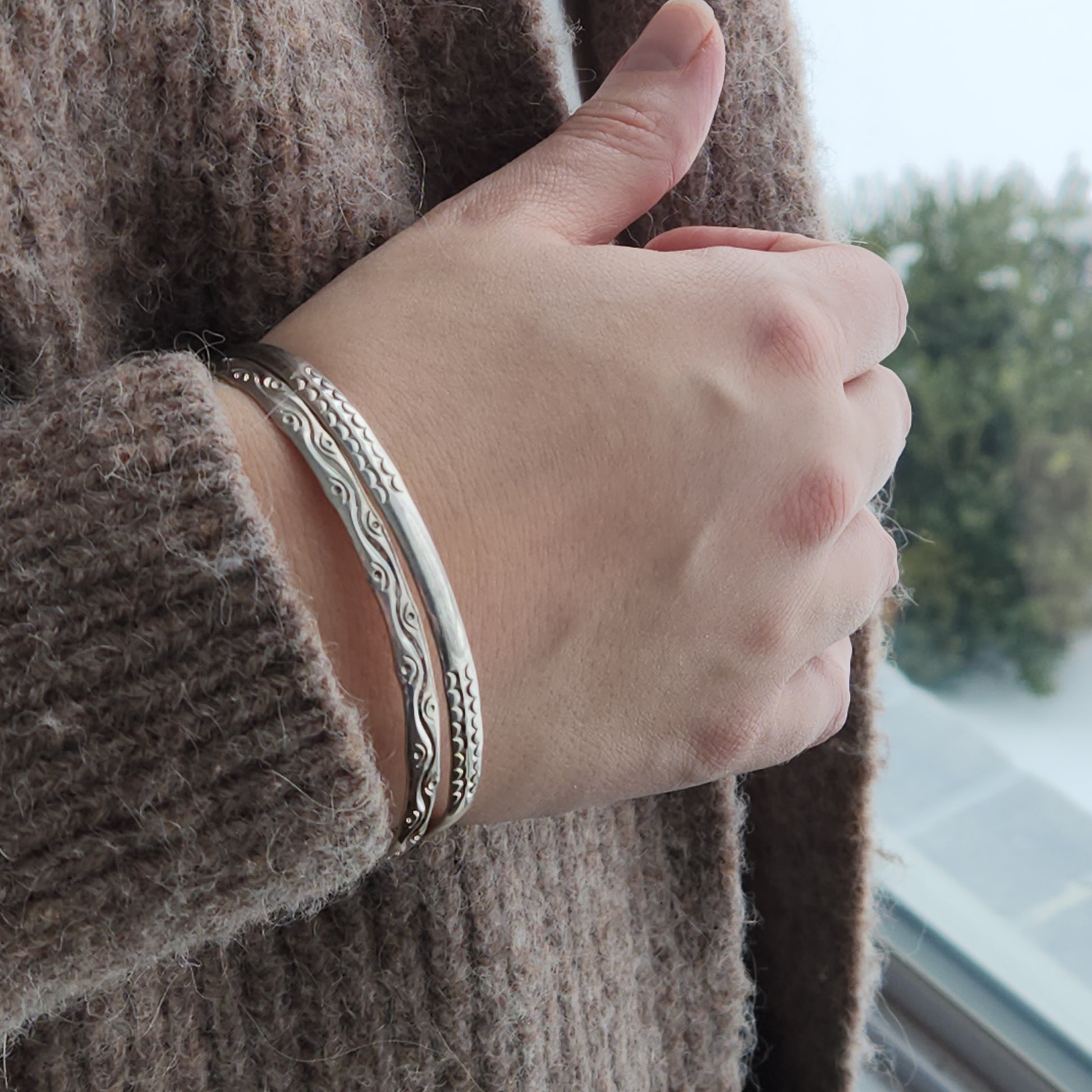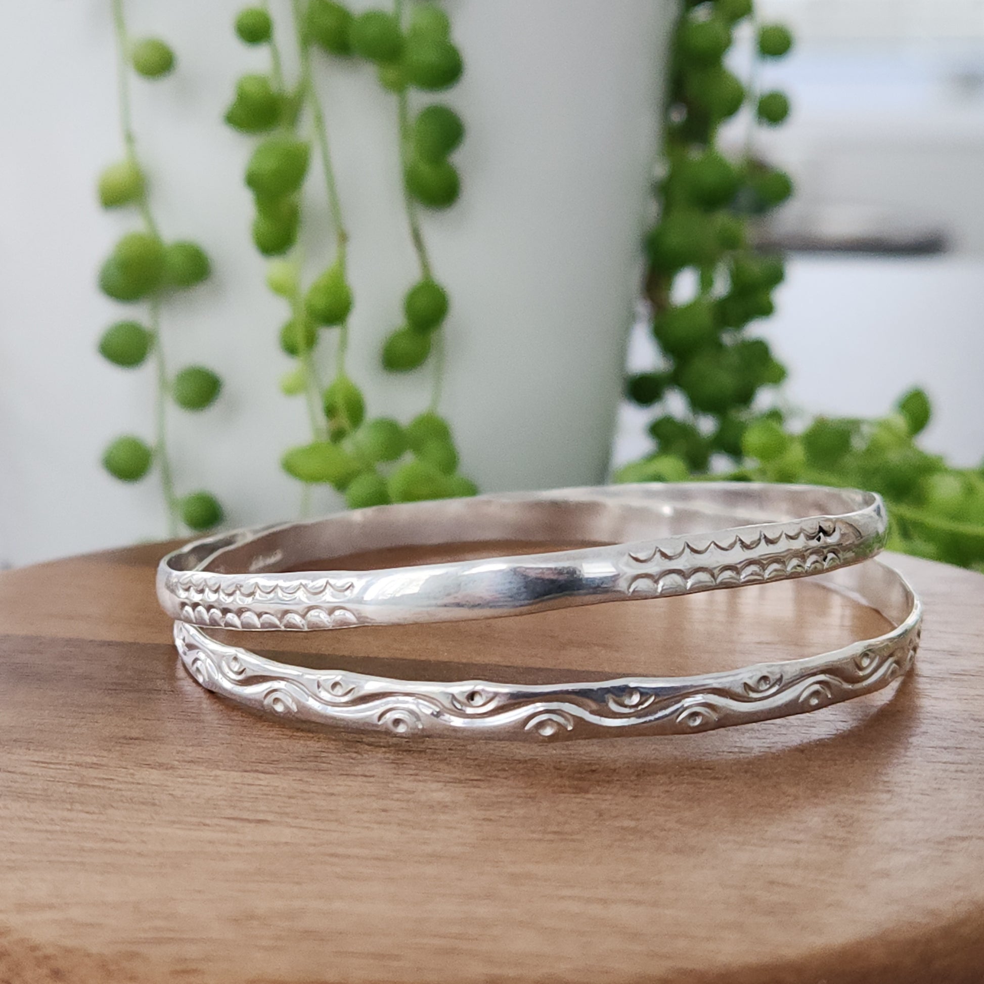 We love when we get jewellery with interesting stamps! These bracelets were made in the city of Cuernavaca, the capital and largest city of the state of Morelos in Mexico. They were handmade and the design patterns were created using stamps. We get a feeling of movement and lightness when looking at them. They have stamps for the city they were made in and "Hecho en Mexico" which means Made in Mexico.