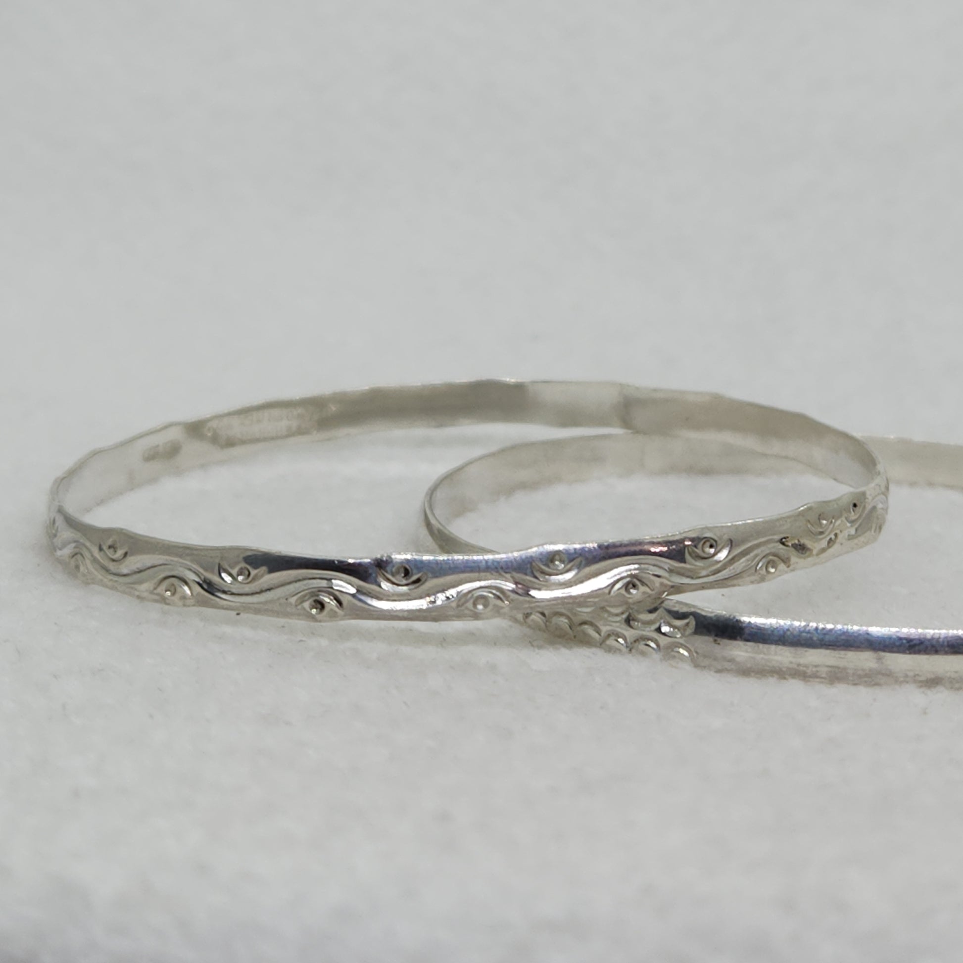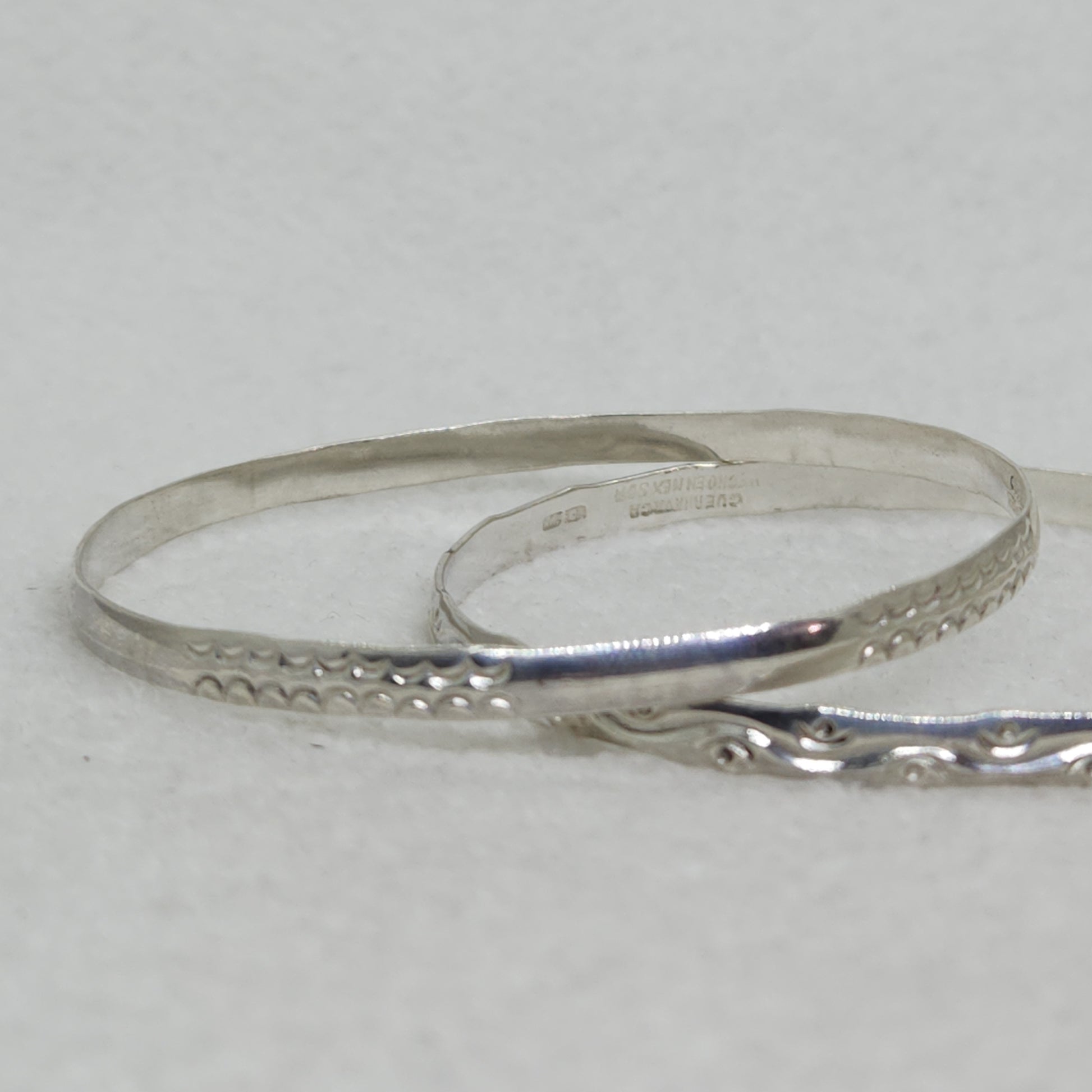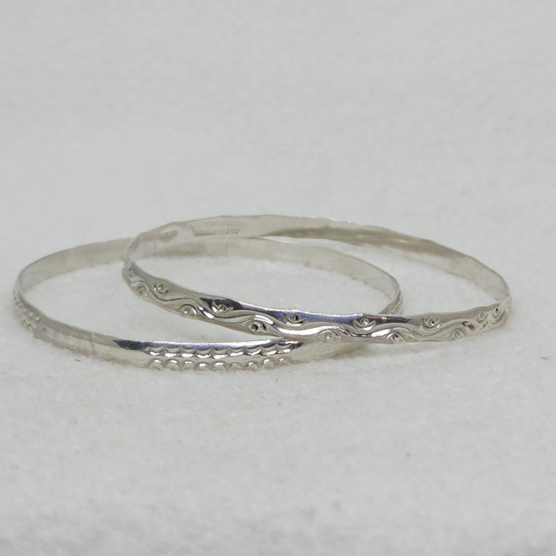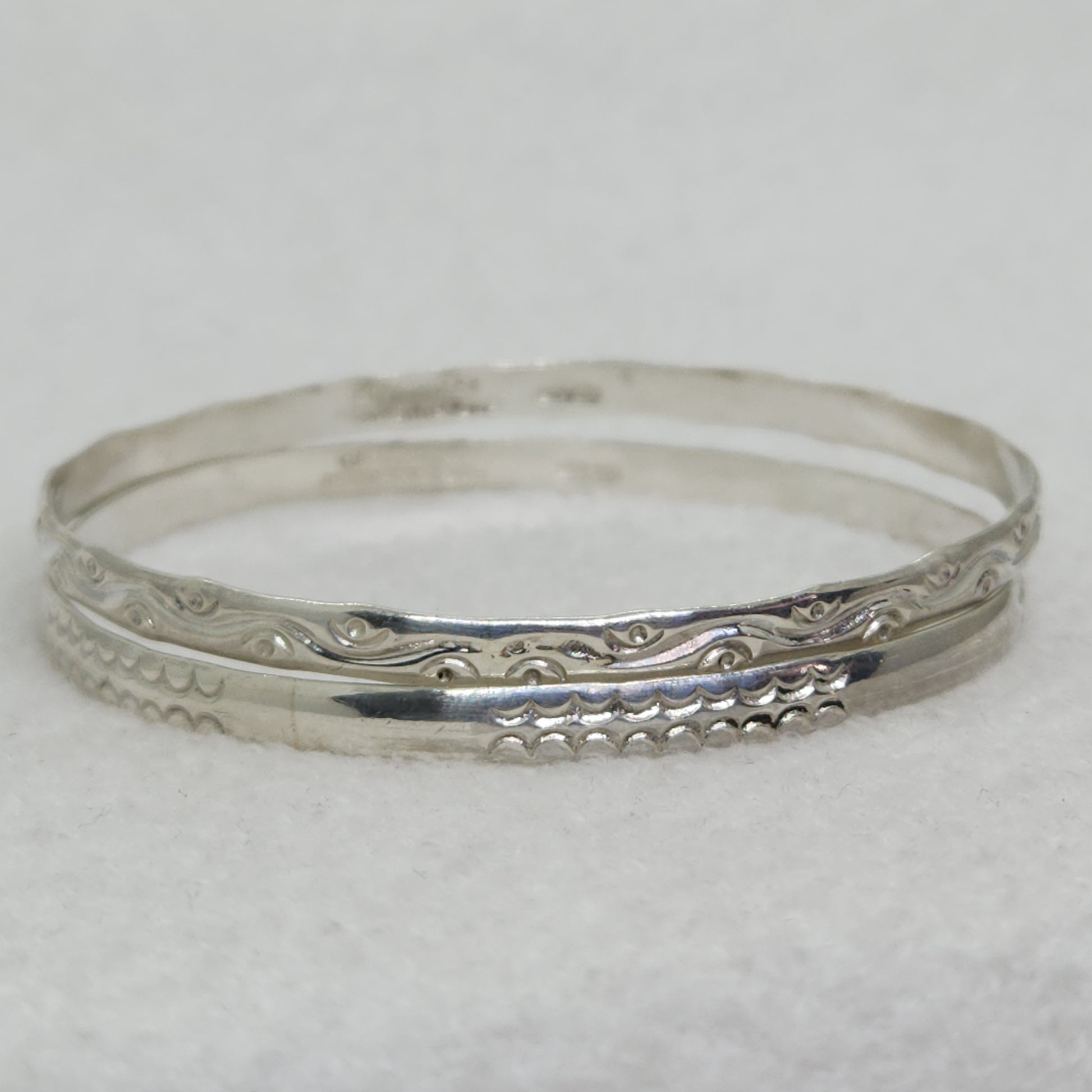 We love when we get jewellery with interesting stamps! These bracelets were made in the city of Cuernavaca, the capital and largest city of the state of Morelos in Mexico. They were handmade and the design patterns were created using stamps. We get a feeling of movement and lightness when looking at them. They have stamps for the city they were made in and "Hecho en Mexico" which means Made in Mexico.