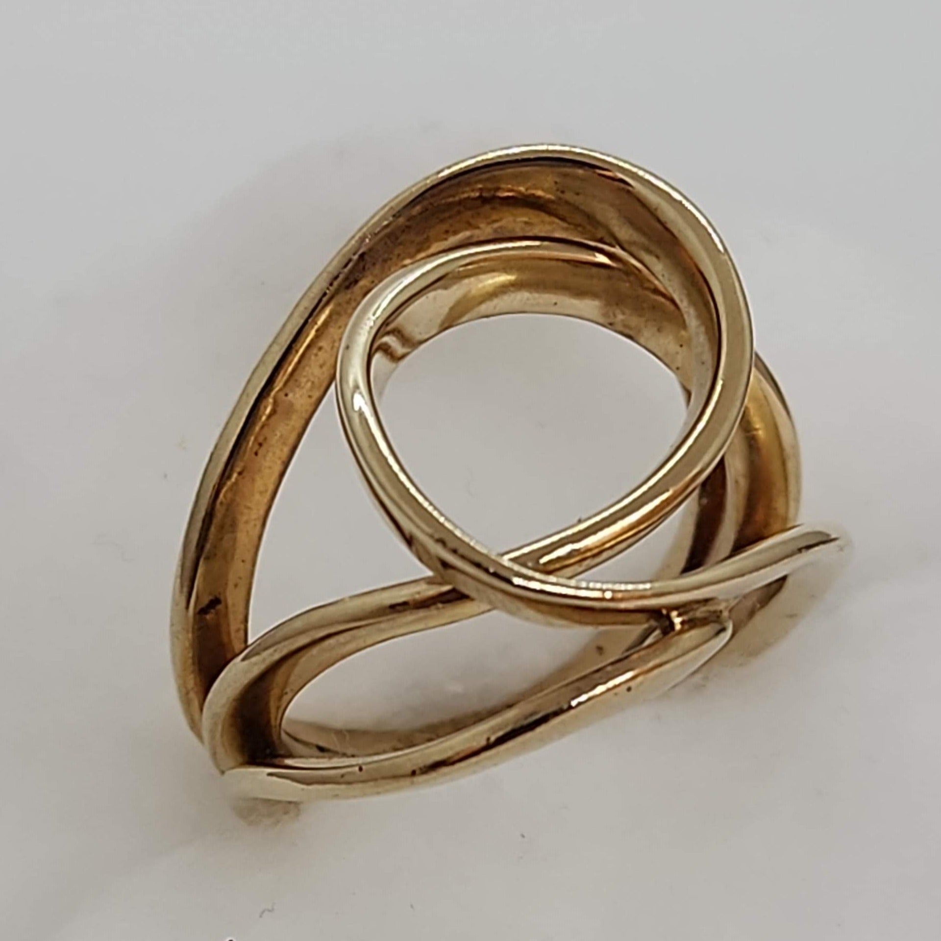 Bold and striking yet light and airy at the same time. This handcrafted ring is made from two matching forms that are interlocked and affixed to each other to form a variation on an infinity ring. Designed and made by Marigold Design Studio this is a spectacularly unique piece.