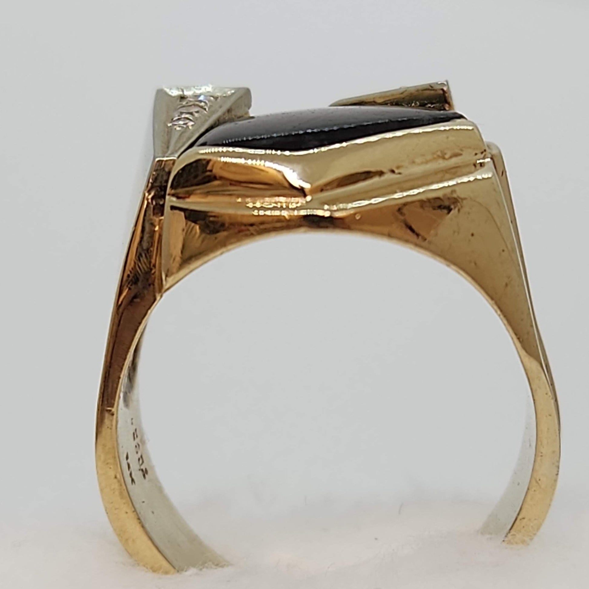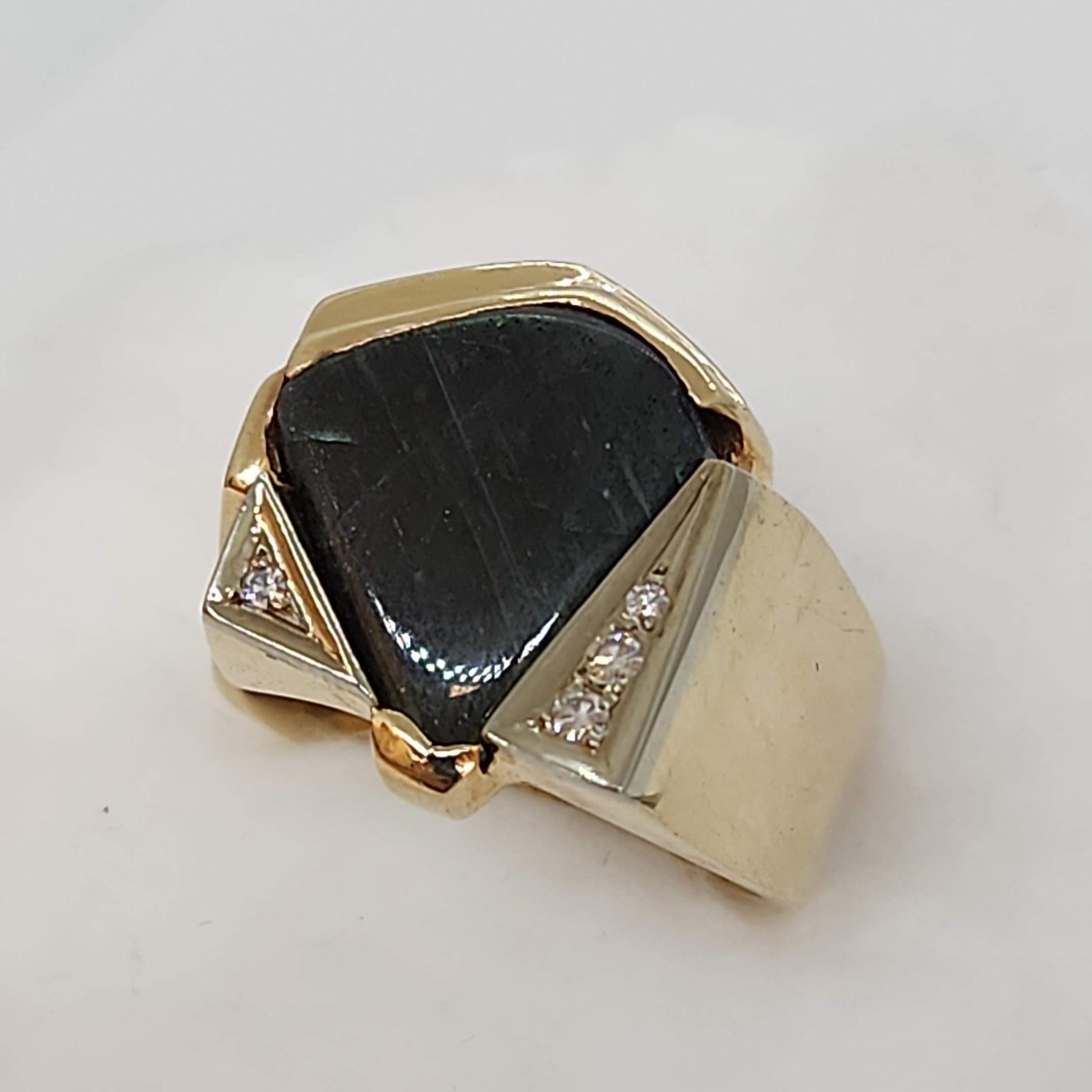 Angles and layers, this ring holds your interest from every vantage point. A labradorite uniquely set with yellow gold steps on one side and white gold with diamonds on the other. Angle your hand to catch the colours flash across the labradorite. A one of a kind ring, made and designed by Marigold Design Studio. Labradorite is a Canadian gemstone that comes from several places in Newfoundland and various parts of Labrador. According to Inuit legend, a warrior saw the Northern Lights trapped in the rocks and struck them with his spear to free some of the lights.