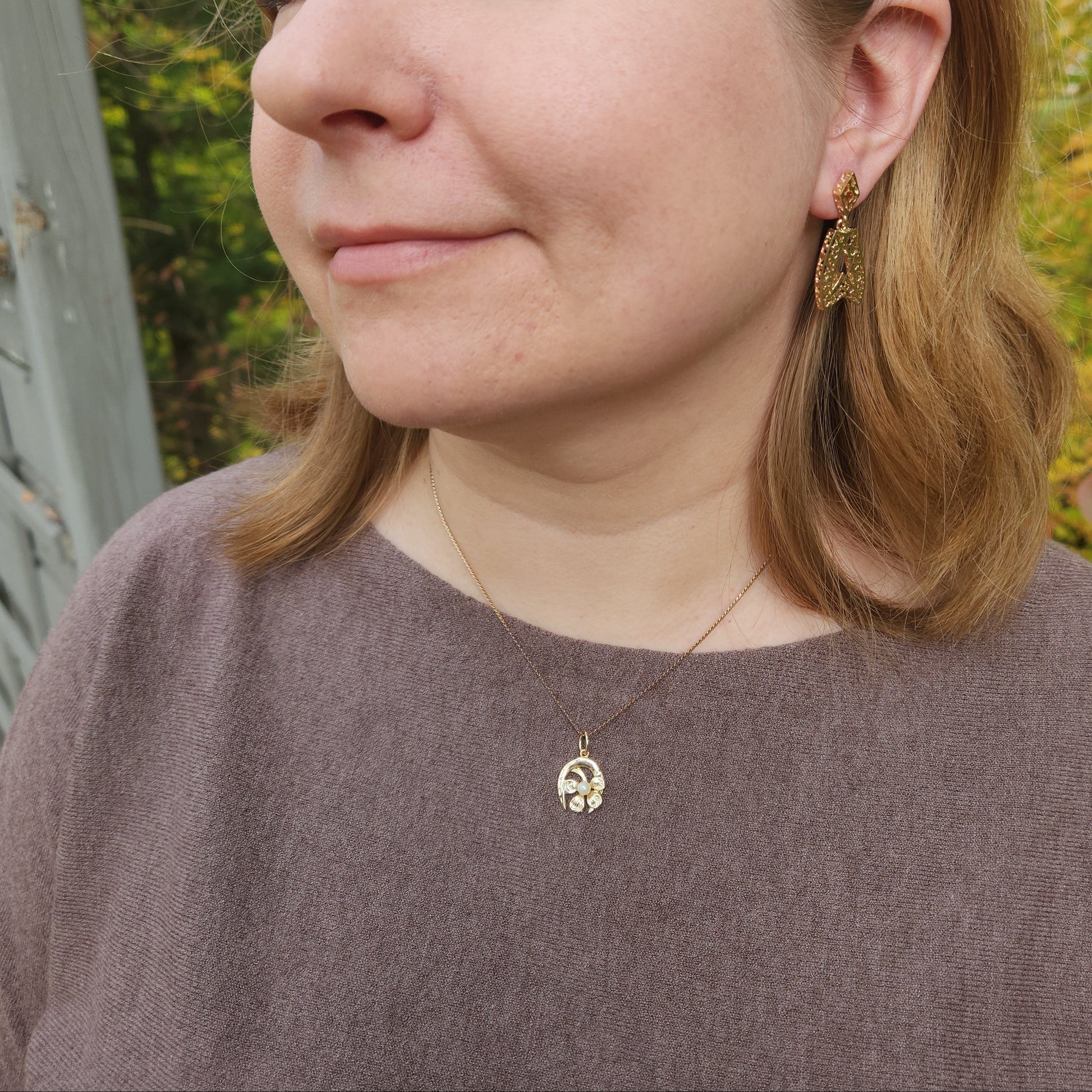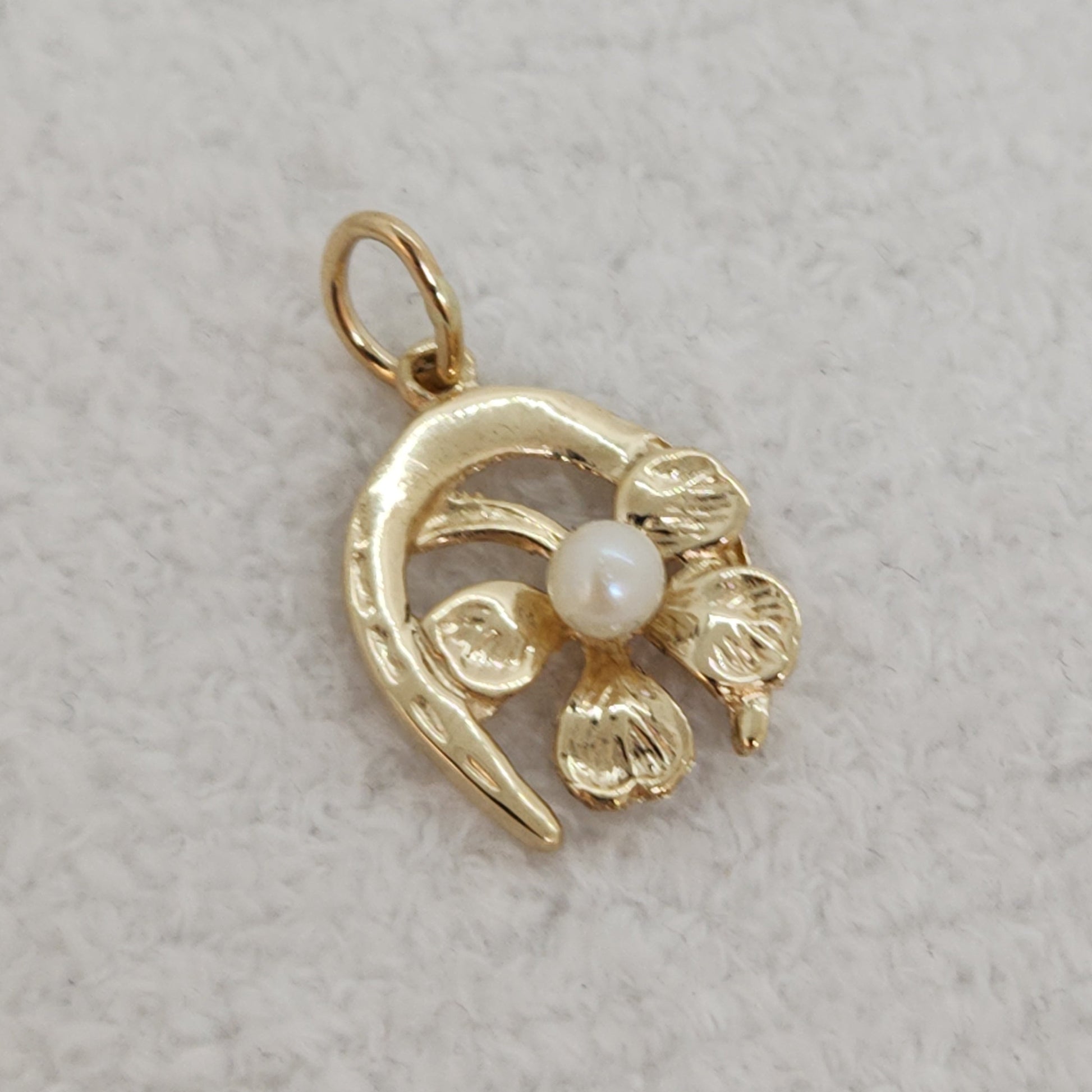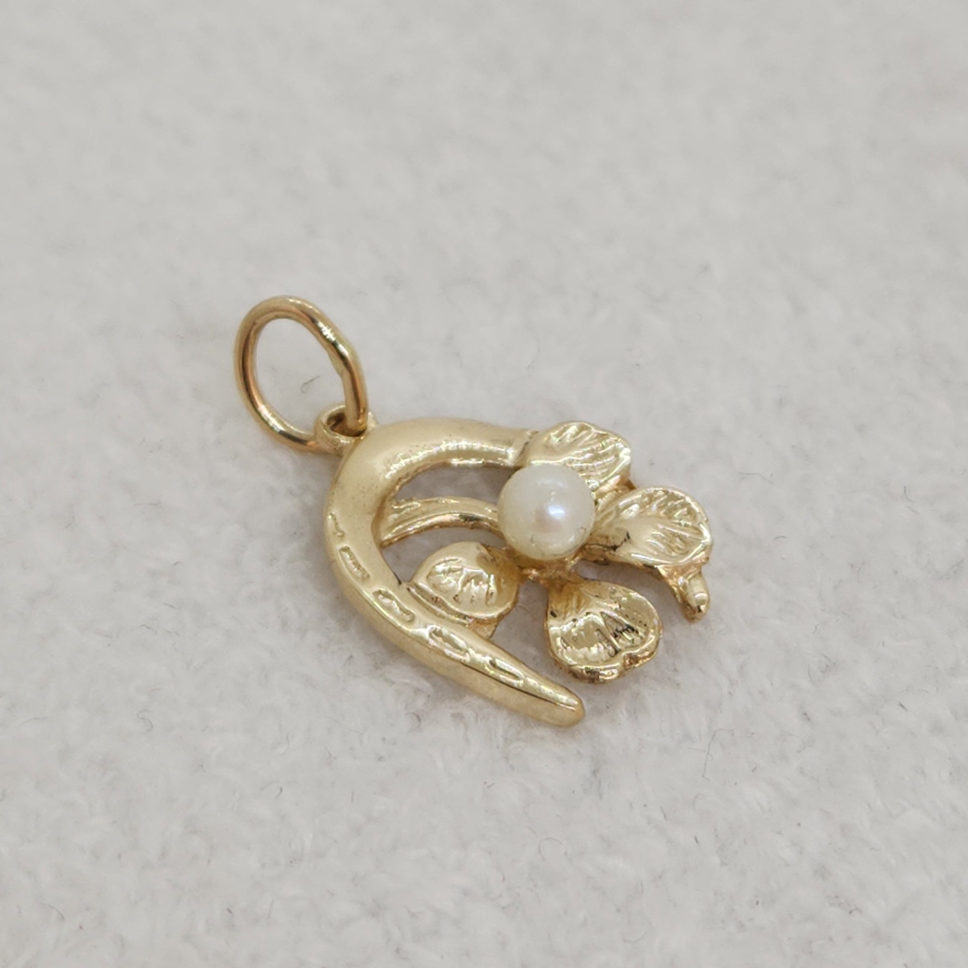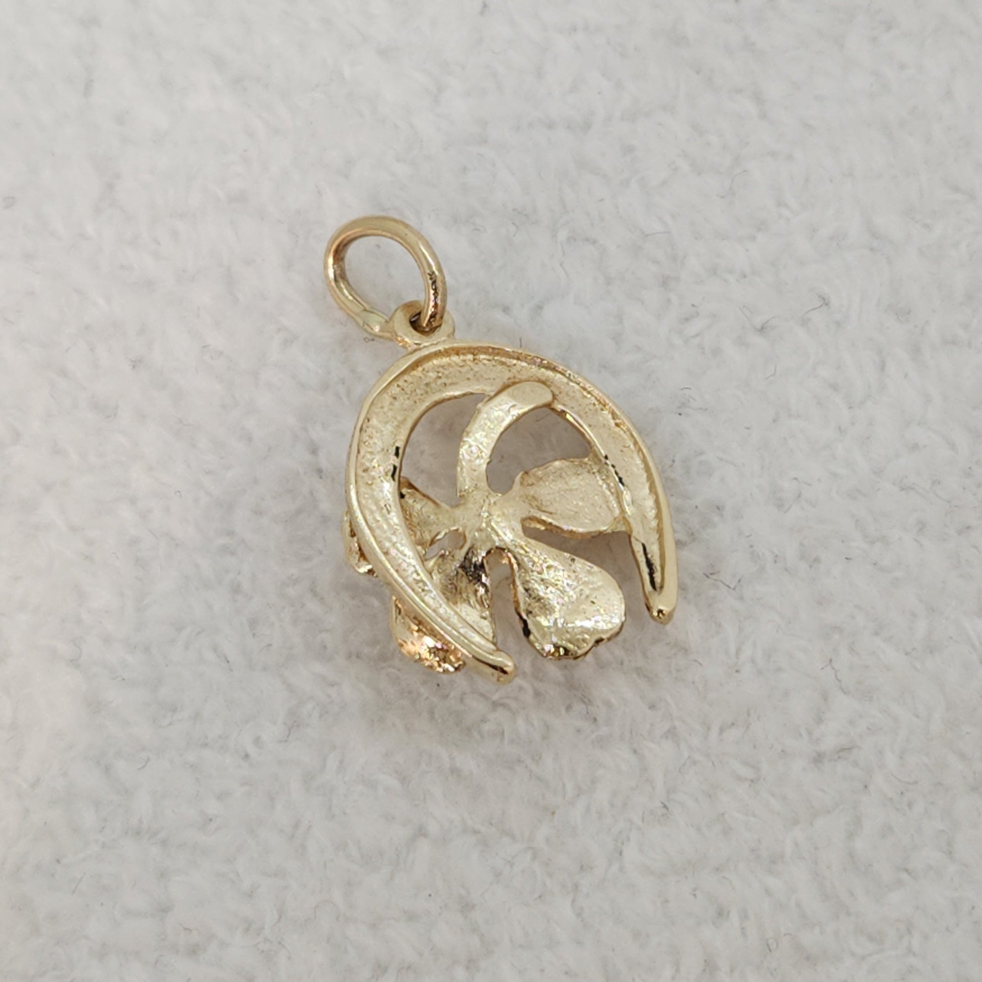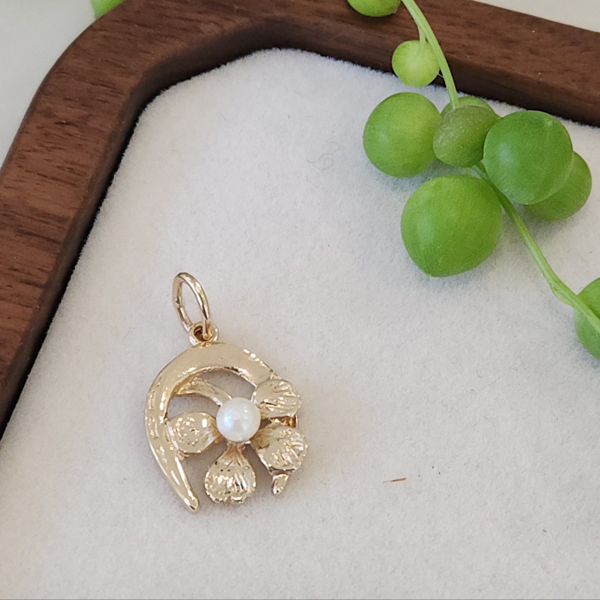 A unique good luck charm. A four leaf clover represents faith, hope, love and luck, paired with a horseshoe. Horseshoes were first considered lucky by blacksmiths, it was believed that fire and iron had magical powers and would ward off spirits of the past. They are also often mounted above doorways with the points facing up to "collect" the luck for those entering and exiting underneath.