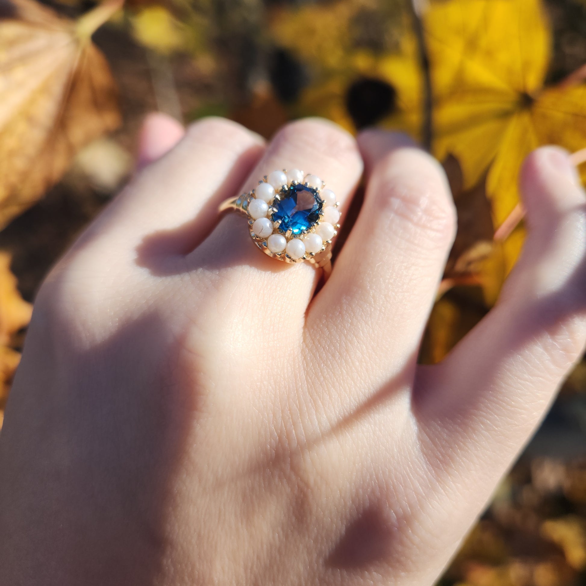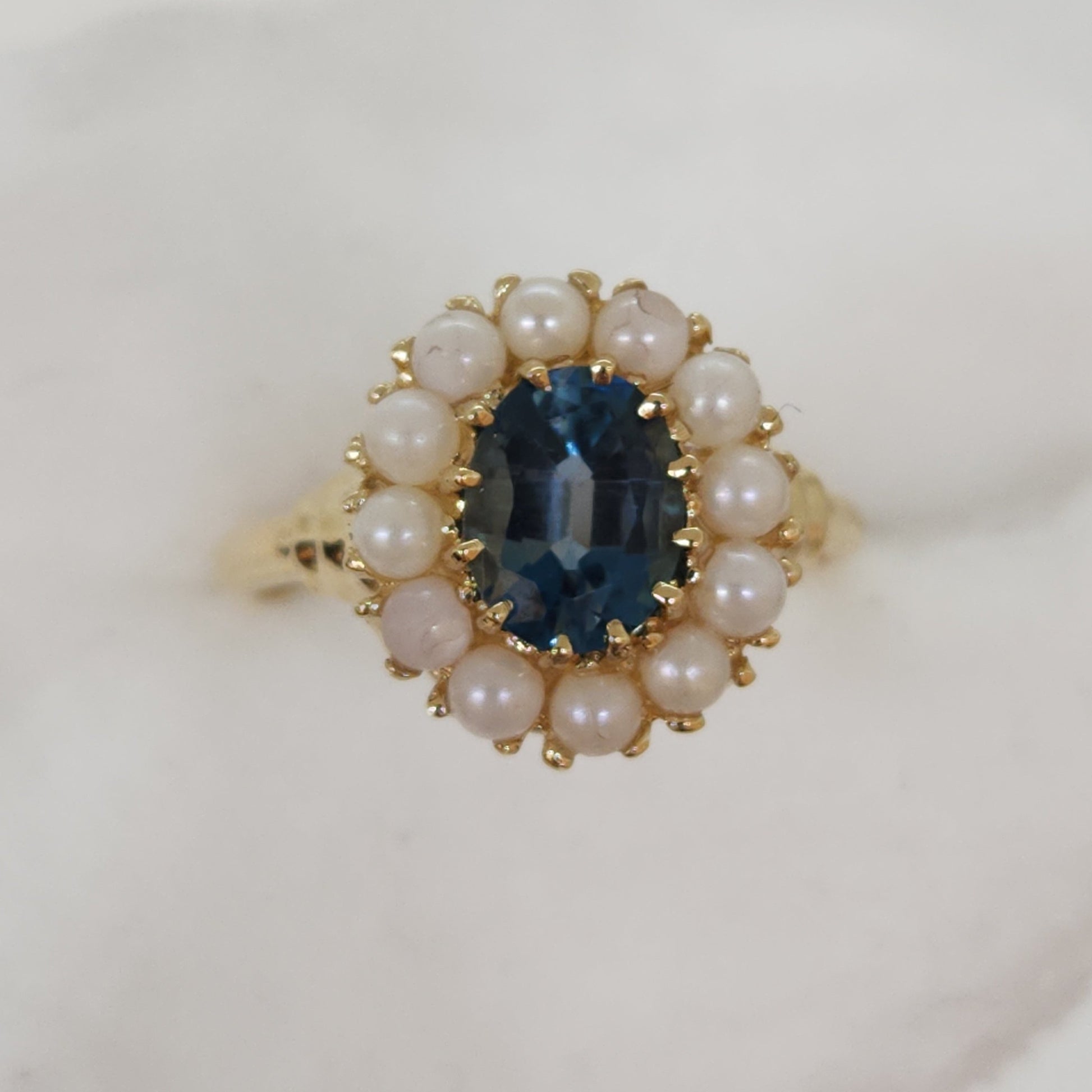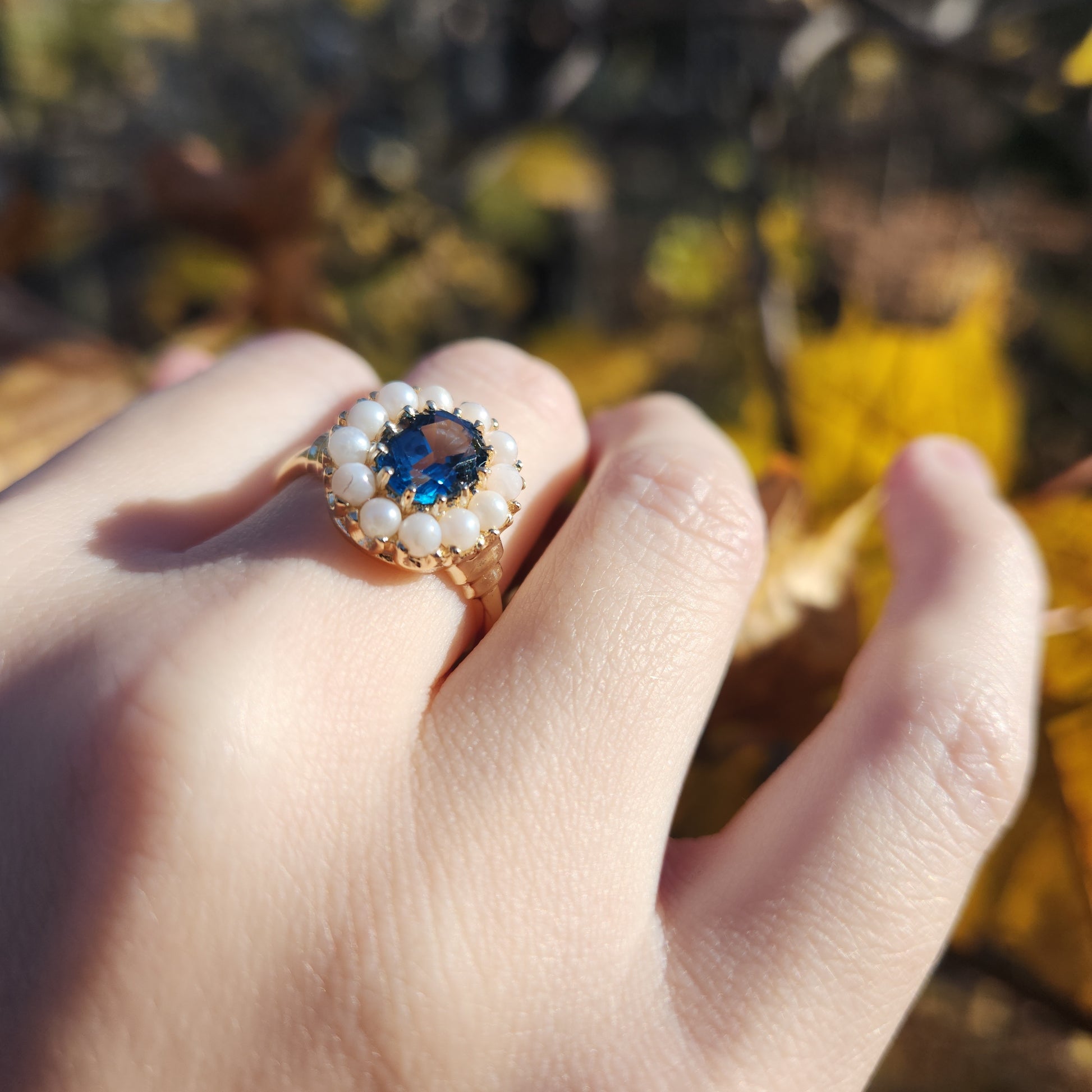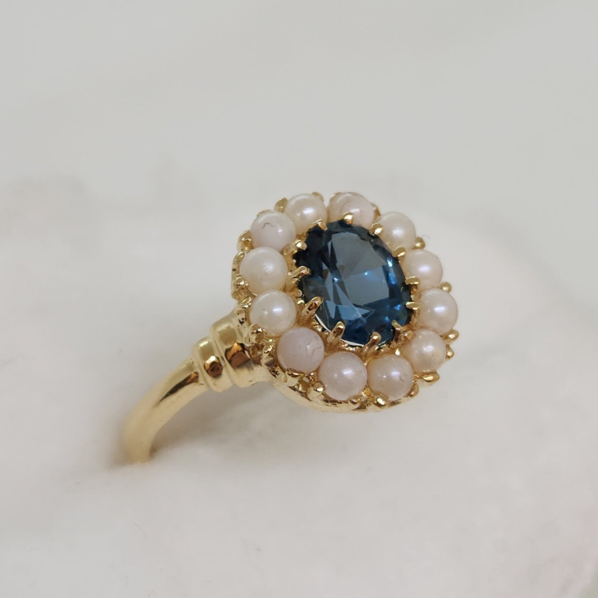 Blue topaz comes in three distinct shades of blue; Swiss Blue, Sky Blue and London Blue. The London Blue shade is a medium to dark blue that has an inky or steel-like appearance. Circa 80's, this beautiful gem has a halo of Akoya pearls and couldn't be more refined.