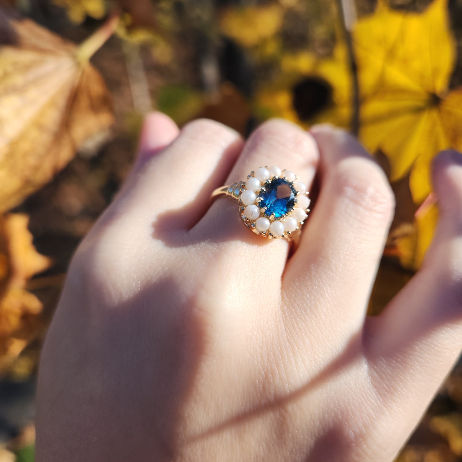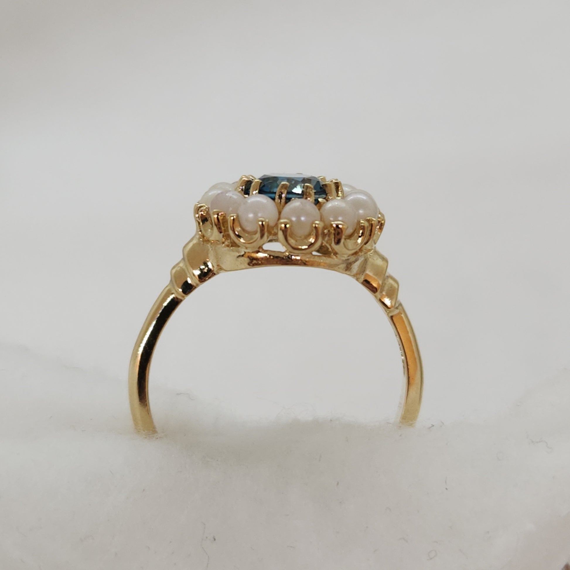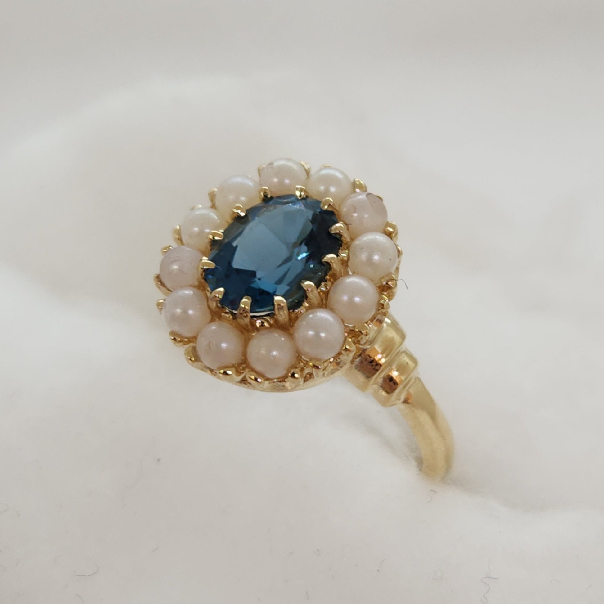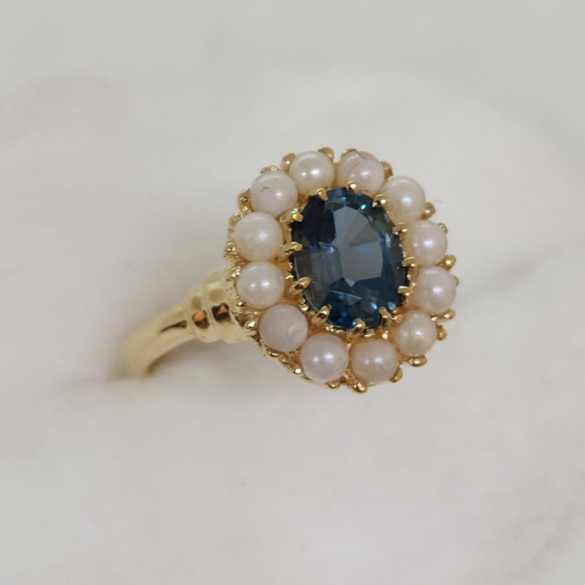 Blue topaz comes in three distinct shades of blue; Swiss Blue, Sky Blue and London Blue. The London Blue shade is a medium to dark blue that has an inky or steel-like appearance. Circa 80's, this beautiful gem has a halo of Akoya pearls and couldn't be more refined.