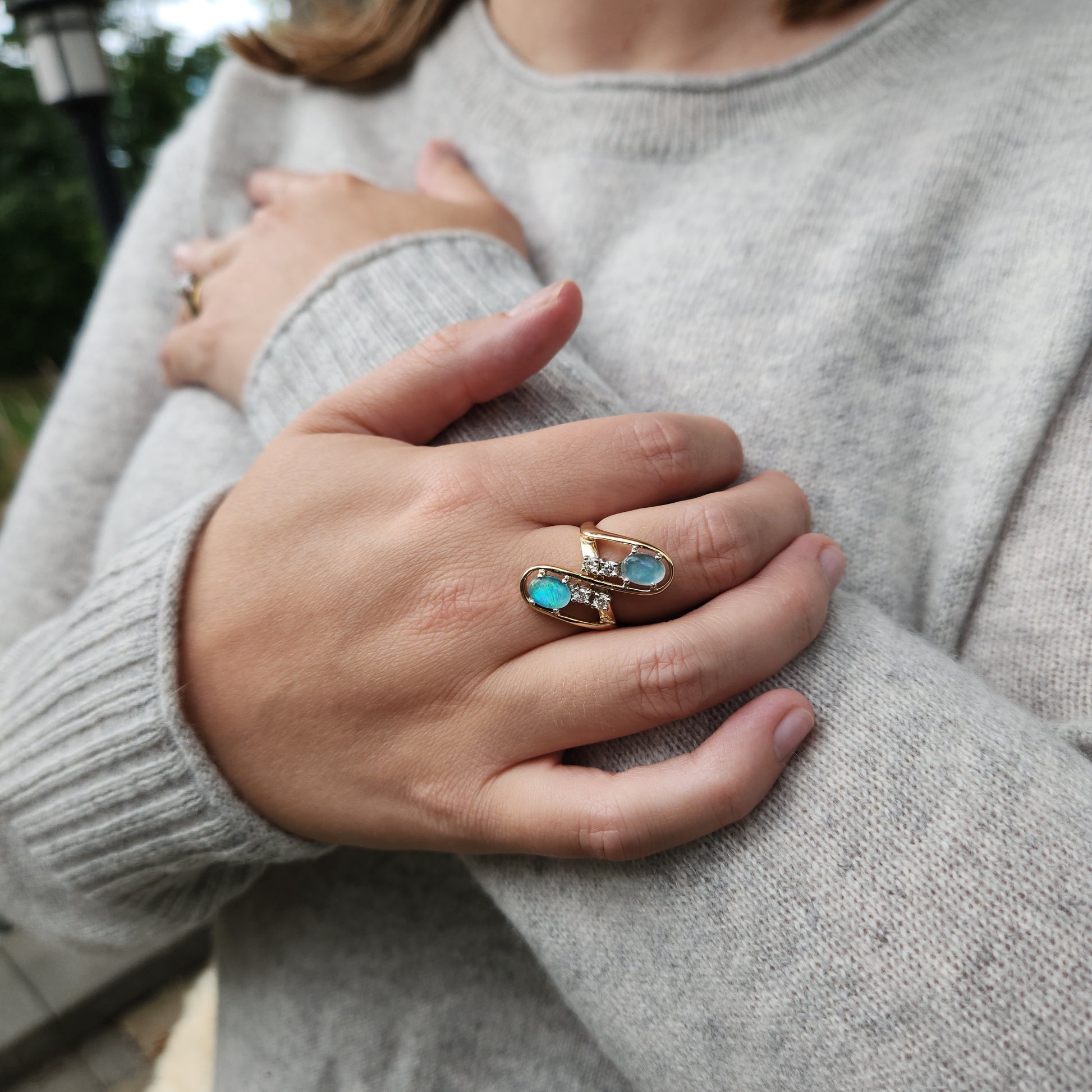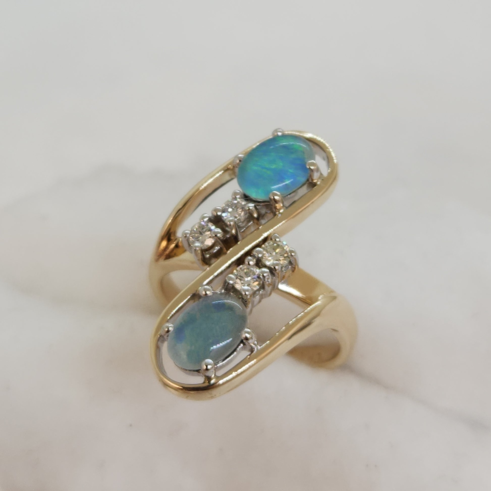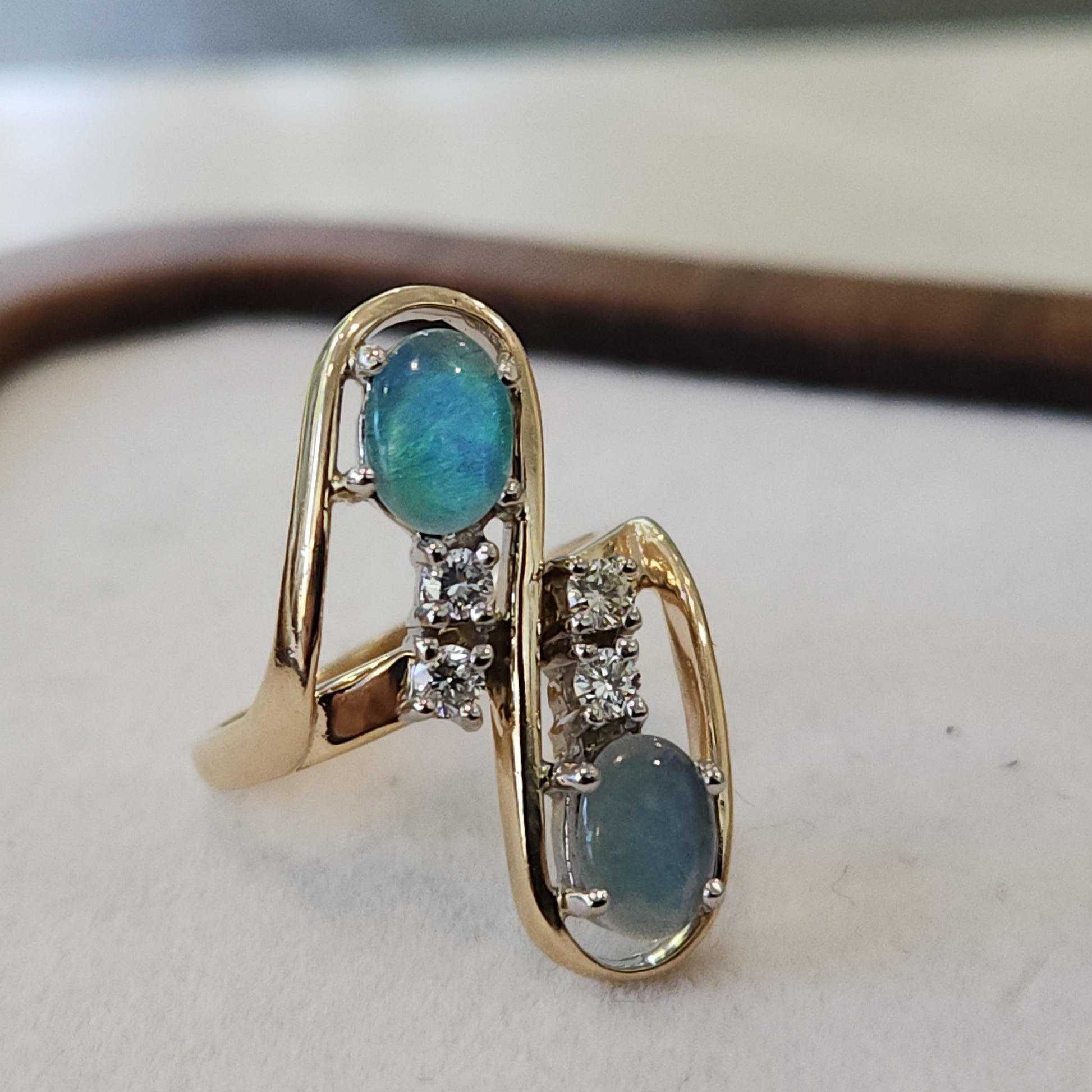Opposing opal triplets, each trailing a pair of sparkling diamonds. Talk about a unique design!