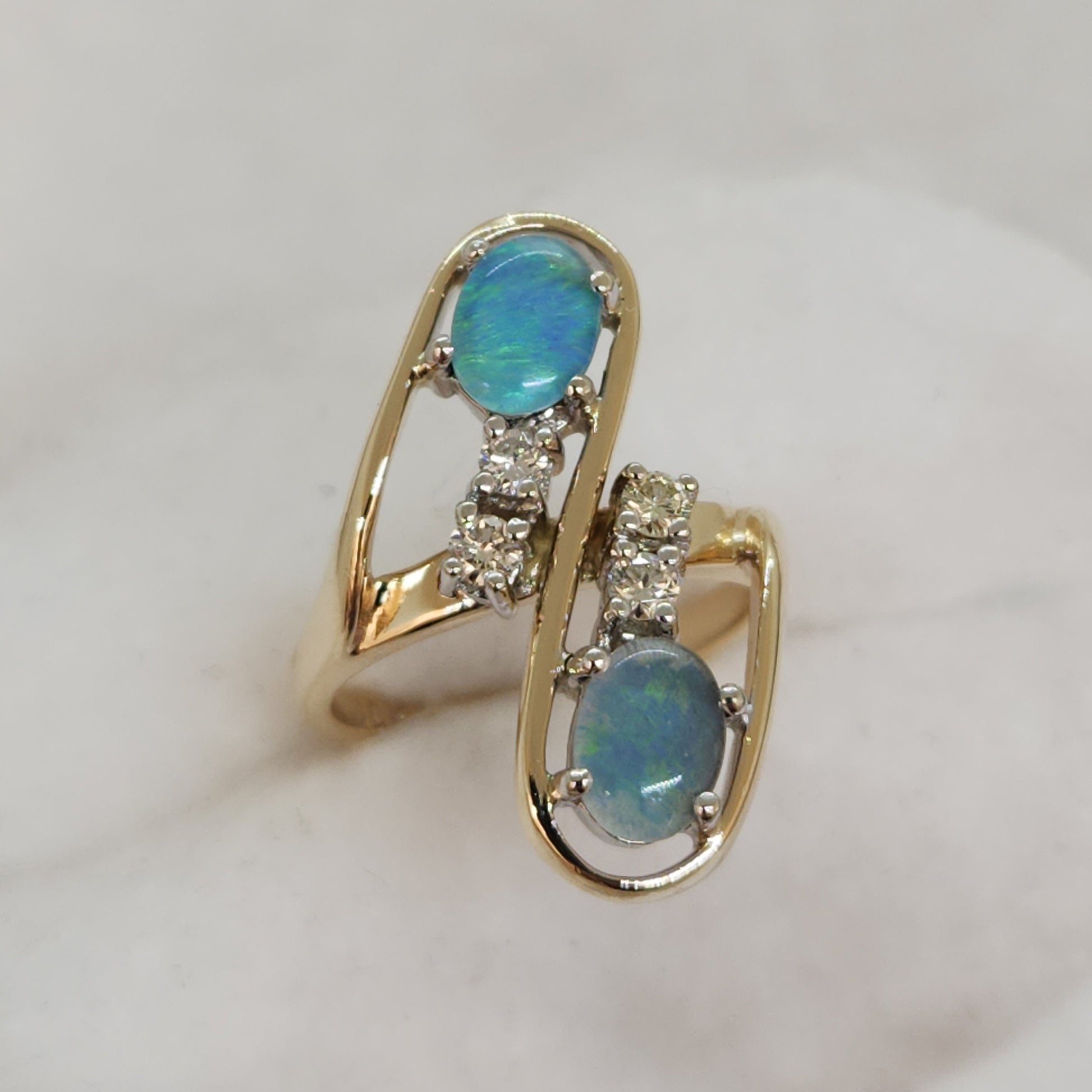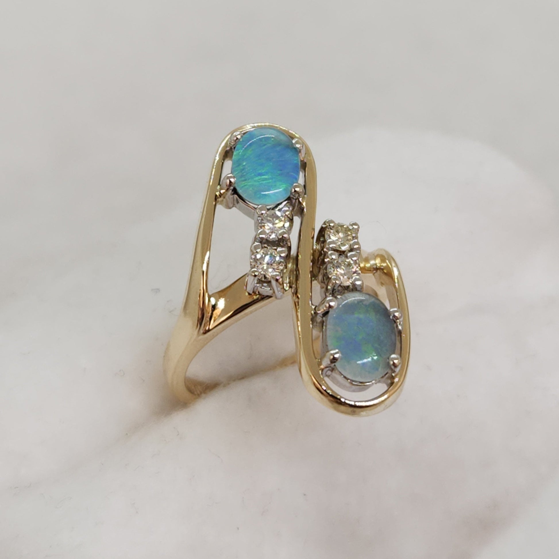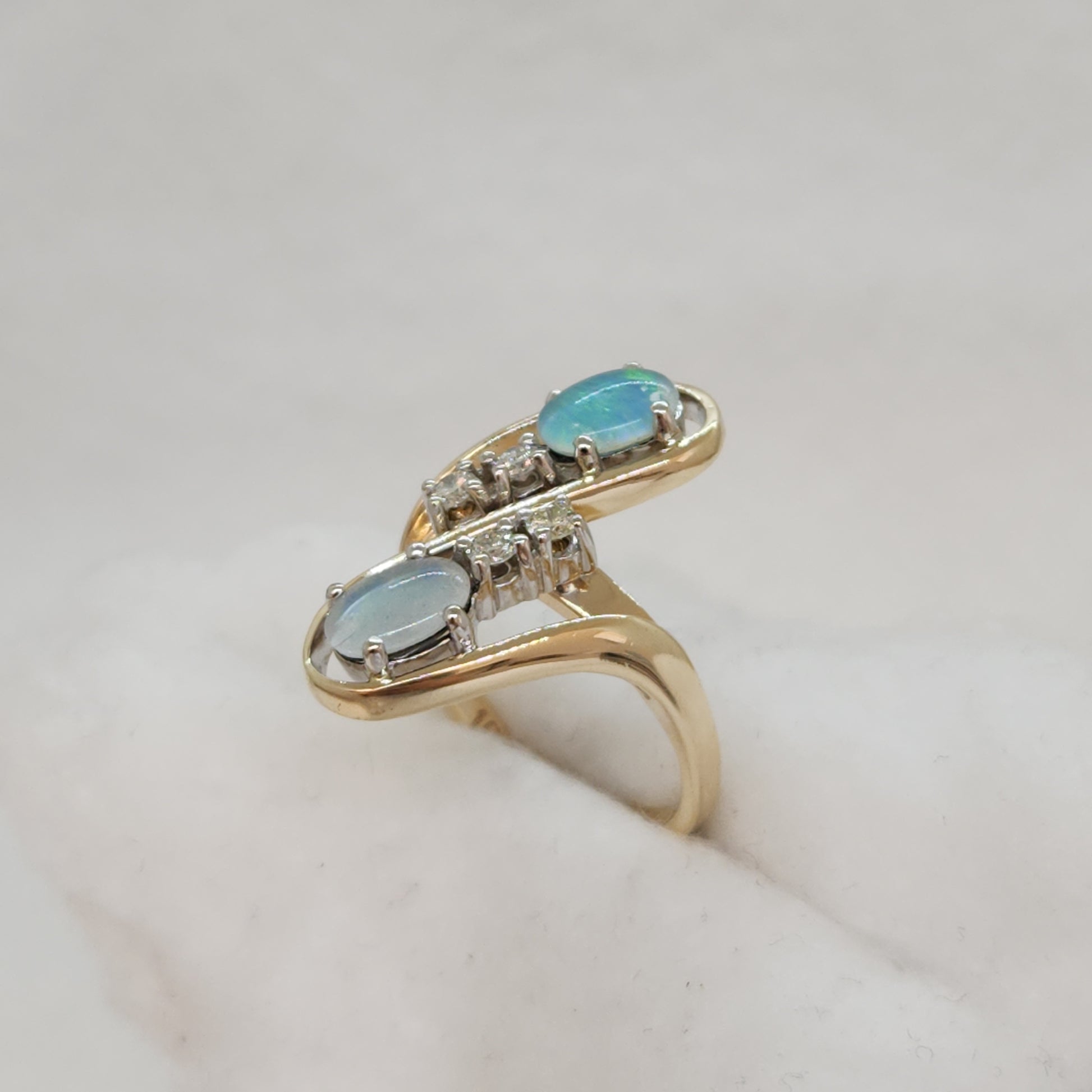 Opposing opal triplets, each trailing a pair of sparkling diamonds. Talk about a unique design!