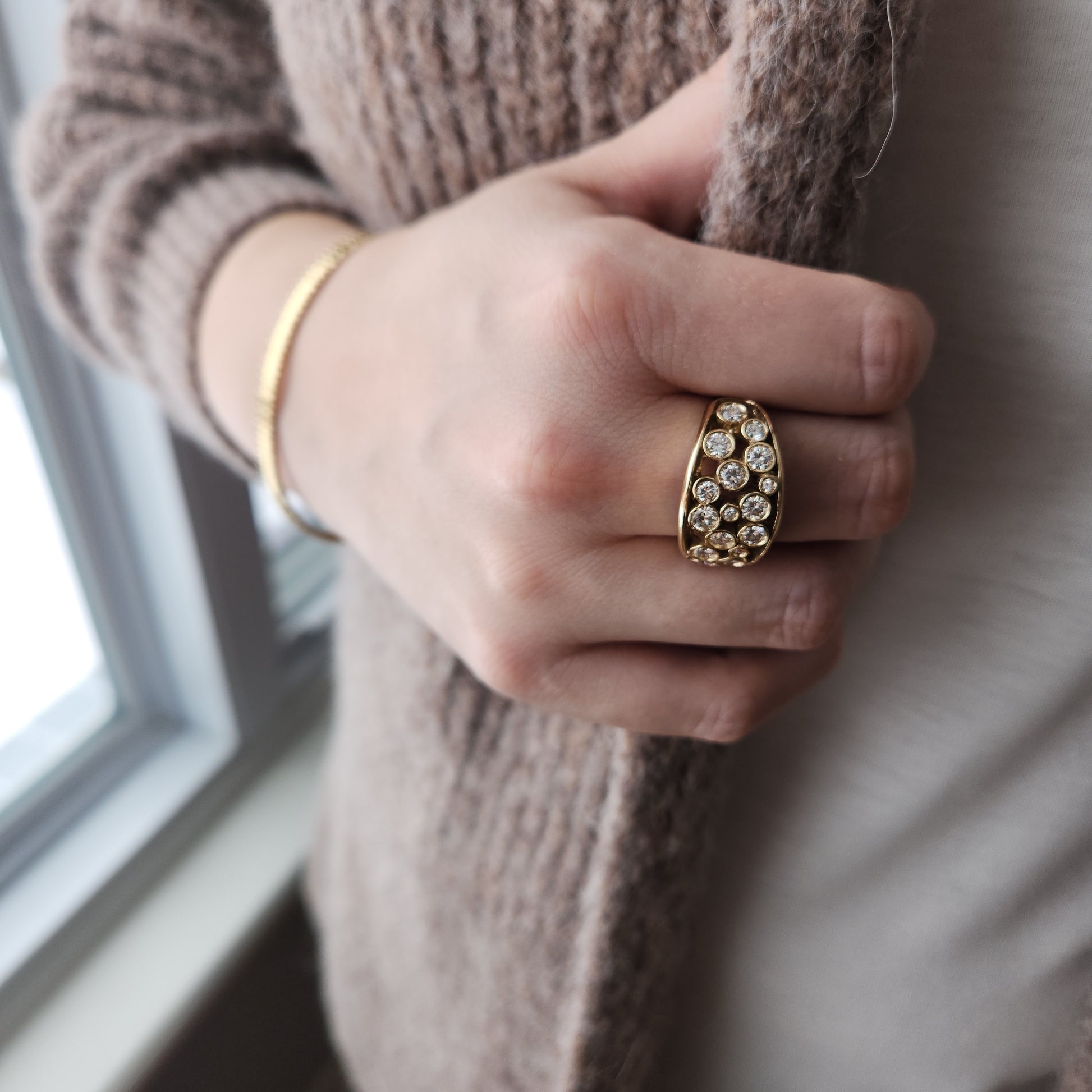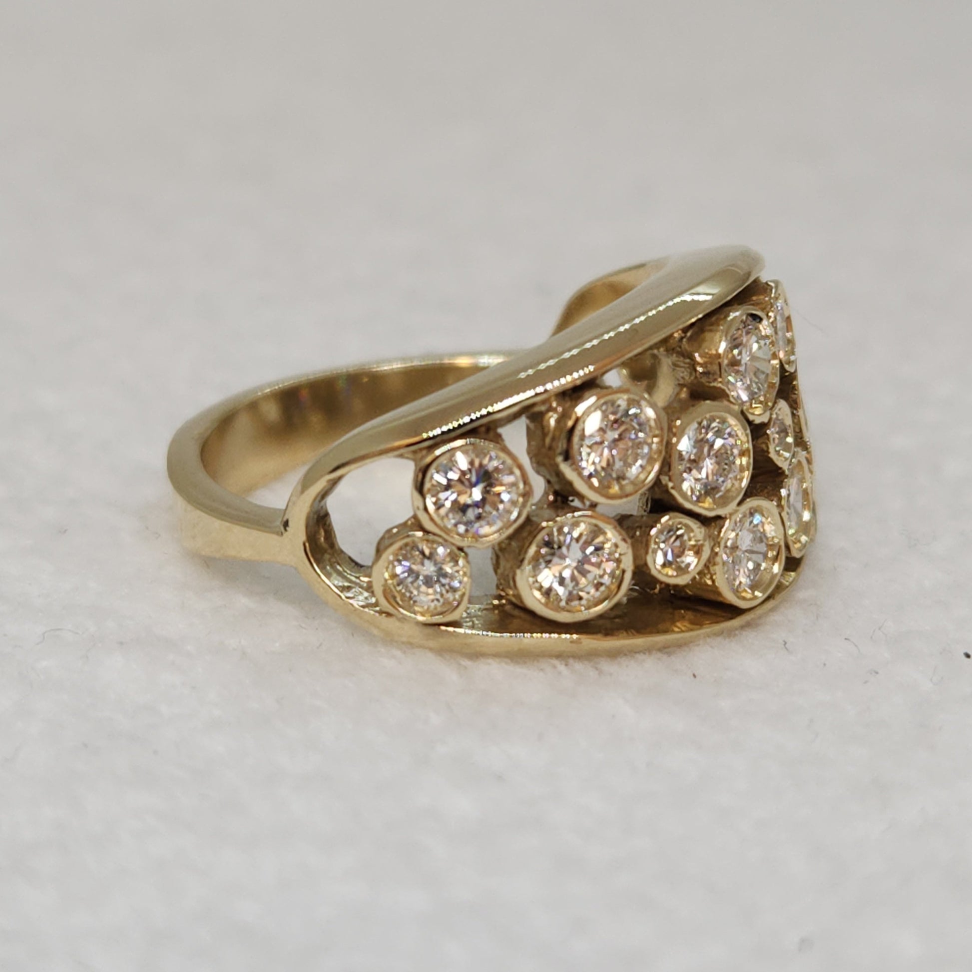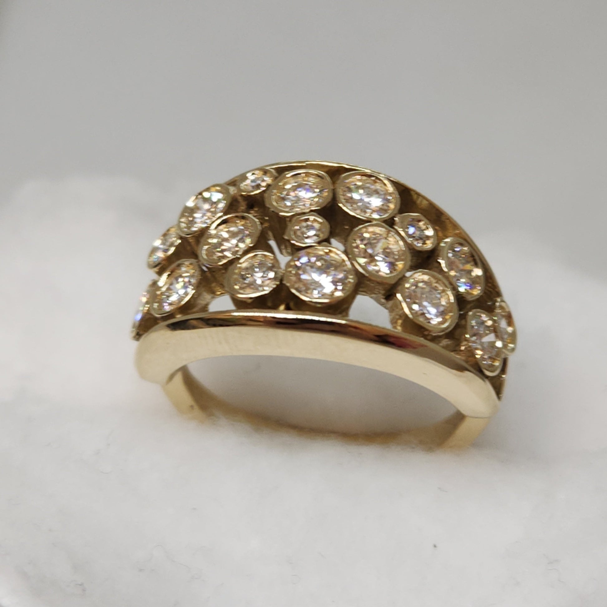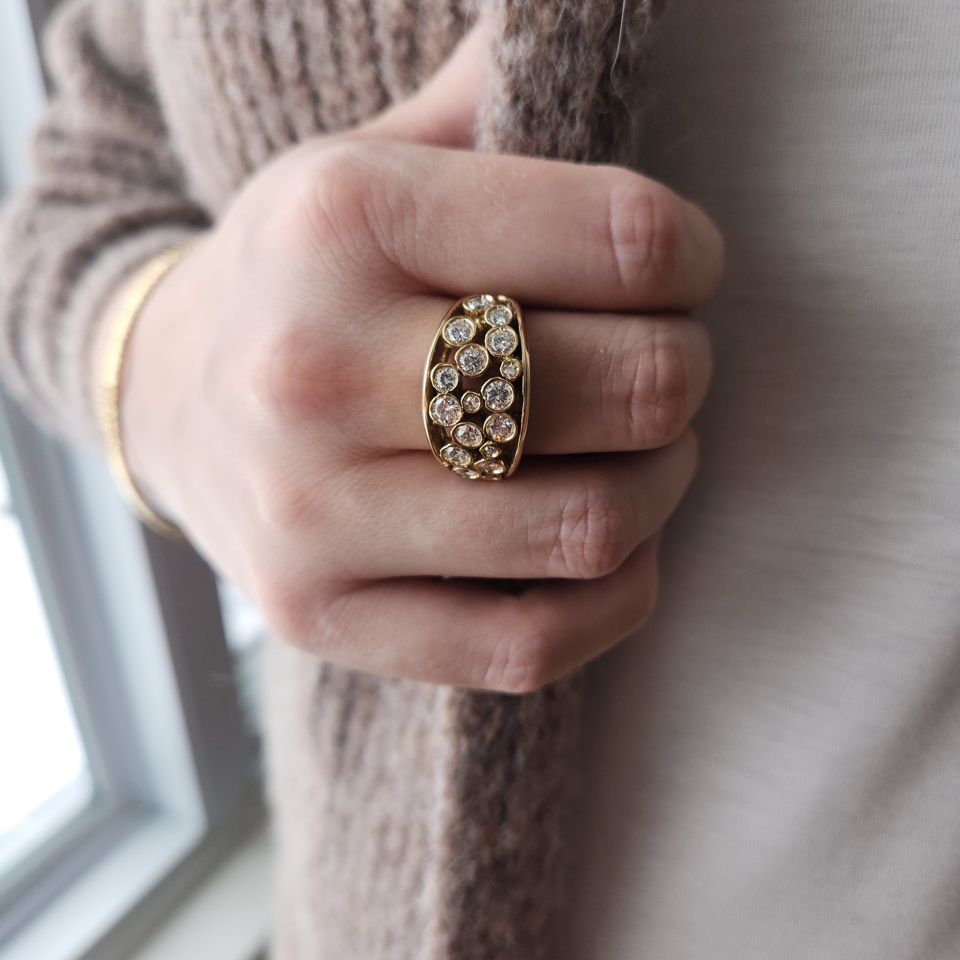 Give in to your inner magpie, this one is full of incontestable elegance. A starry night of sparkling diamonds, this is a one-of-a-kind creation made by Marilyn herself! A pairing of diamonds, in various sizes come together to create a band of sparkles across your finger. Comfortable to wear, you can make this your everyday statement piece.