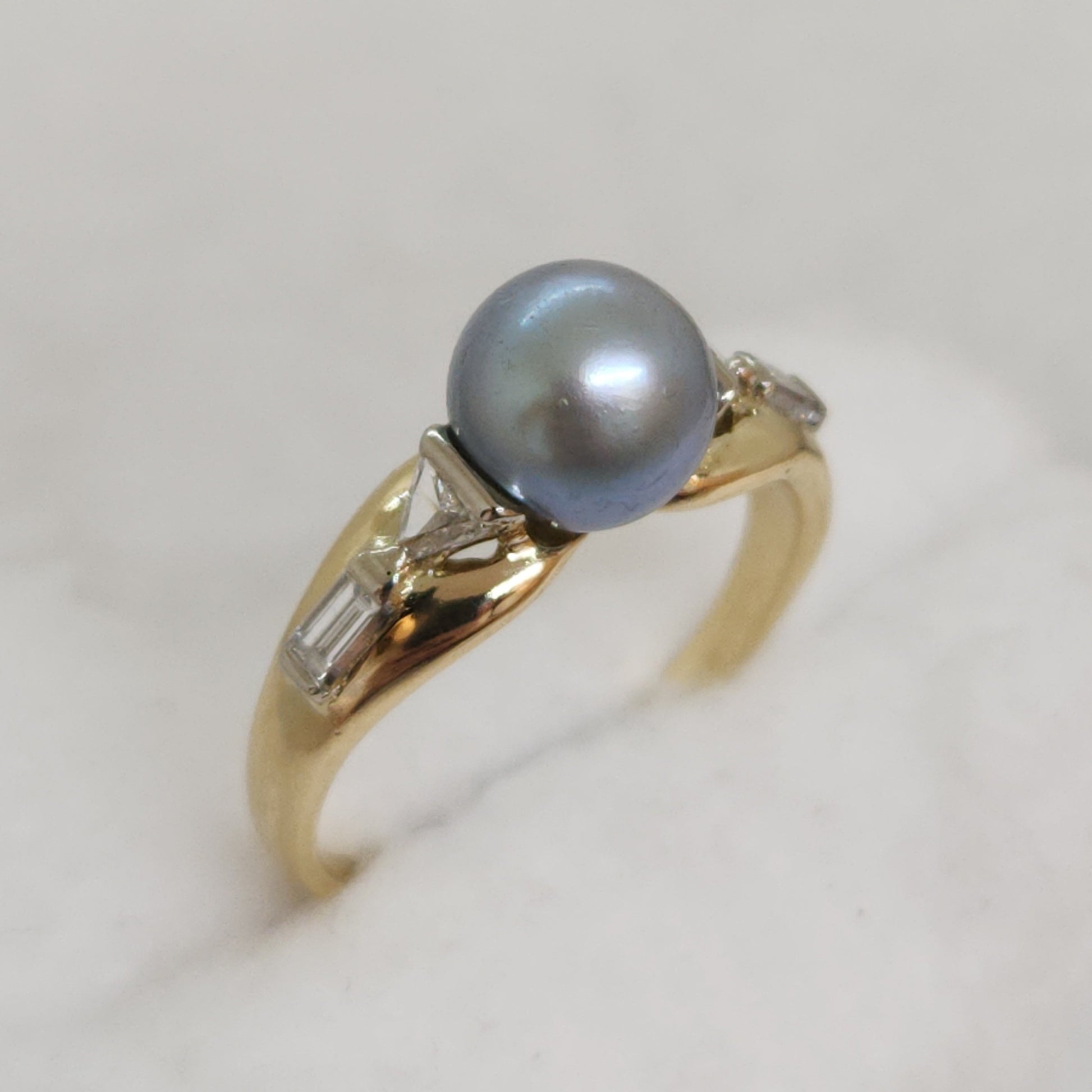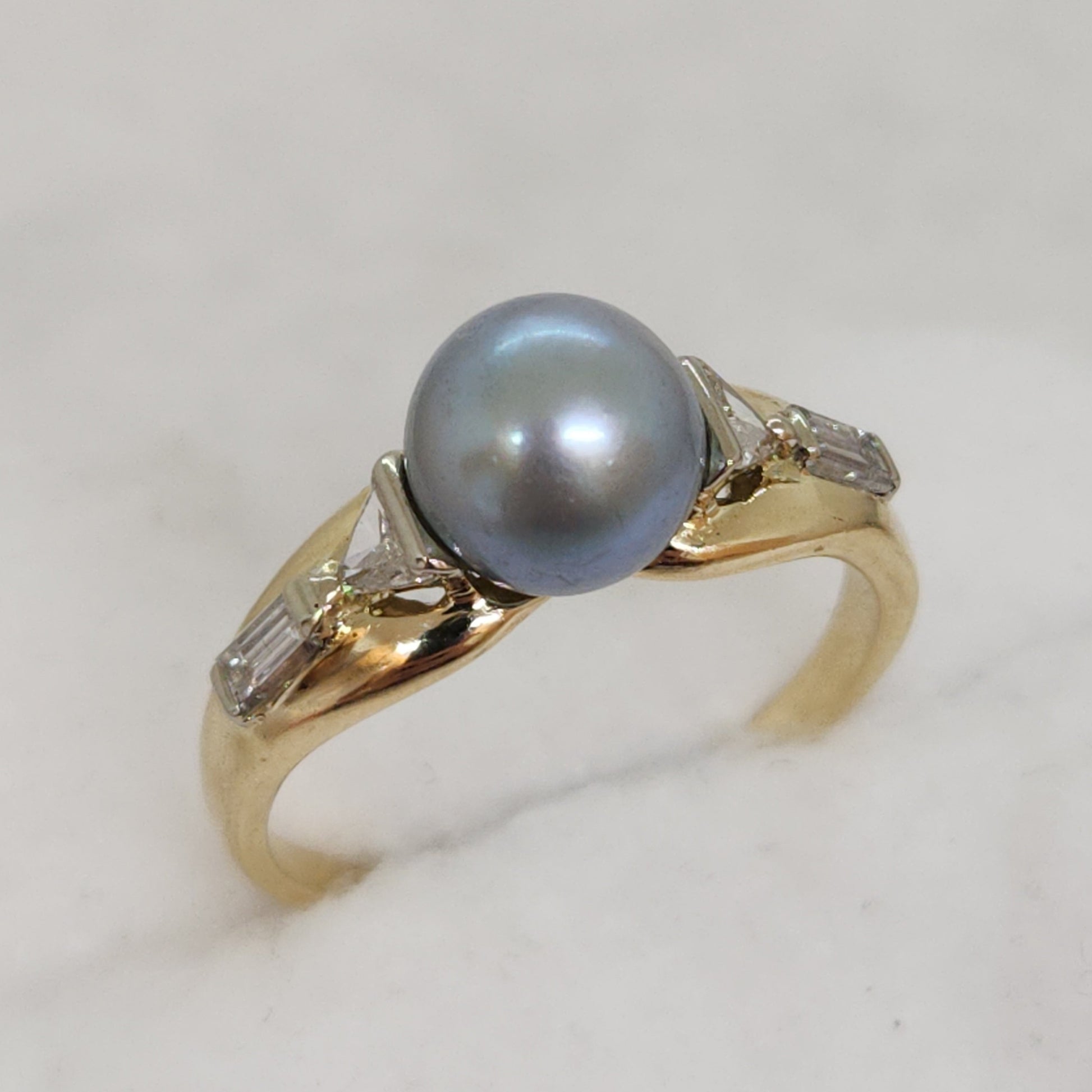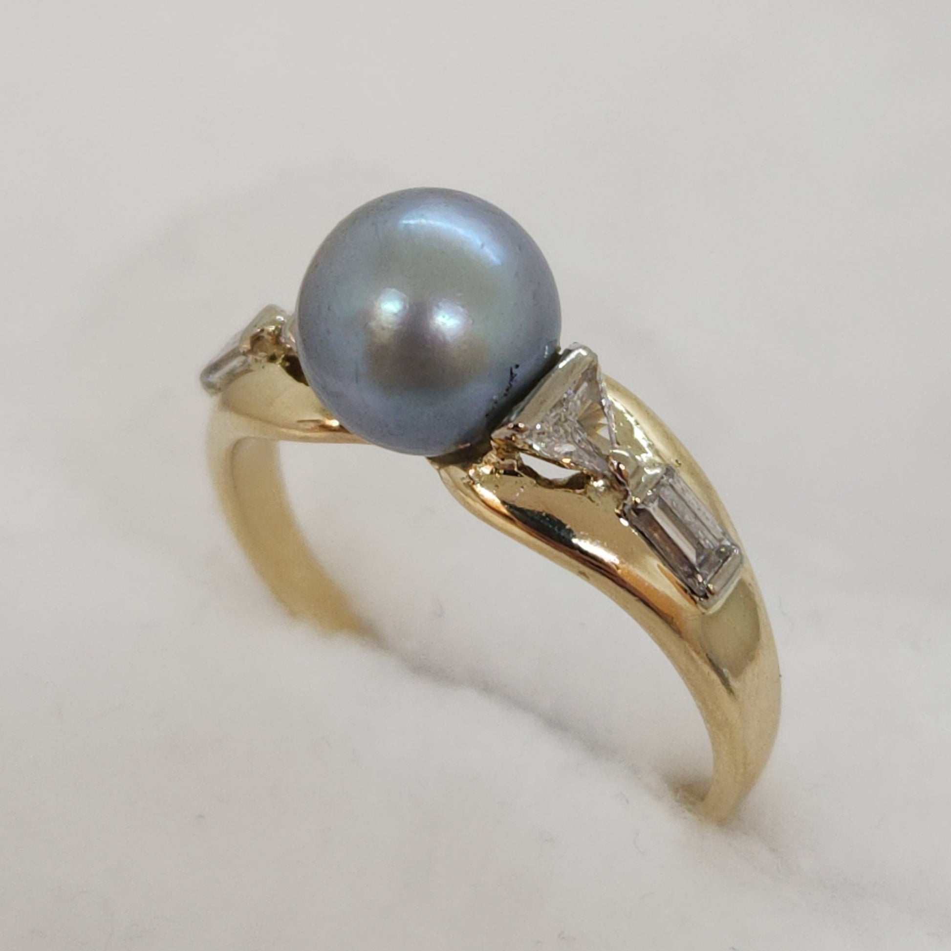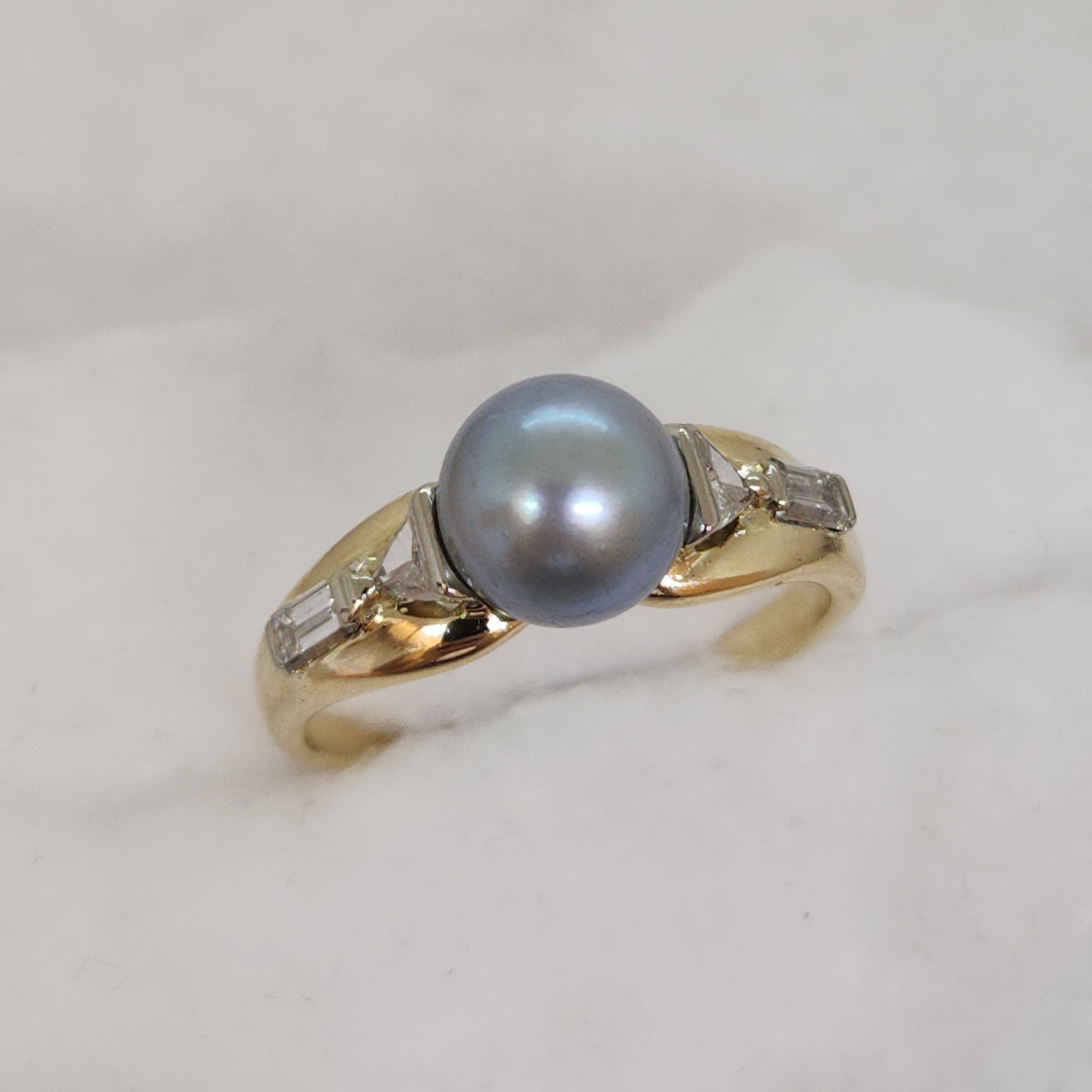 Perhaps the most exotic of all cultured pearls, the Tahitian pearl. Part of what makes these pearls special is their extra thick nacre, the coating that the oyster gives them. This specimen is a light steely blue-grey hue. And with such an interesting design combining diamonds in a triangle and baguette cuts, this is a stunner!