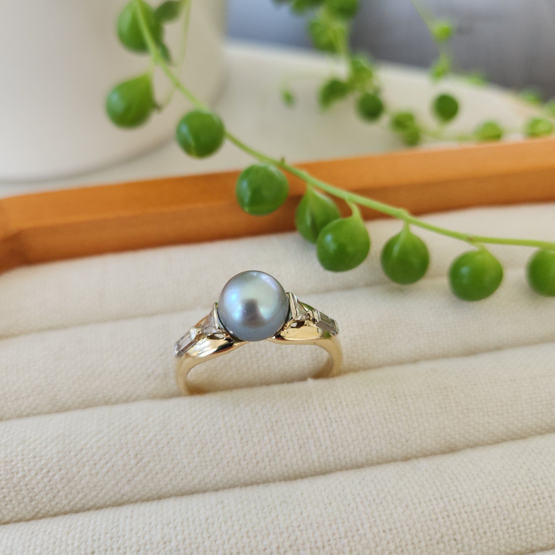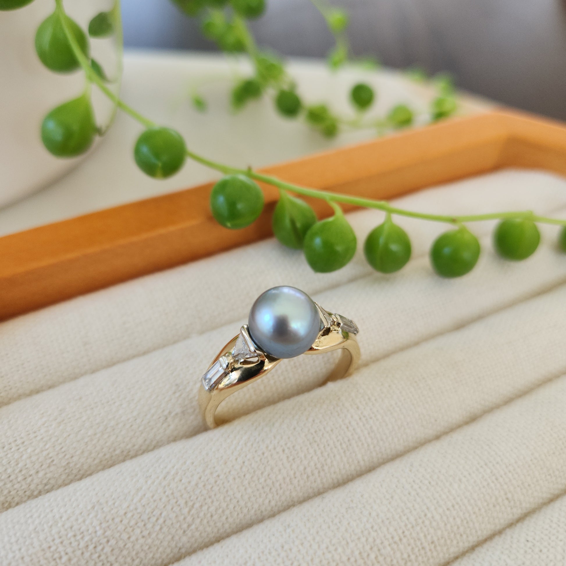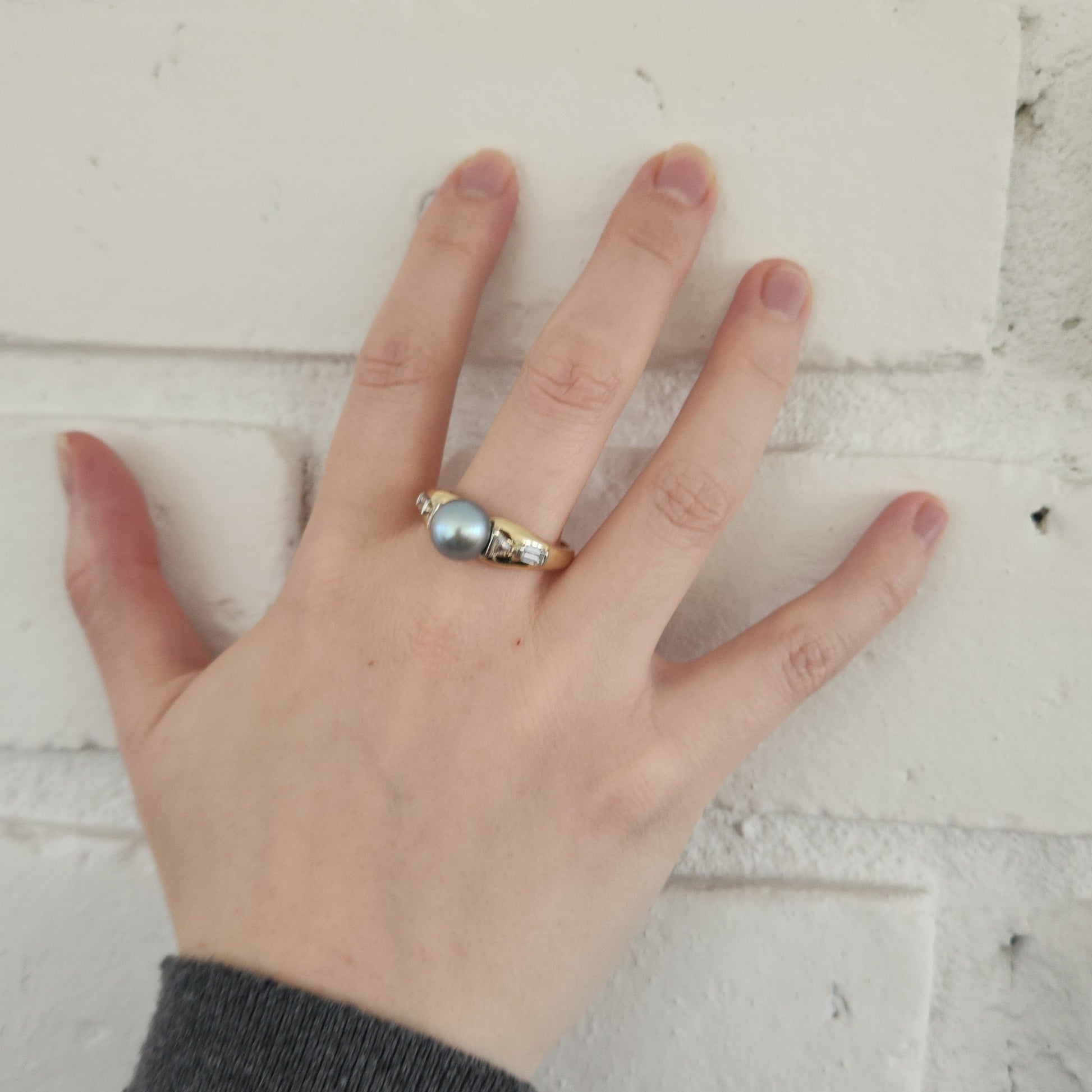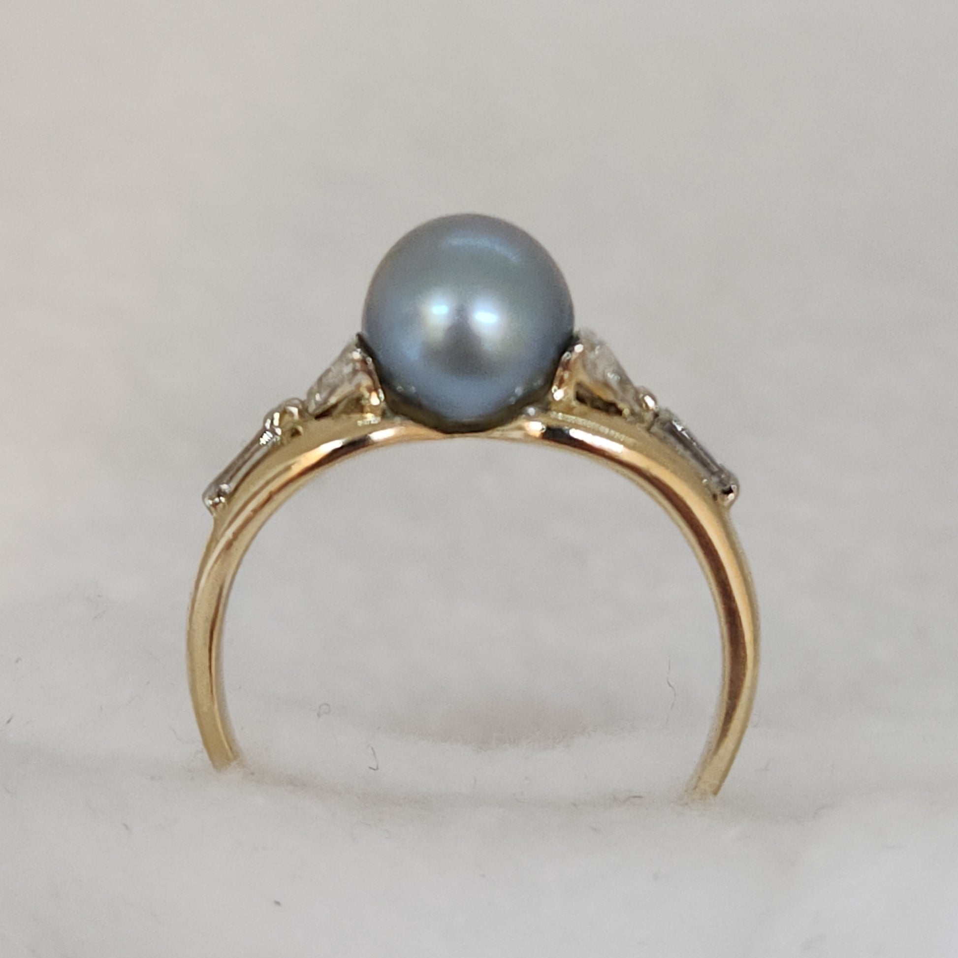 Perhaps the most exotic of all cultured pearls, the Tahitian pearl. Part of what makes these pearls special is their extra thick nacre, the coating that the oyster gives them. This specimen is a light steely blue-grey hue. And with such an interesting design combining diamonds in a triangle and baguette cuts, this is a stunner!