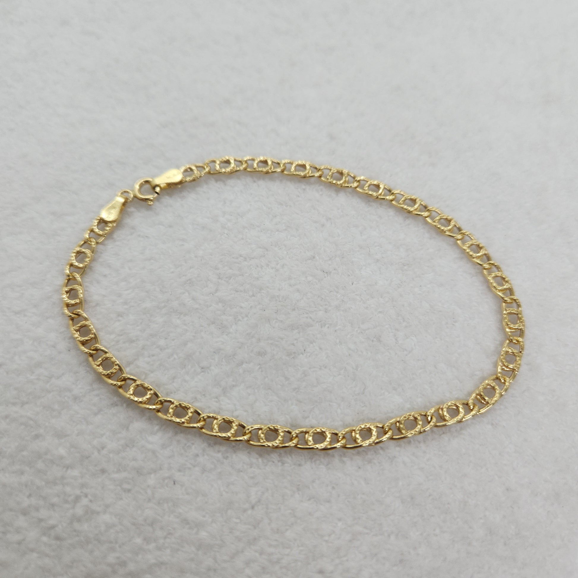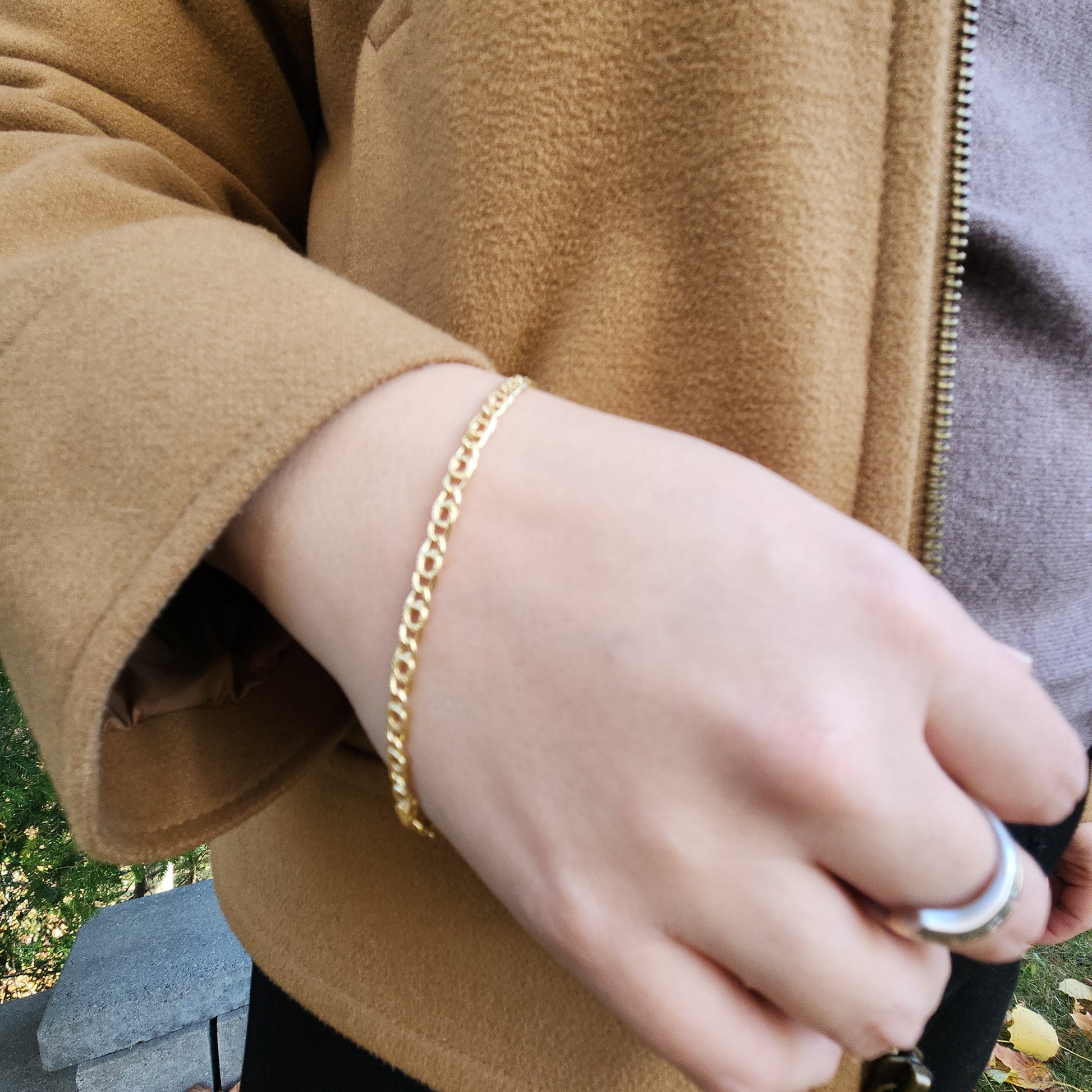 A twist on the traditional mariner style chain, we are loving the texture on these links. In rich and buttery 18k yellow gold, this bracelet just glows.