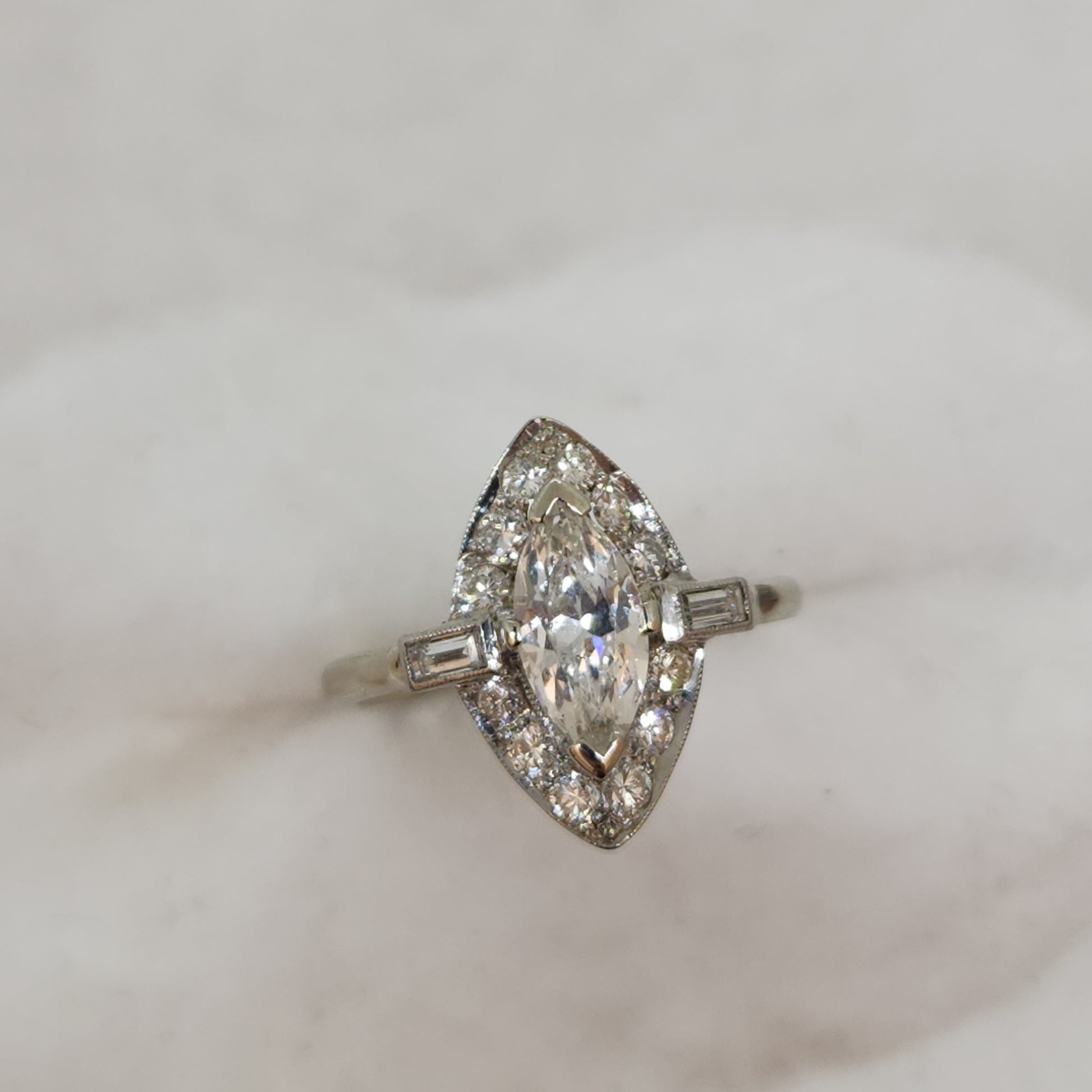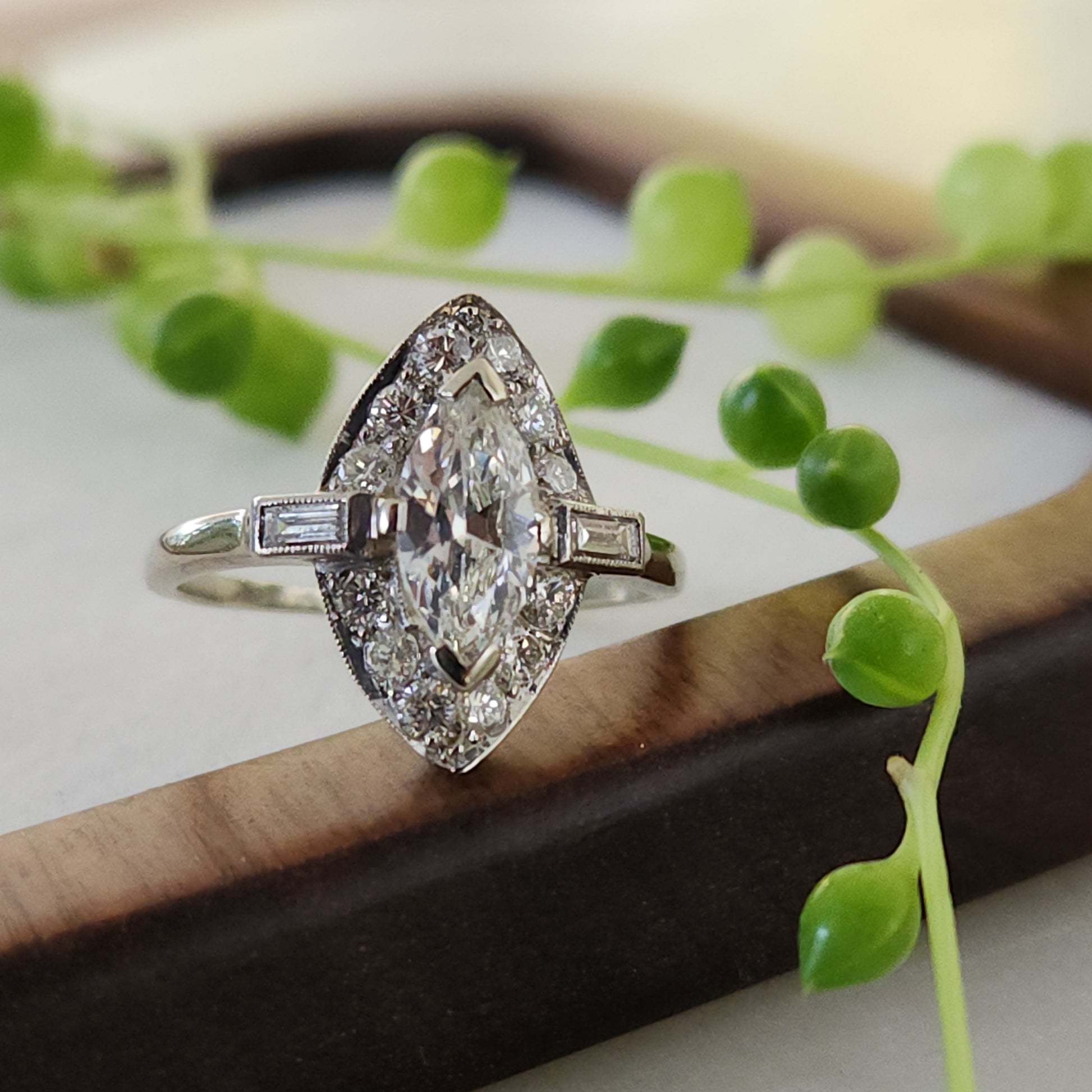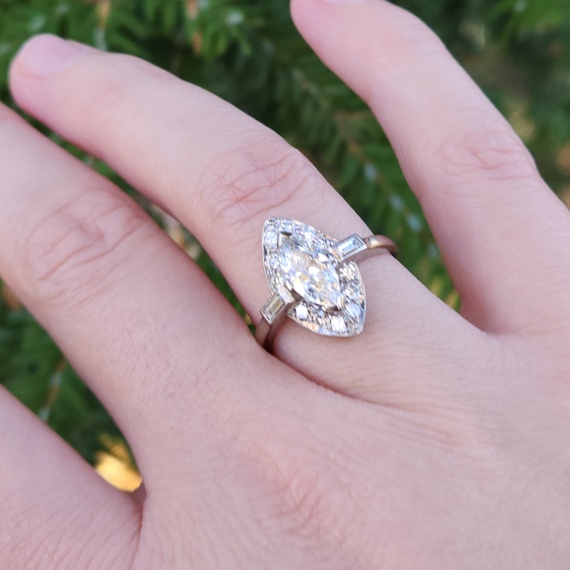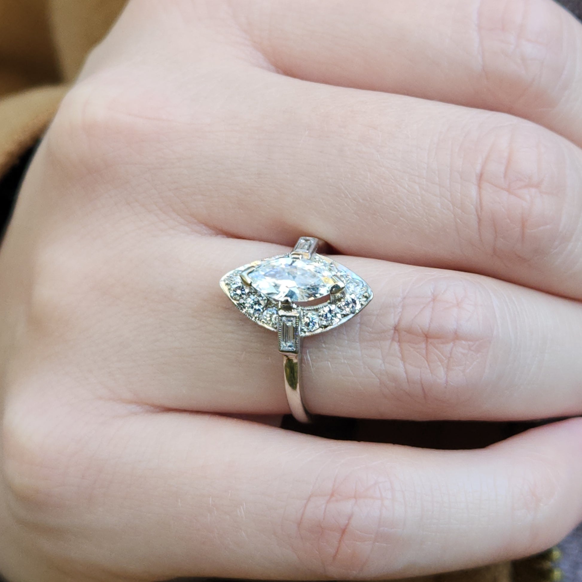 We are lovestruck. This is a handmade mounting circa the 1940's. We are getting Art Deco vibes and can't get over how striking this looks. The details were well thought through, the construction and design is admirable. We can see every stroke of the hand engraver creating the seats for these diamonds, the milligrain detail used on all the edges. She exudes the kind of effortlessness that are coveted by style mavens!