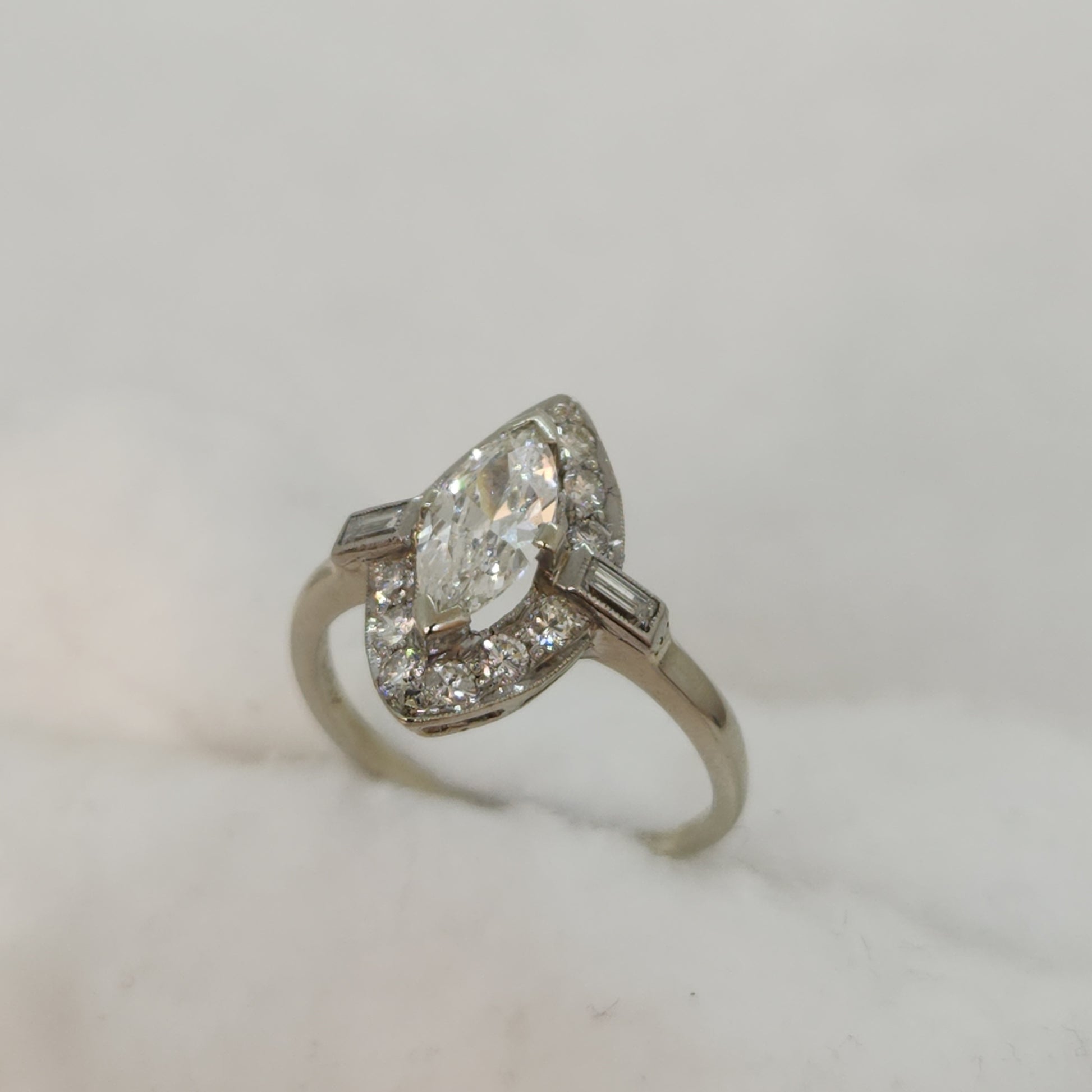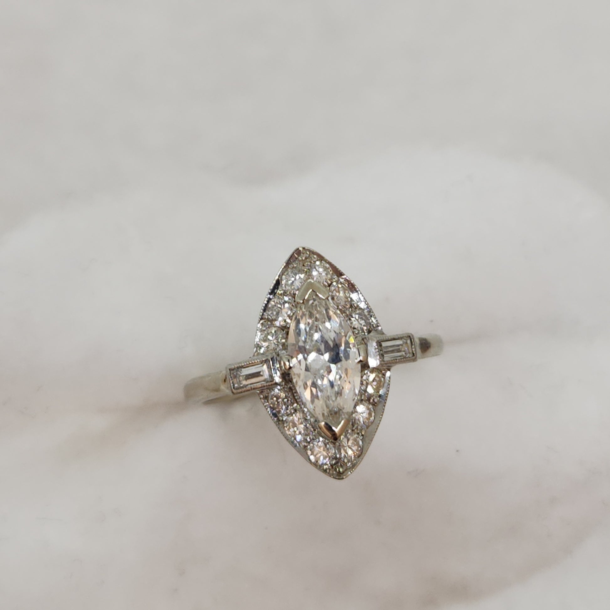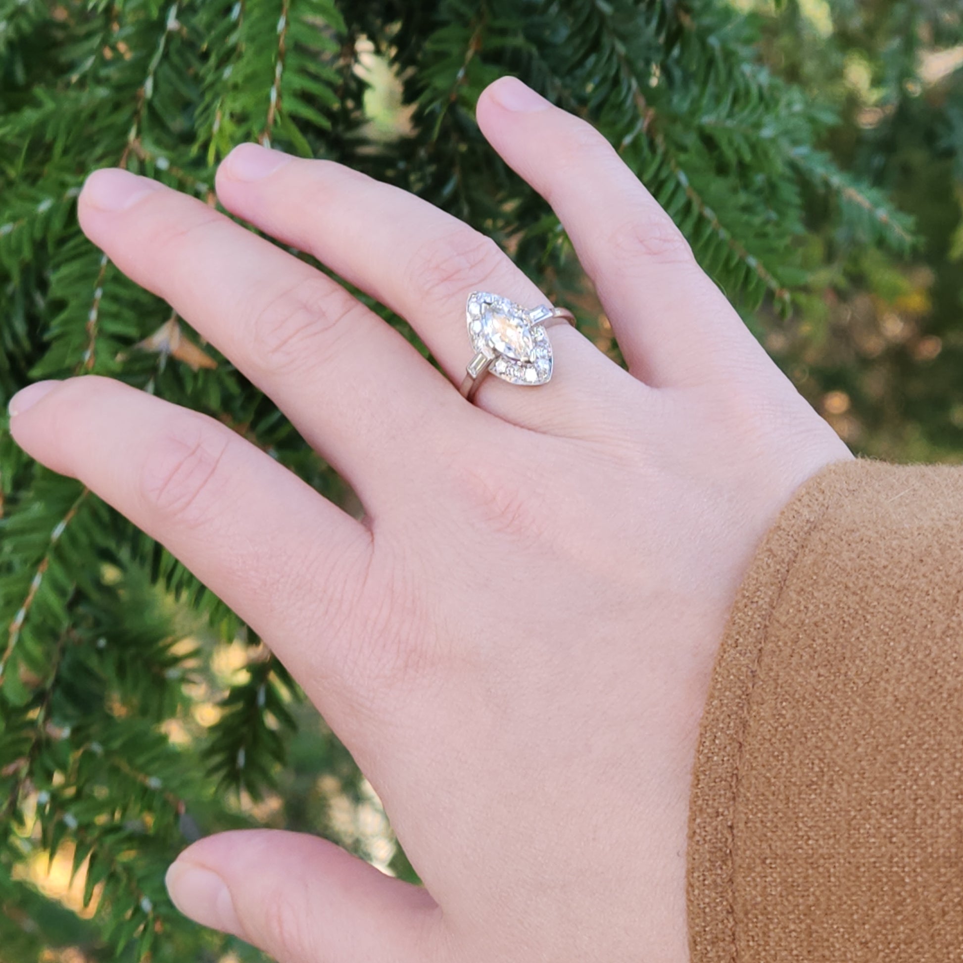We are lovestruck. This is a handmade mounting circa the 1940's. We are getting Art Deco vibes and can't get over how striking this looks. The details were well thought through, the construction and design is admirable. We can see every stroke of the hand engraver creating the seats for these diamonds, the milligrain detail used on all the edges. She exudes the kind of effortlessness that are coveted by style mavens!