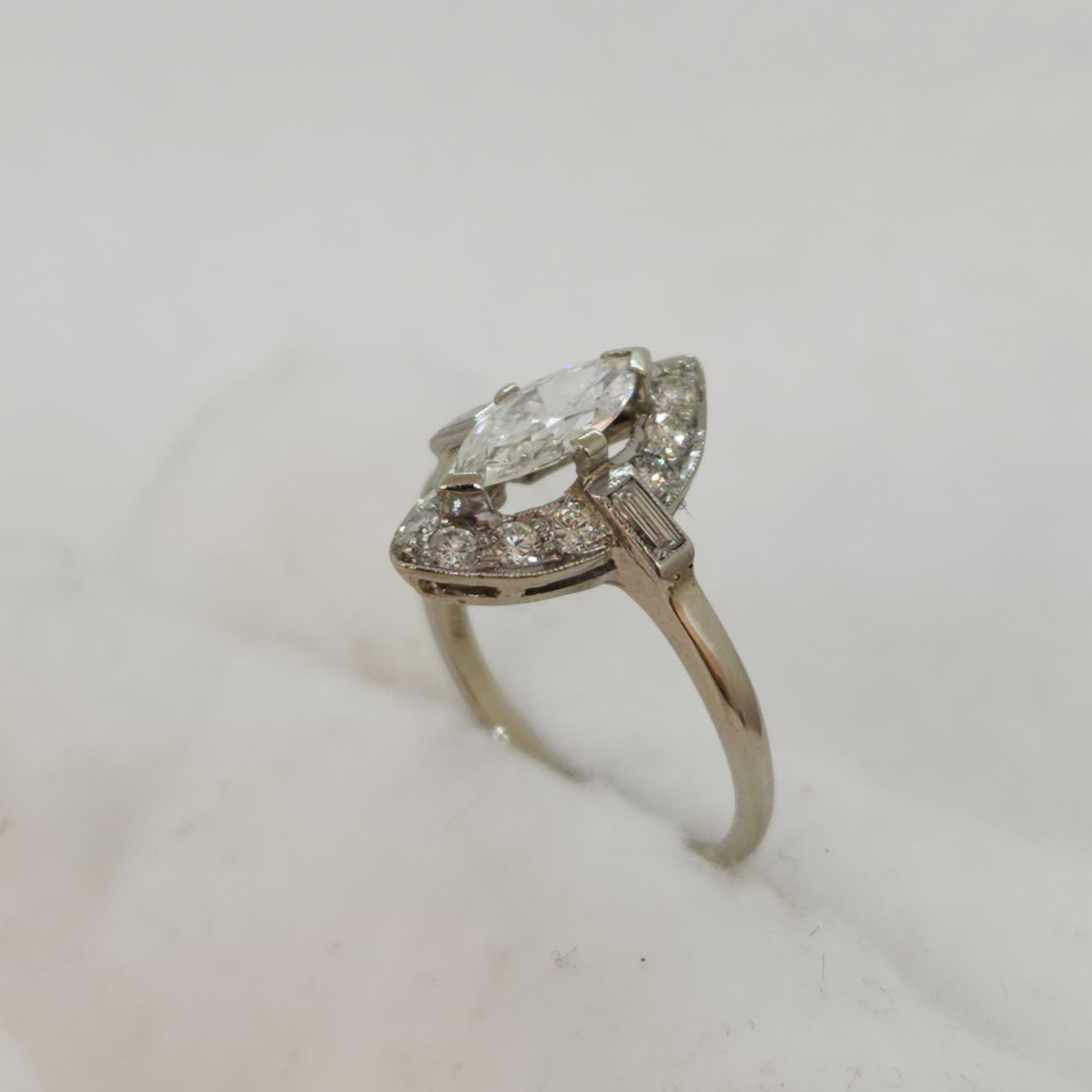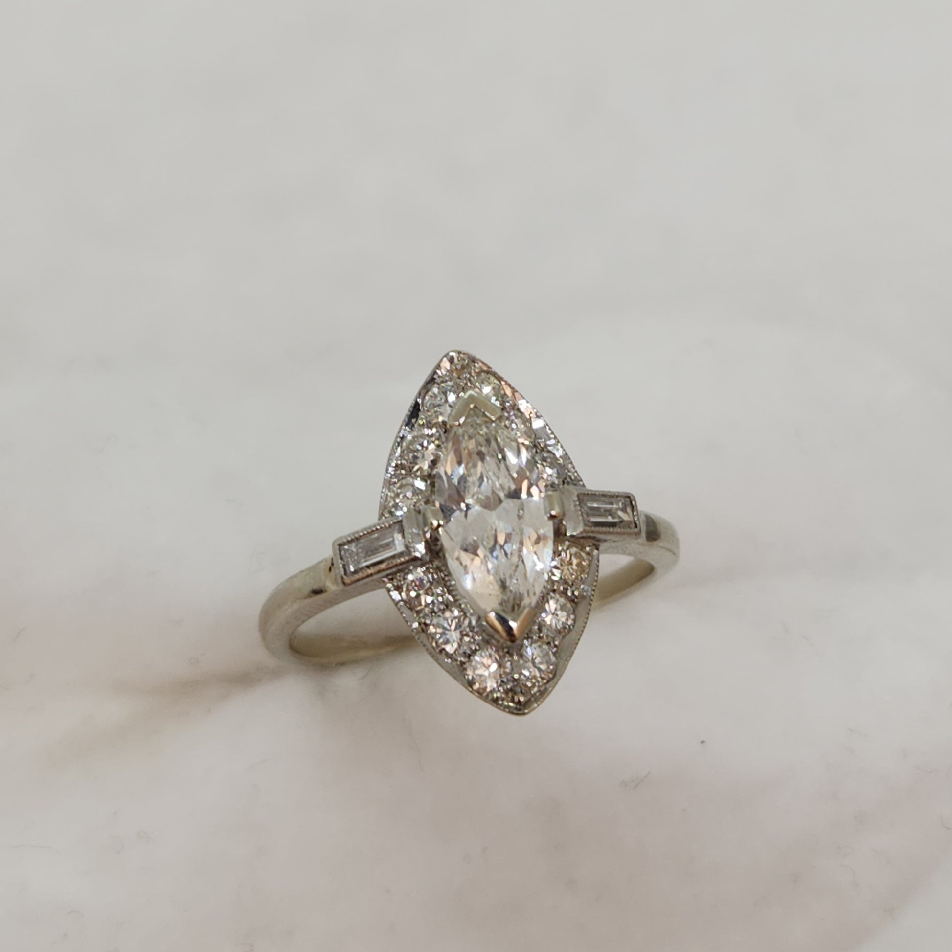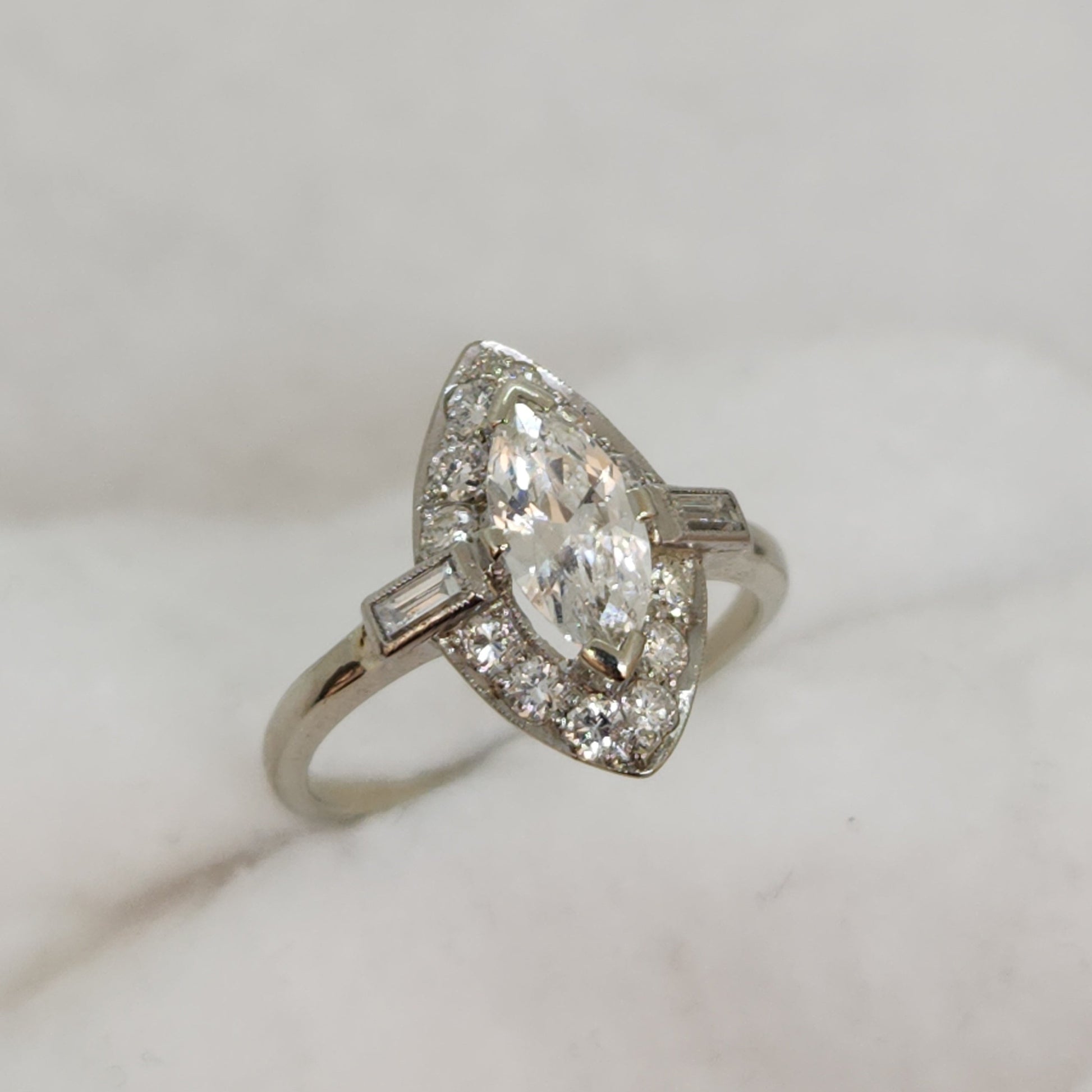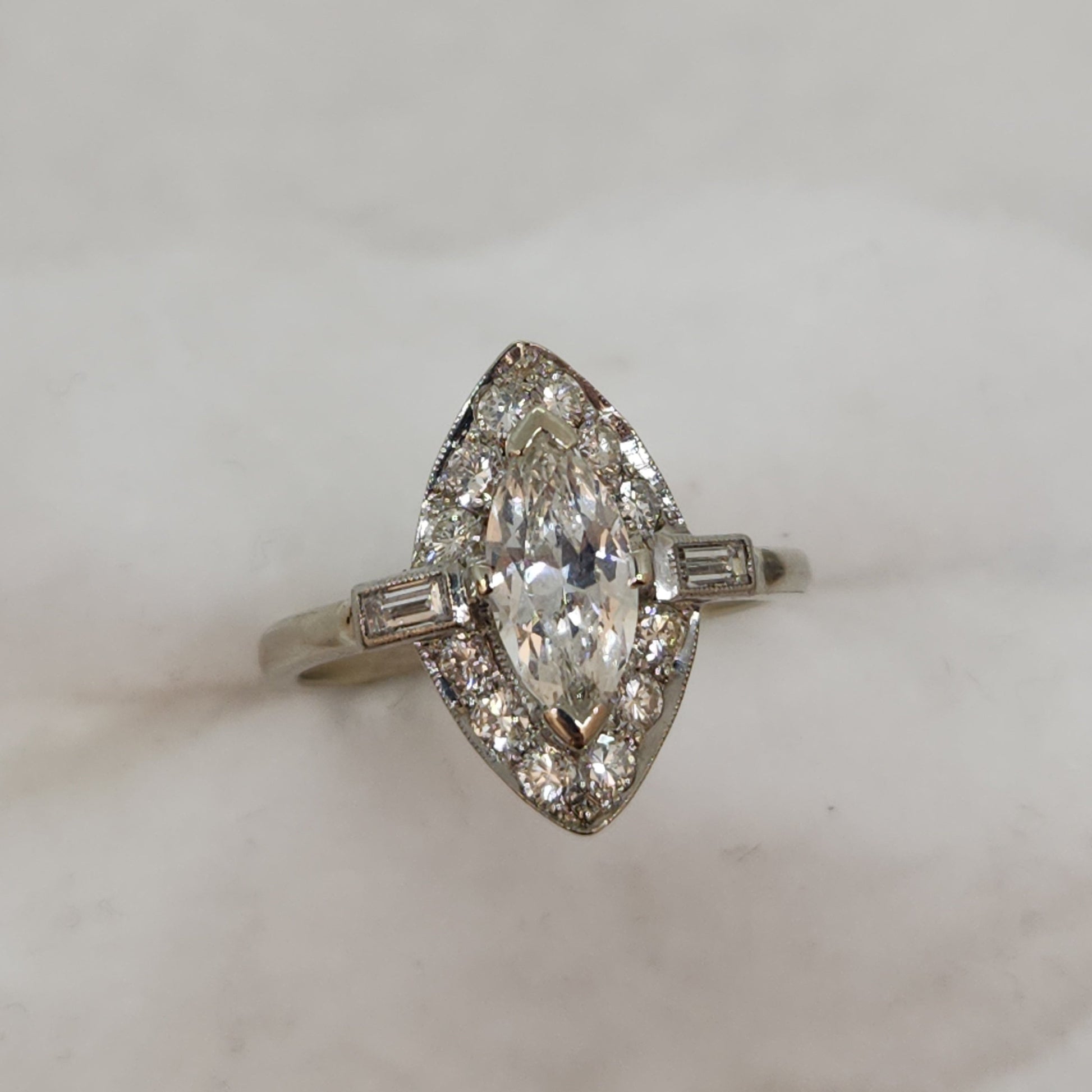 We are lovestruck. This is a handmade mounting circa the 1940's. We are getting Art Deco vibes and can't get over how striking this looks. The details were well thought through, the construction and design is admirable. We can see every stroke of the hand engraver creating the seats for these diamonds, the milligrain detail used on all the edges. She exudes the kind of effortlessness that are coveted by style mavens!
