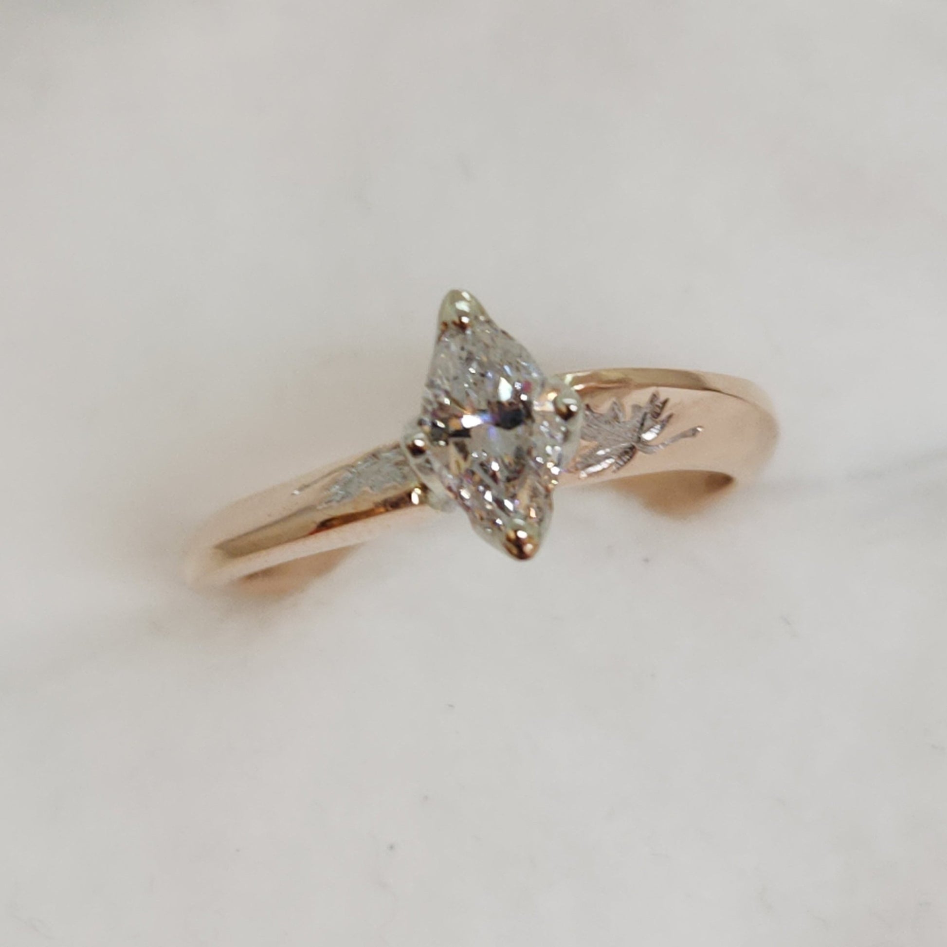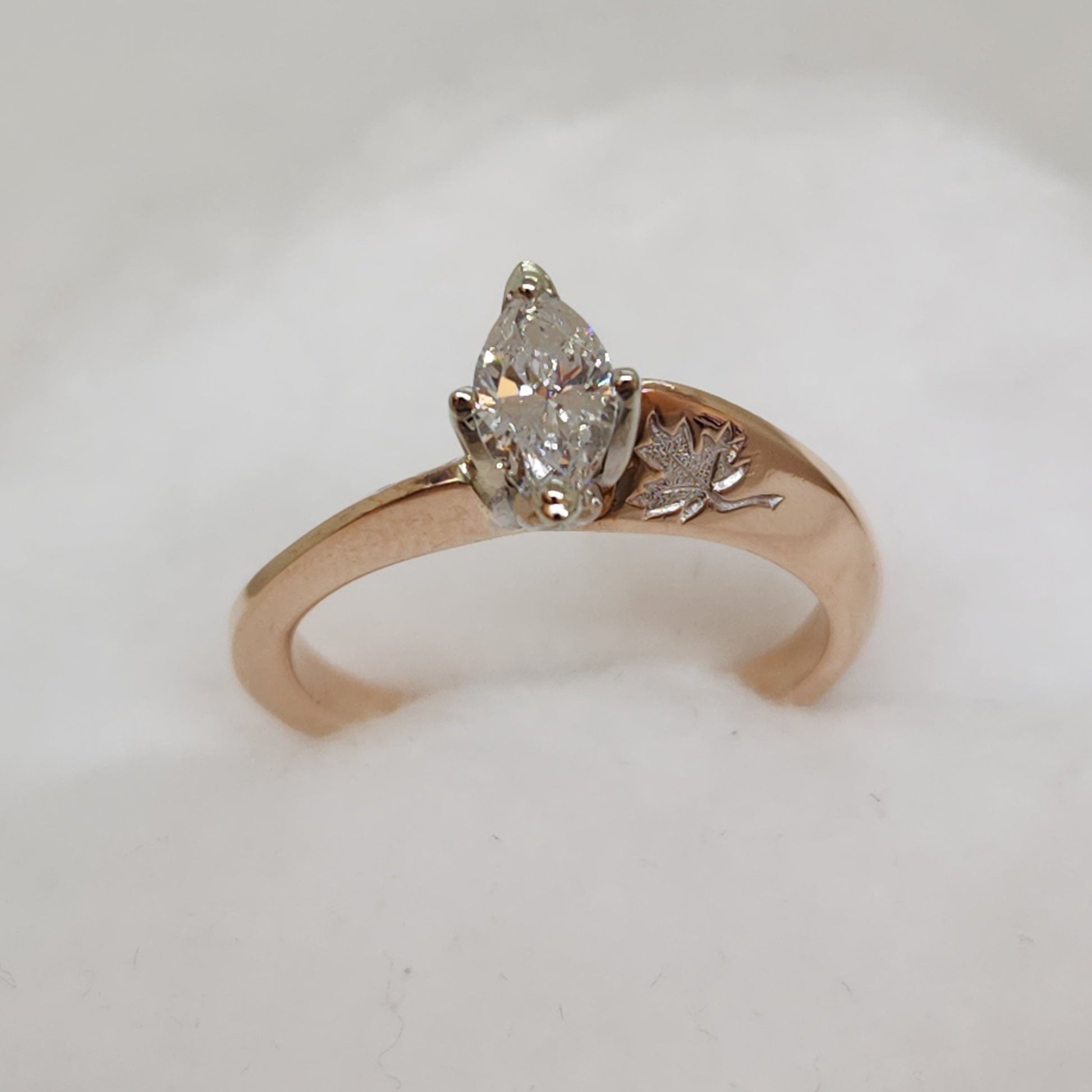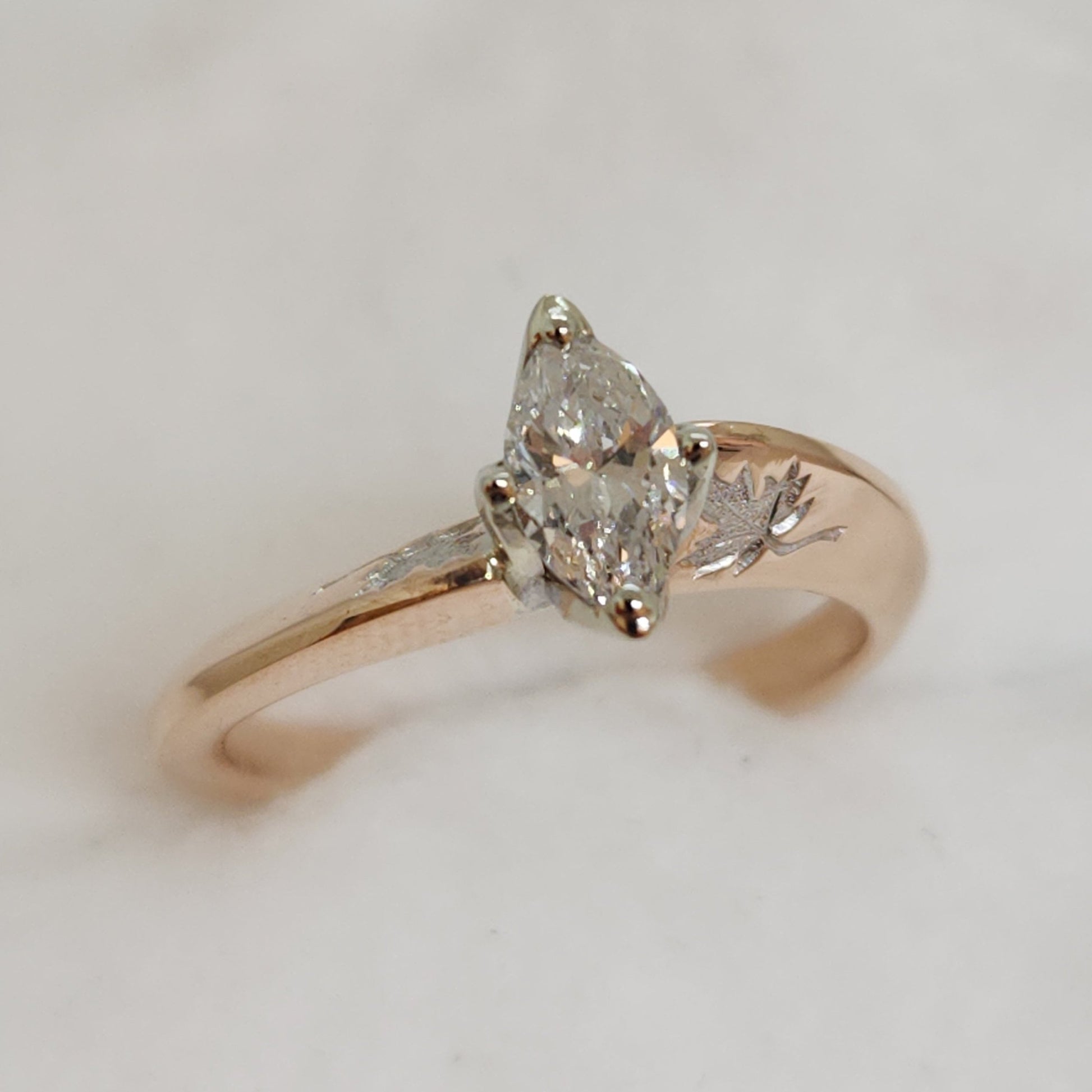 Part of our Canadiana collection designed and handcrafted by Marilyn herself. The beautifully tapered knife edge band has a soft tilt from side to side revealing an engraved maple leaf on each side. They frame this marquise diamond and provide that wonderfully special uniqueness.