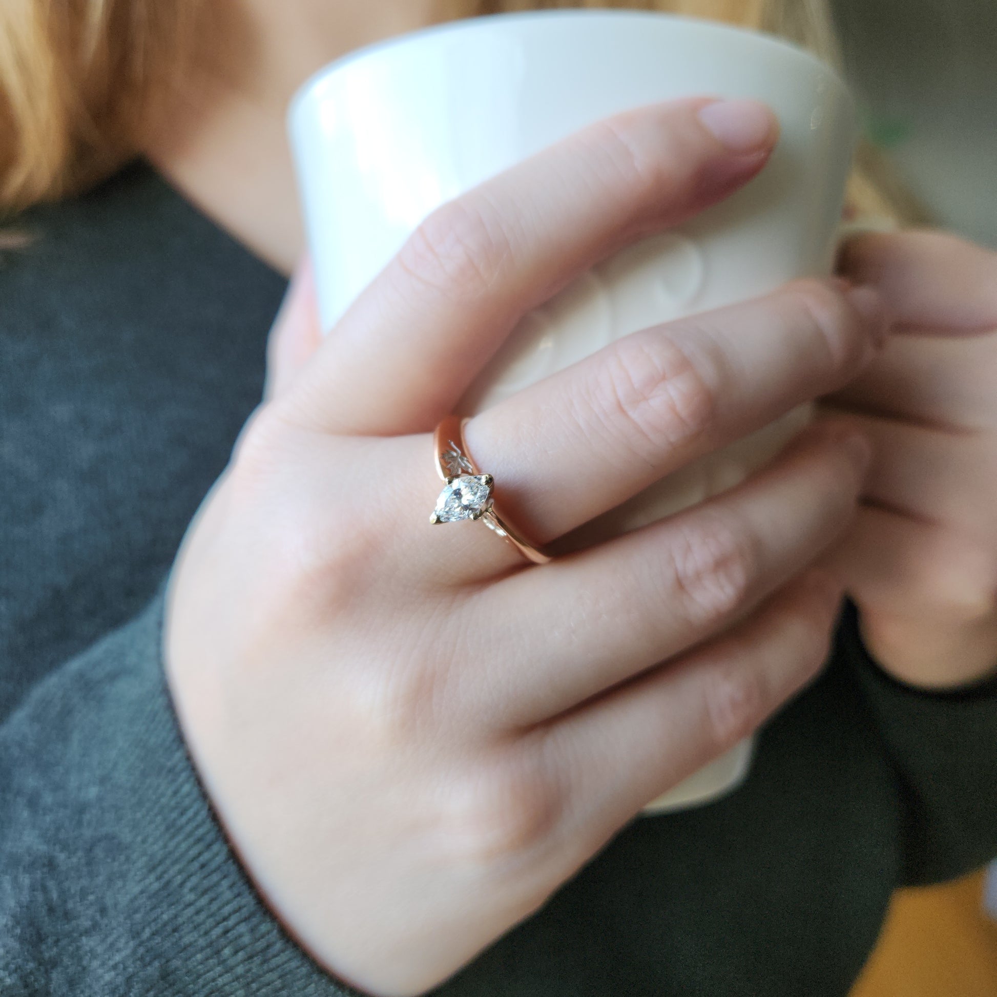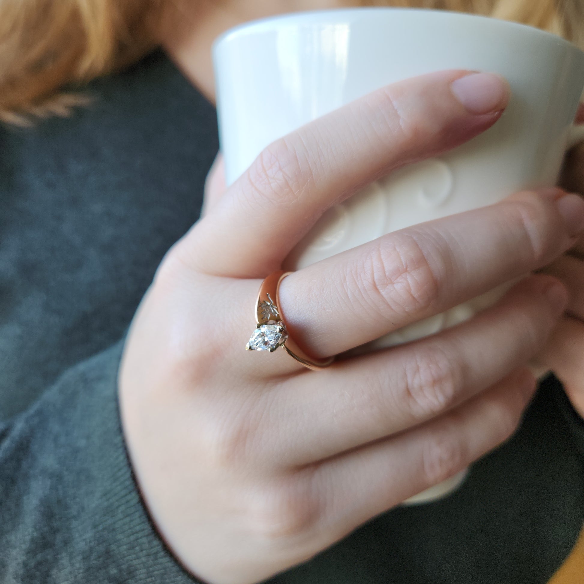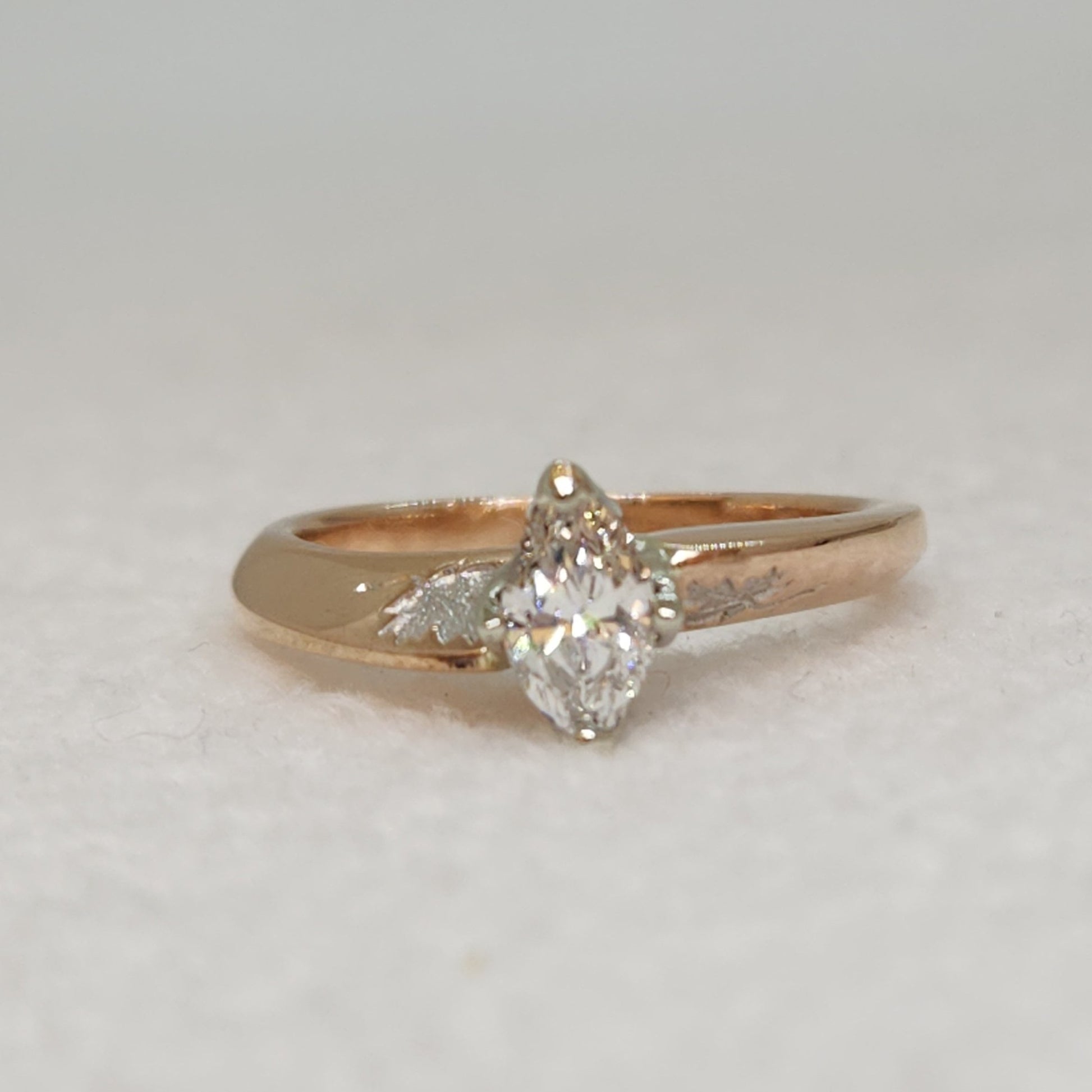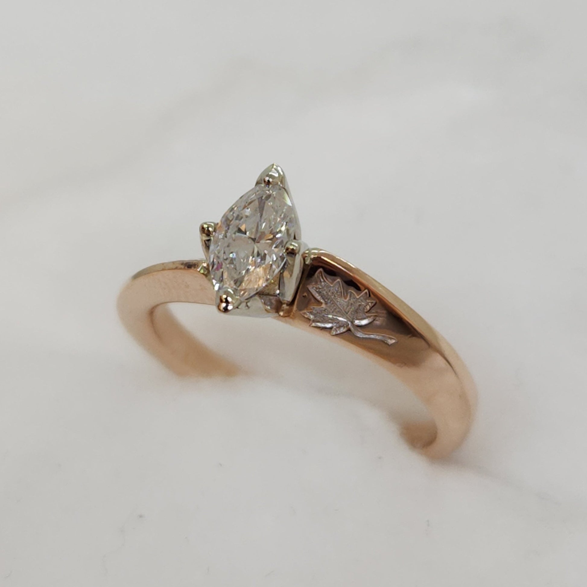 Part of our Canadiana collection designed and handcrafted by Marilyn herself. The beautifully tapered knife edge band has a soft tilt from side to side revealing an engraved maple leaf on each side. They frame this marquise diamond and provide that wonderfully special uniqueness.