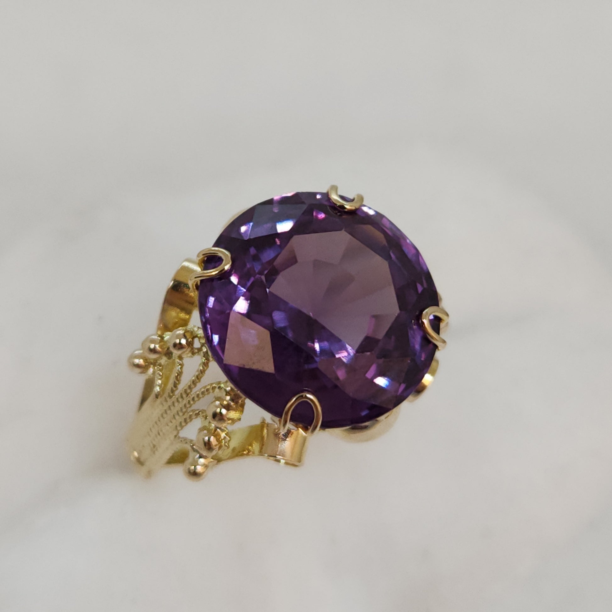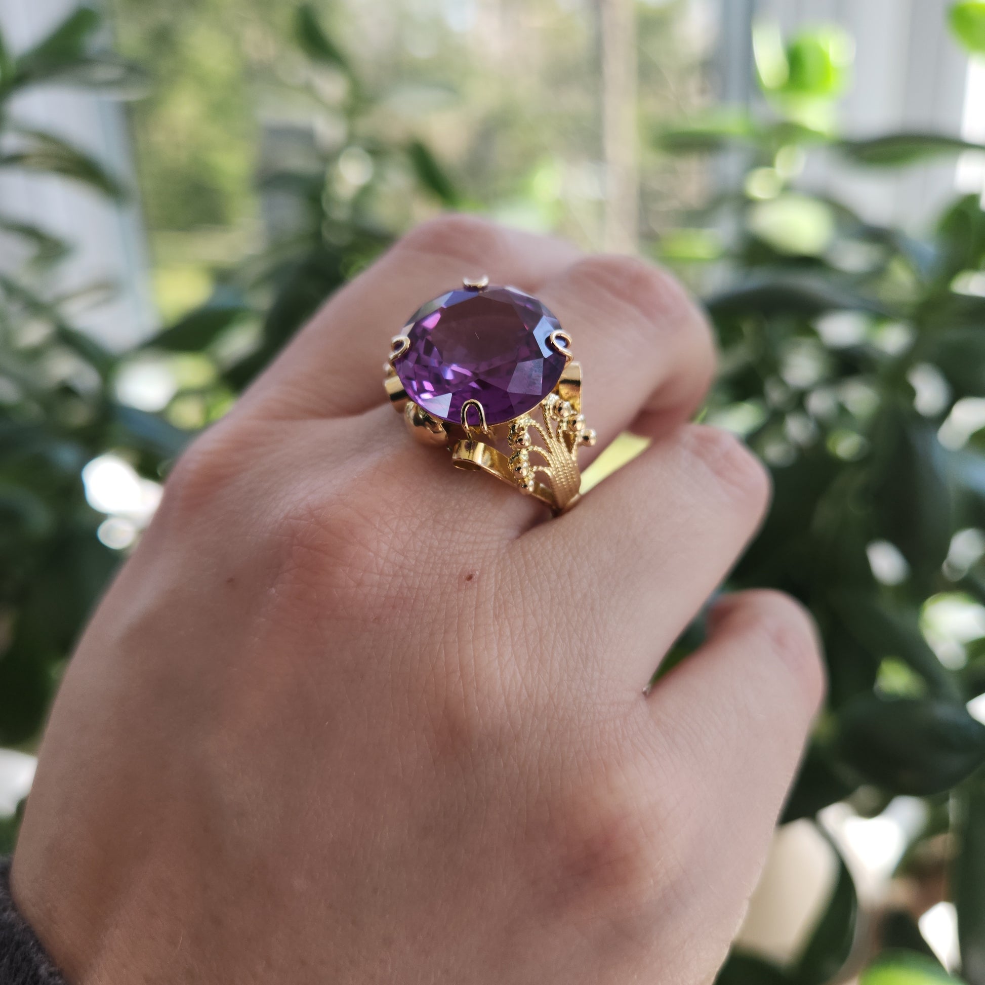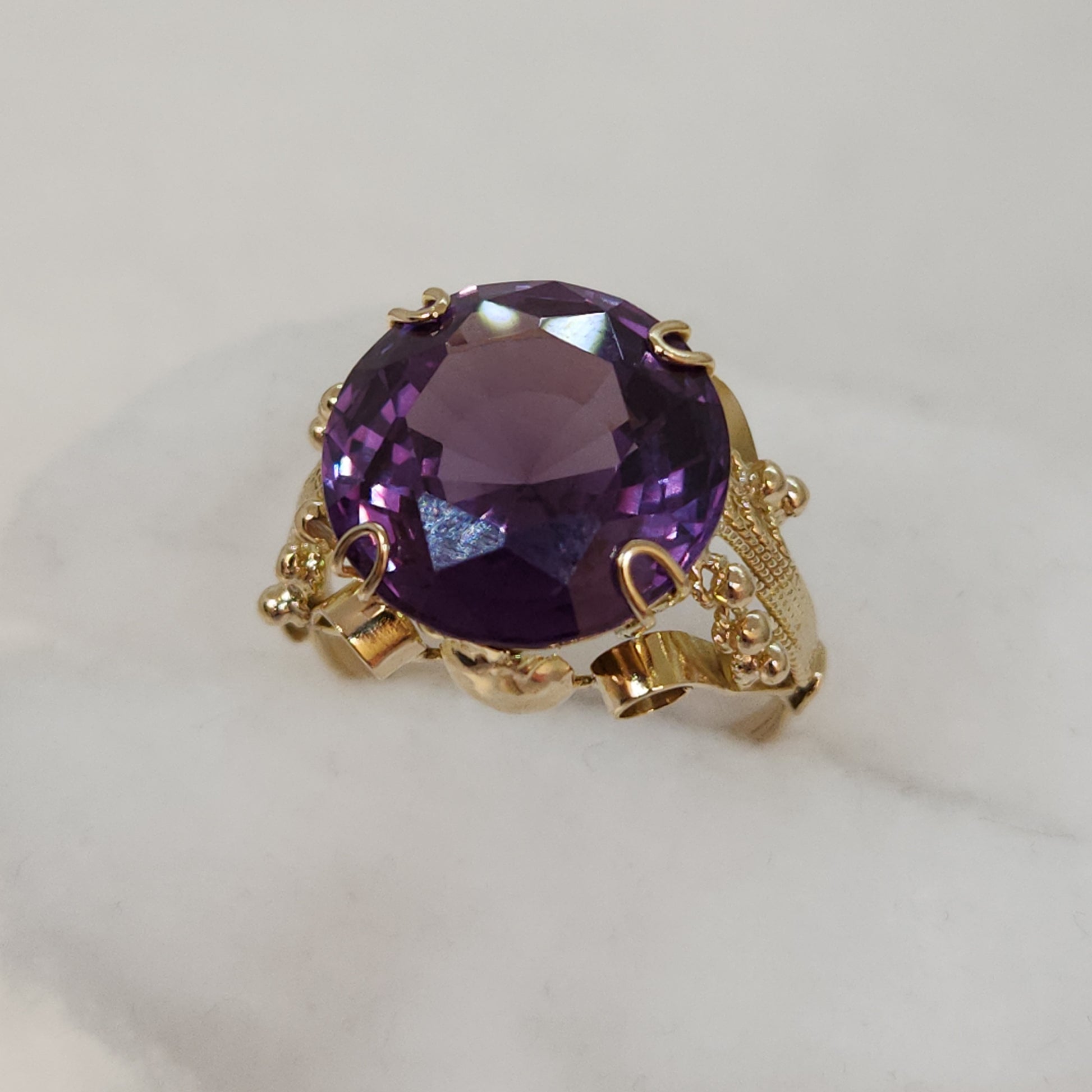 Handcrafted with Egyptian origins, this hails from the 40's or 50's. Made in rich 18k, each of the decorative details were individually soldered together. The stone is of a colour changing variety. It will go from a greyish blue in daylight to a warm violet purple under artificial light.