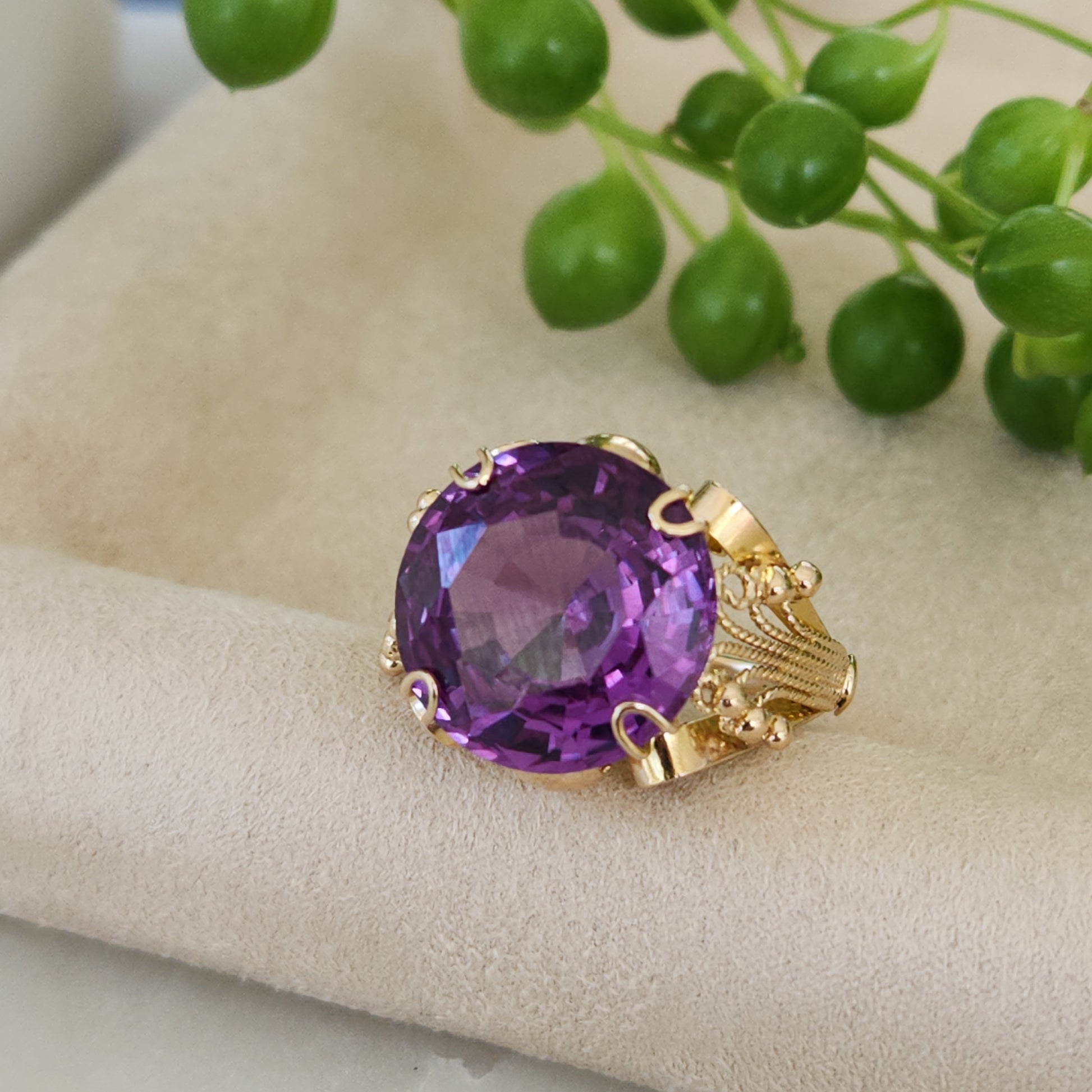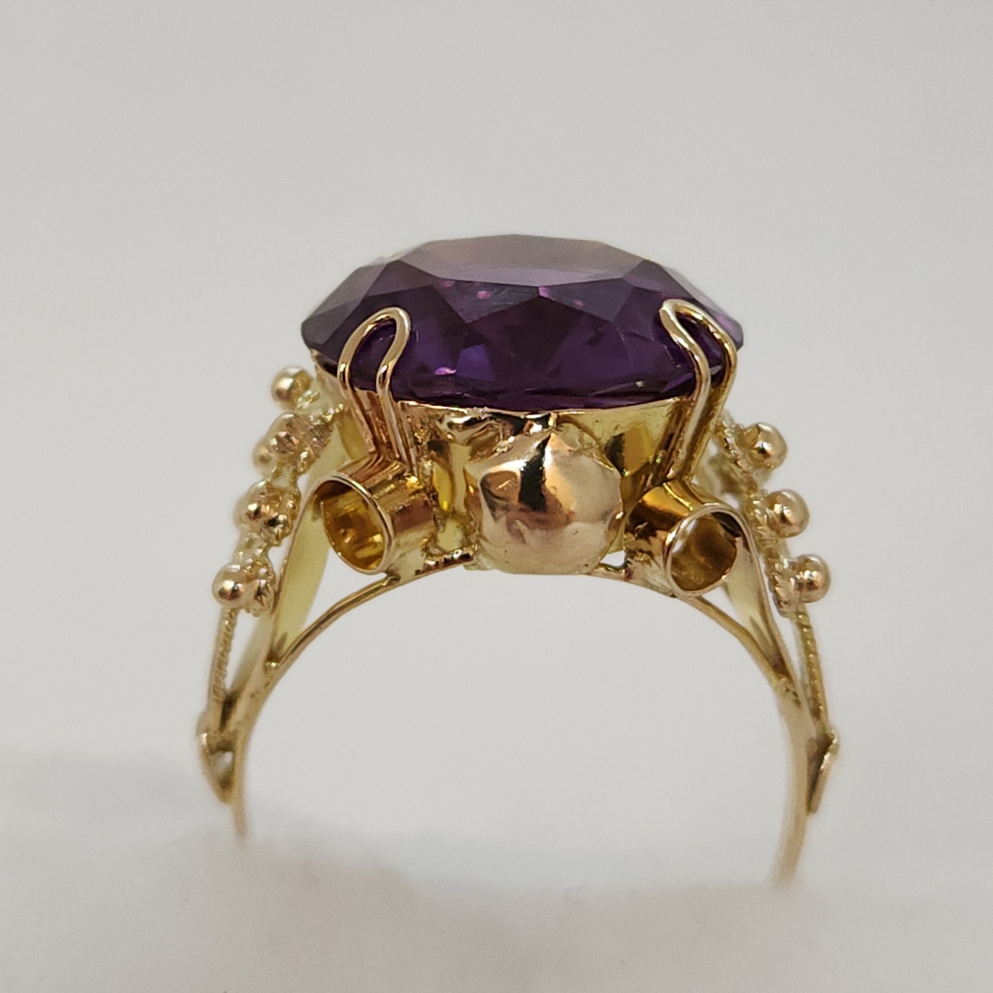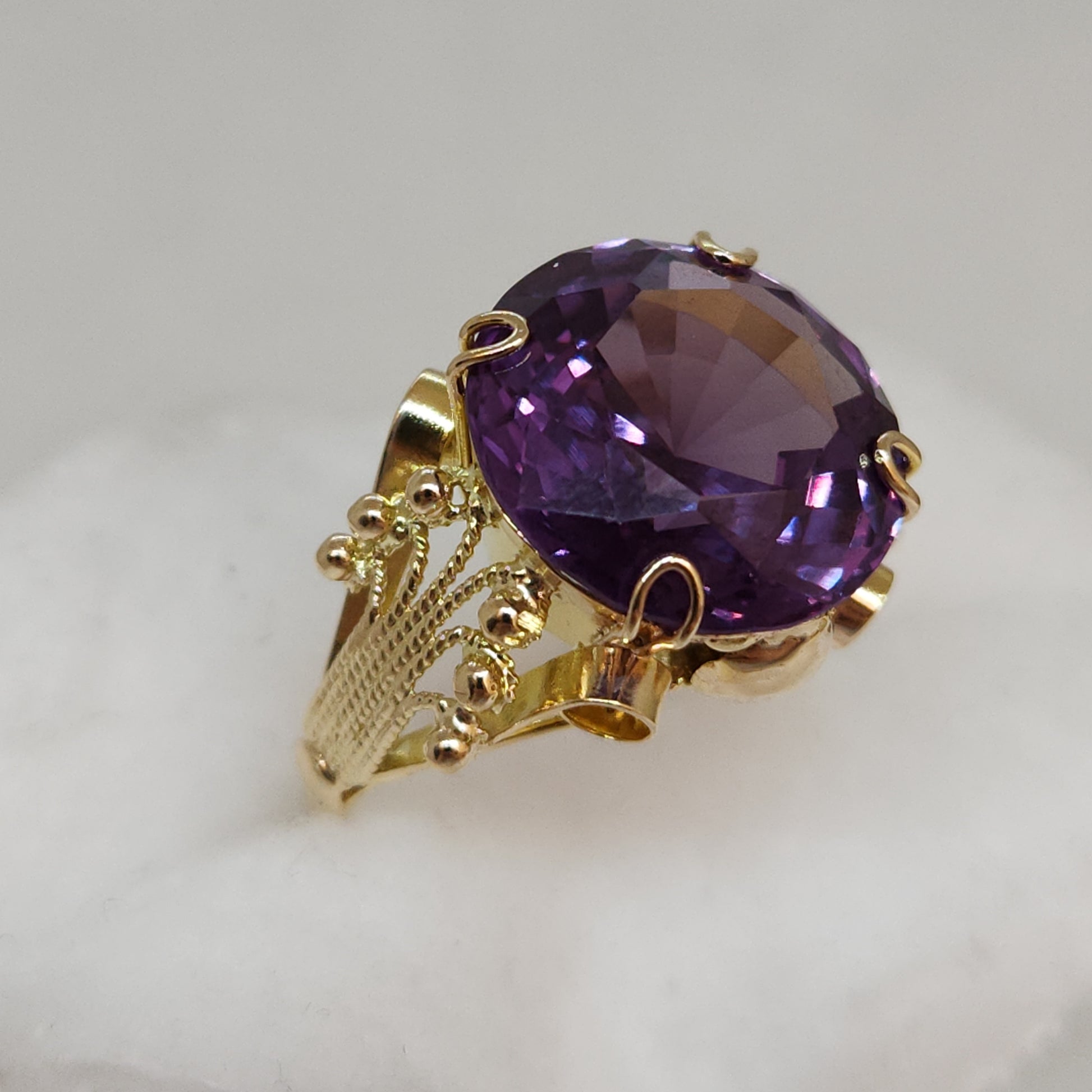 Handcrafted with Egyptian origins, this hails from the 40's or 50's. Made in rich 18k, each of the decorative details were individually soldered together. The stone is of a colour changing variety. It will go from a greyish blue in daylight to a warm violet purple under artificial light.
