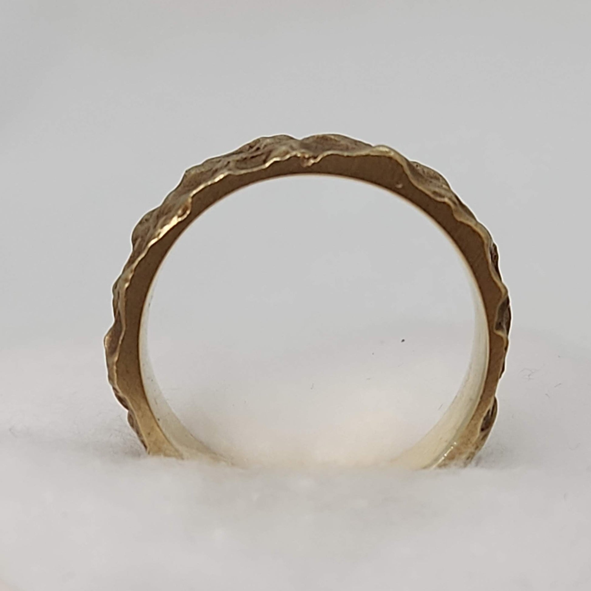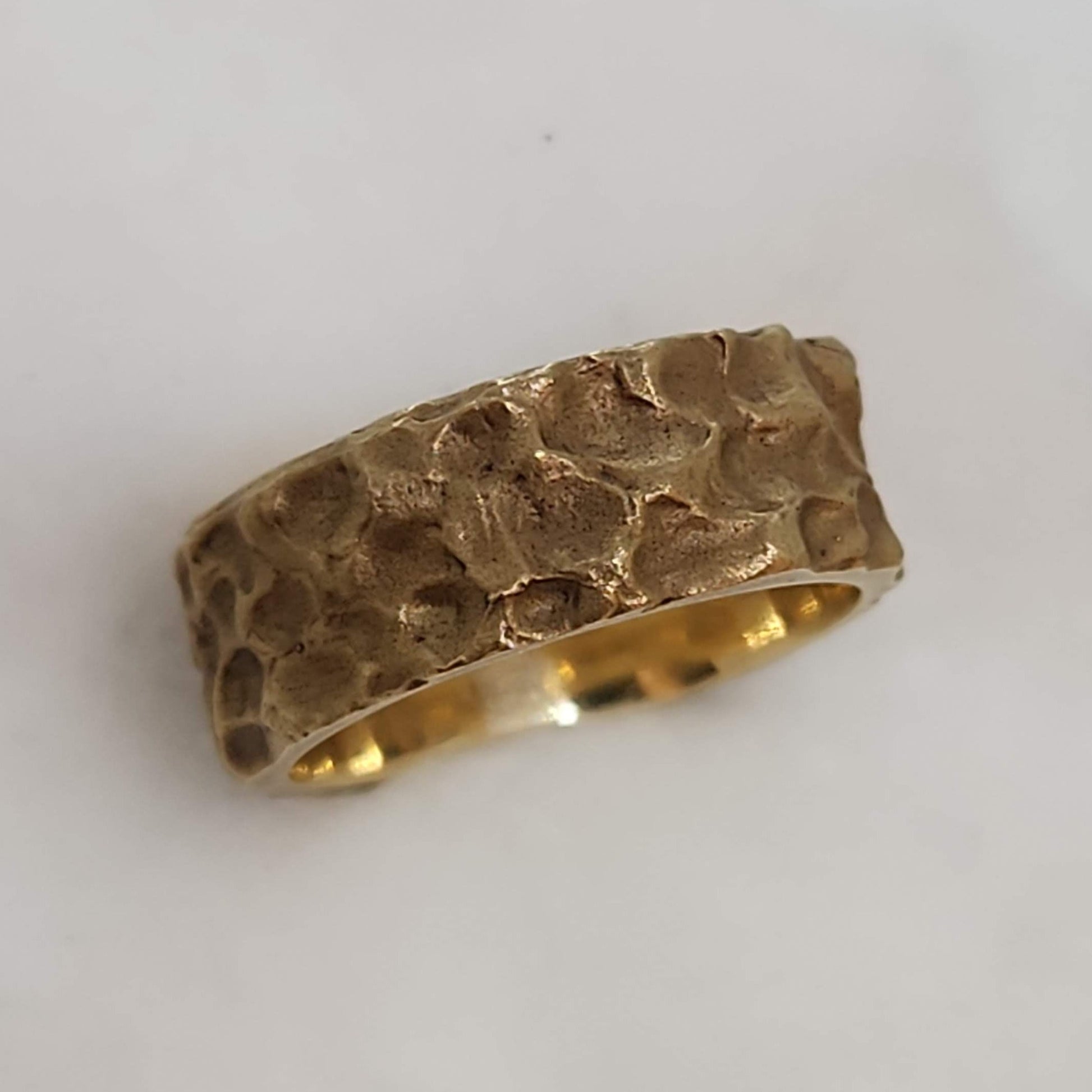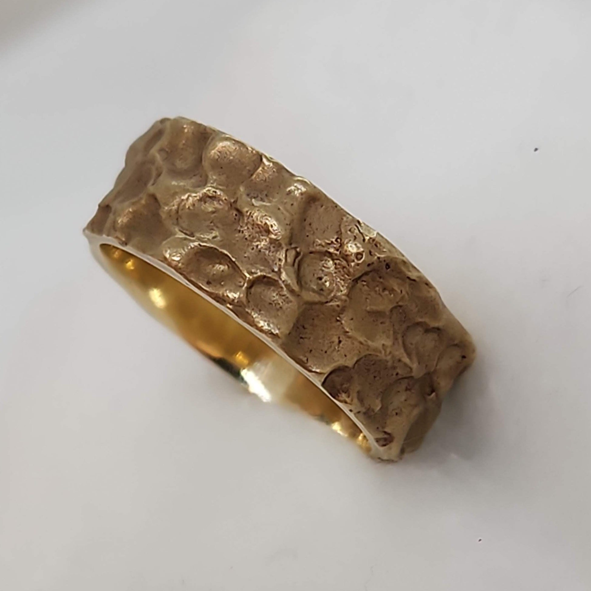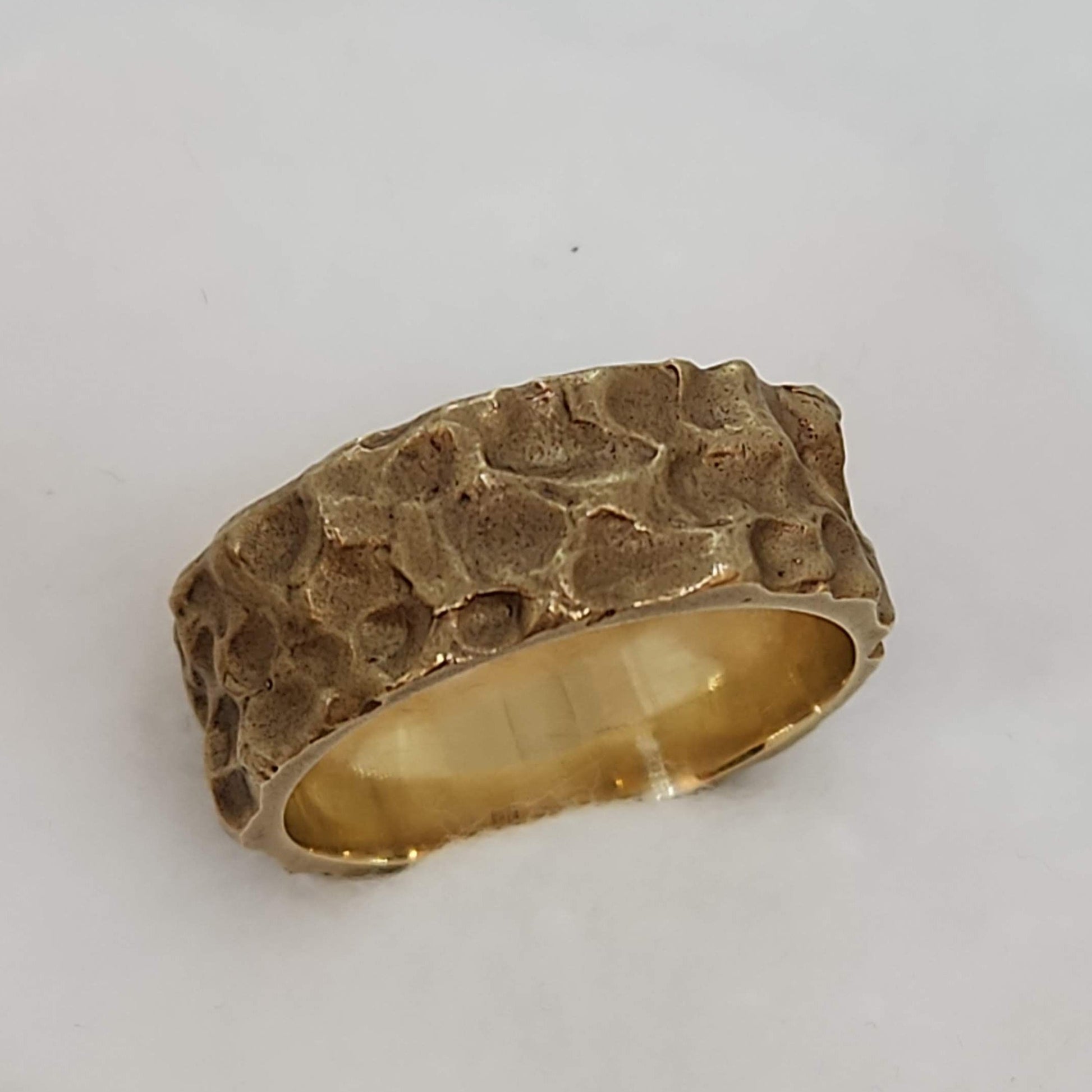 A very distinctive texture, perhaps reminiscent of the moon's surface. A soft sandblasted surface on the outside is highlighted against the high polish inside surface. Designed and made by Marigold Design Studio, nobody else has a ring quite like this!