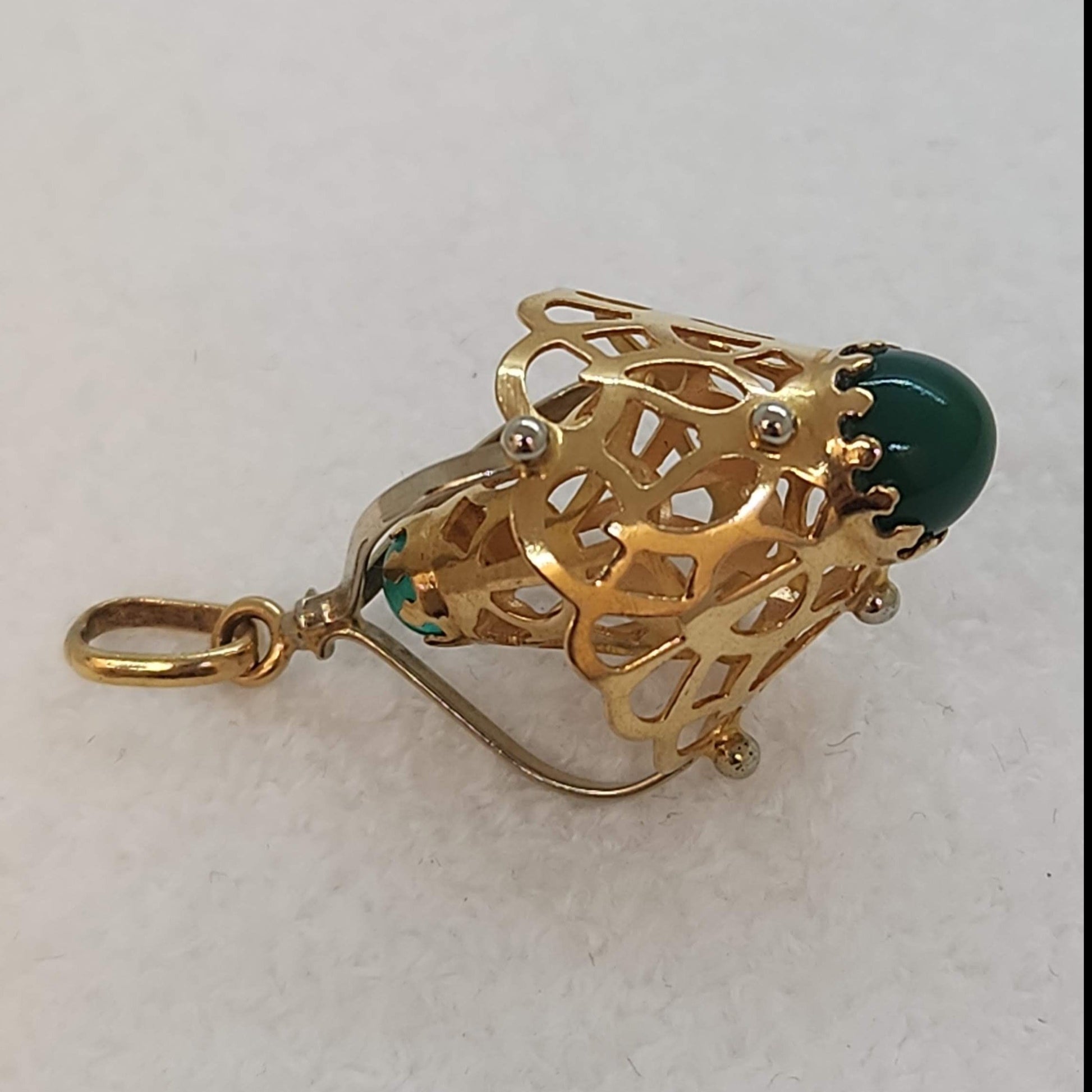 Possibly inspired by the lamp artisans of Morocco or Turkey, this unique pendant gracefully holds two green glass accents and will brighten whatever outfit you wear it with. This would look spectacular on a longish chain (approx 24").