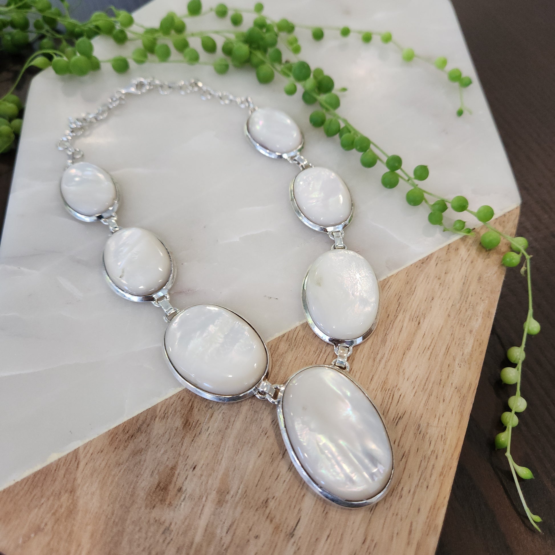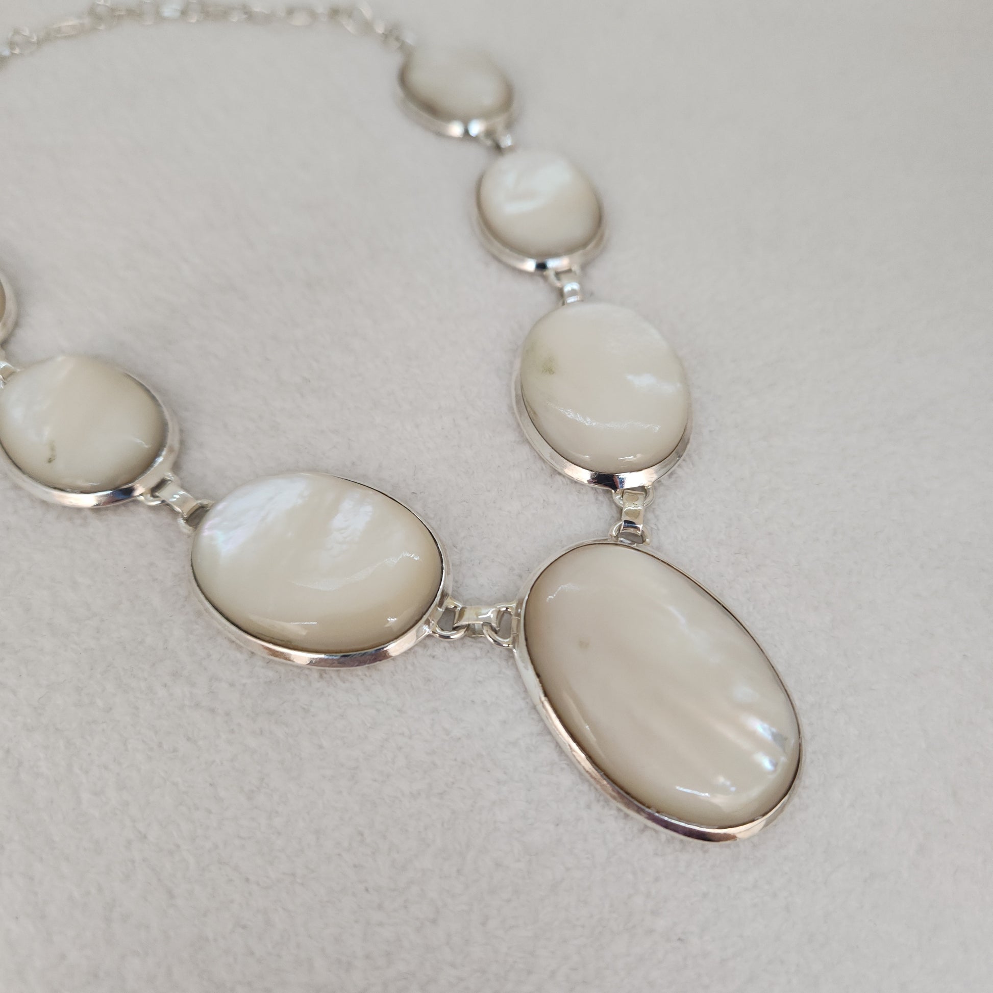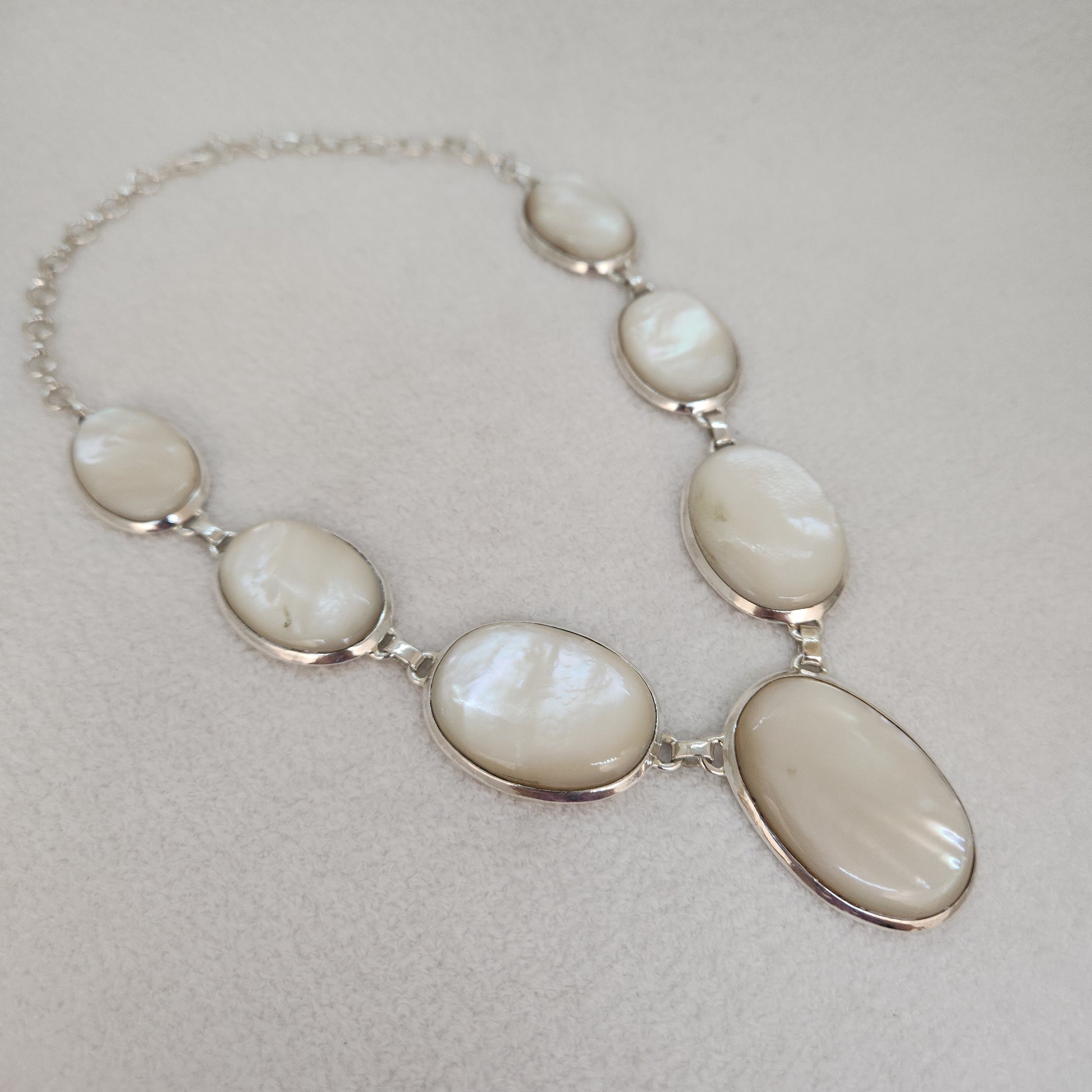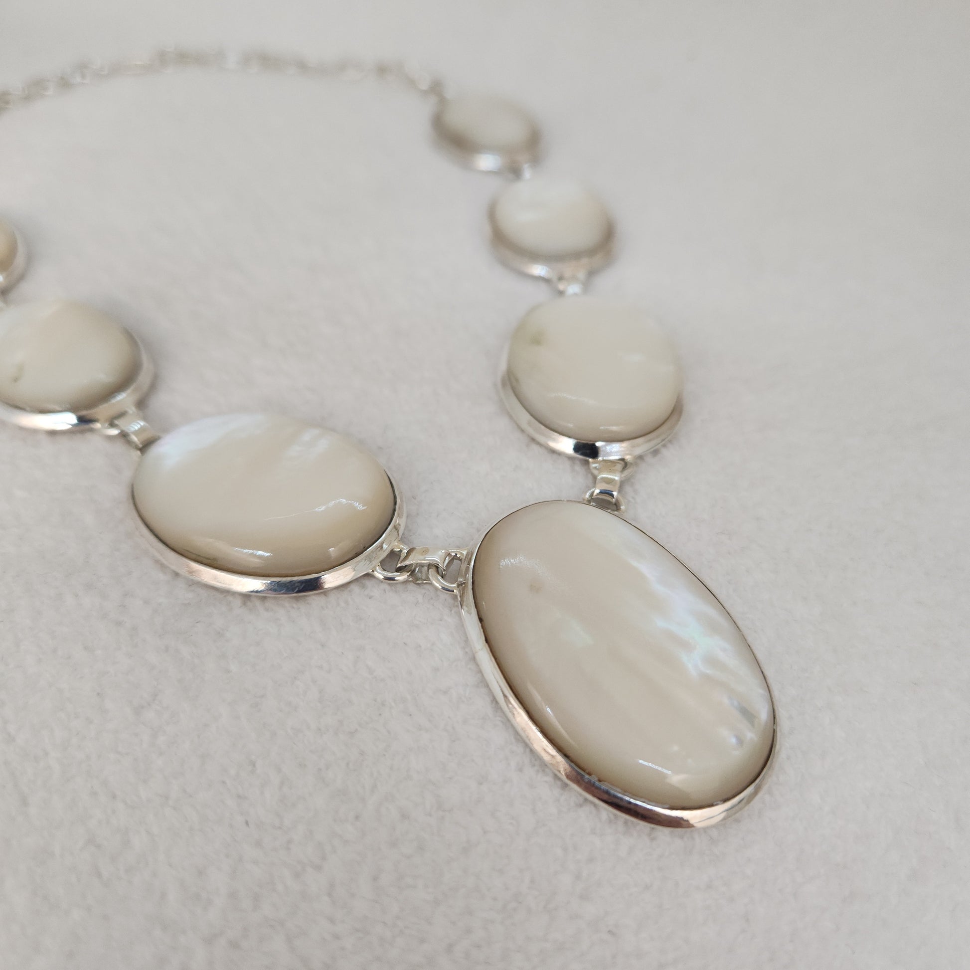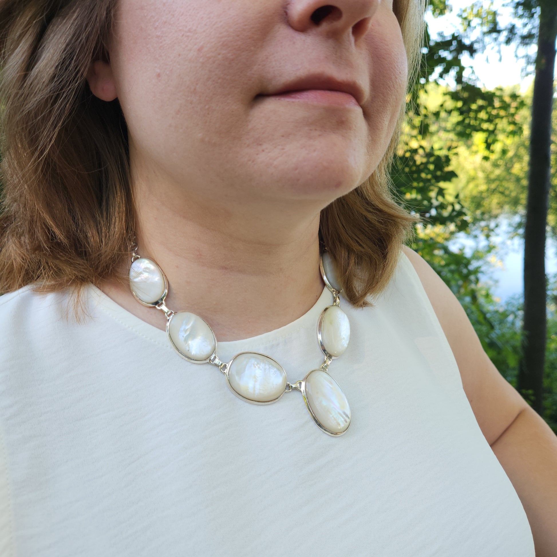 Lustrous and mesmerizing, this mother of pearl has an inner glow from the many layers of nacre. The segments of this necklace lay very smoothly along your neck with good movement between the links.