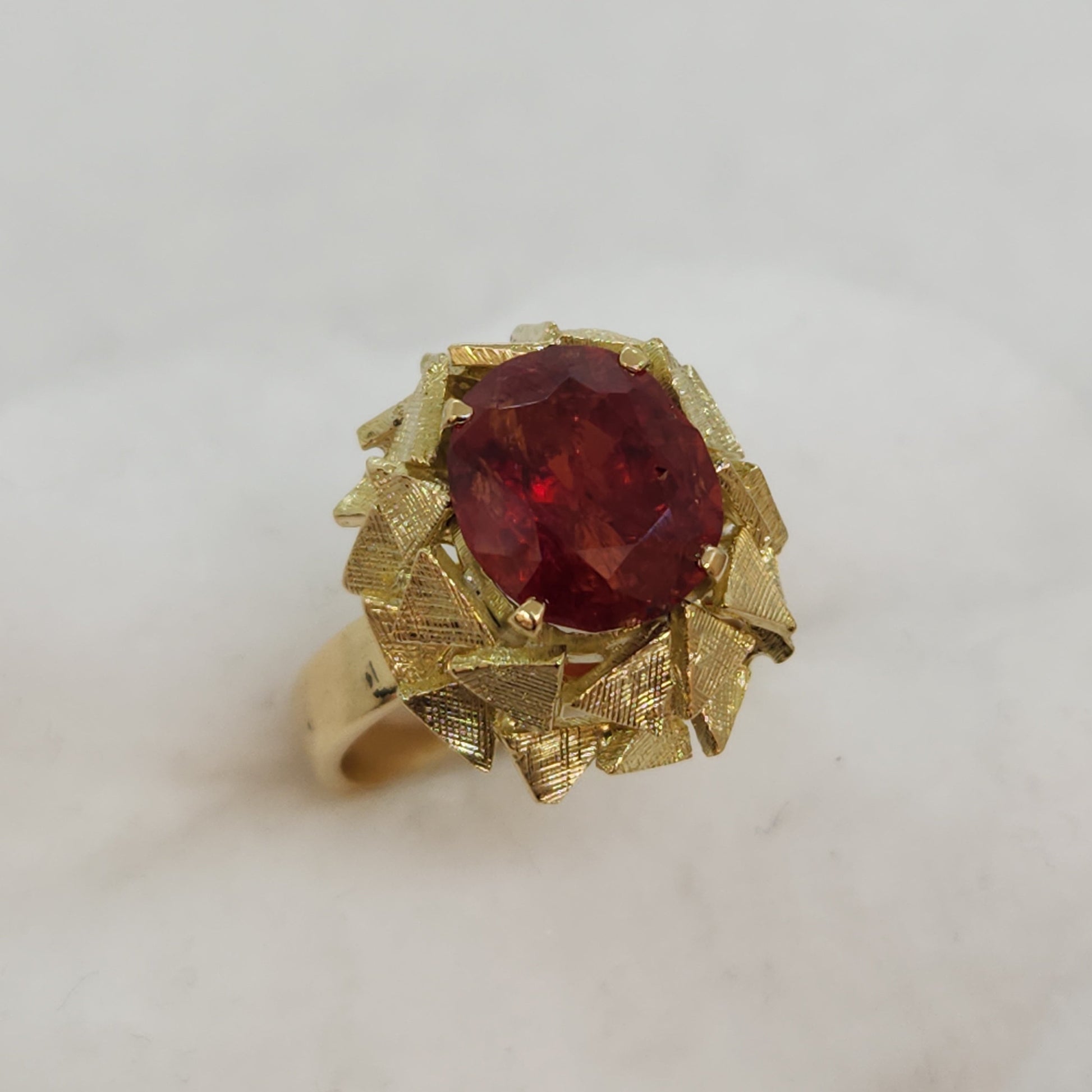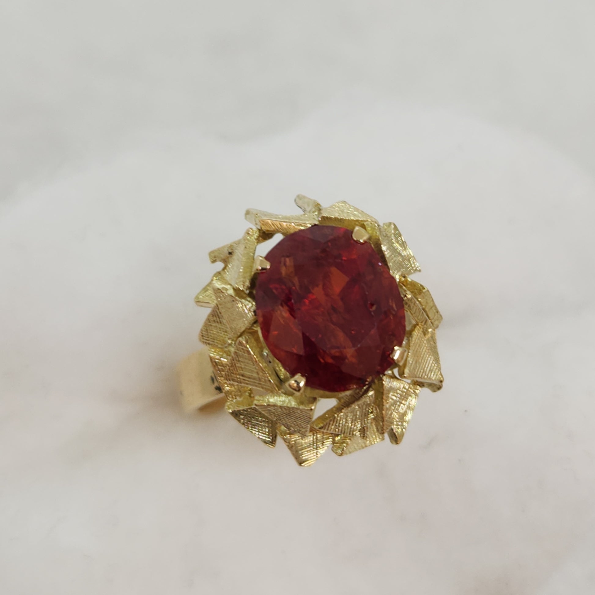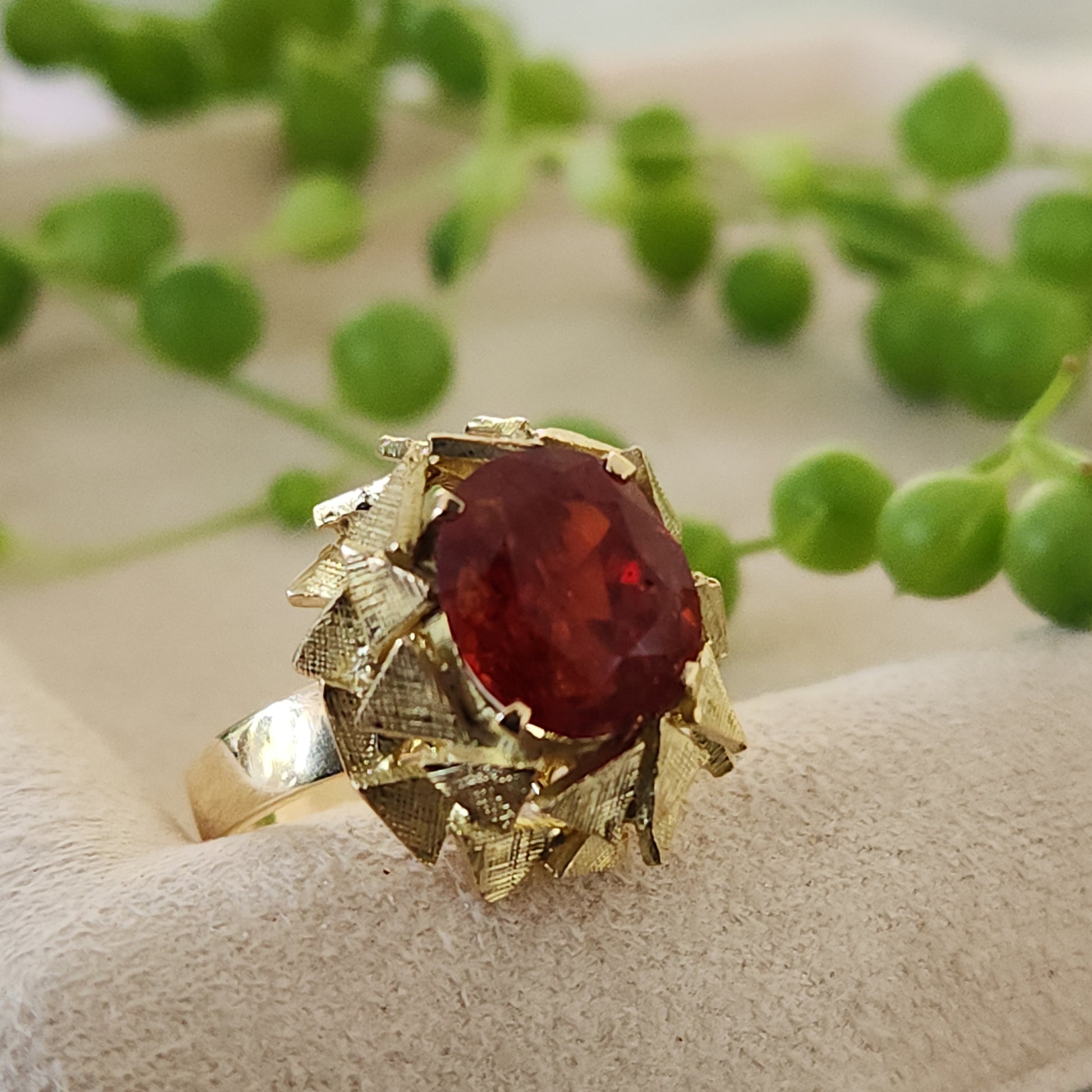 This particular ring is circa 1960's-70's, made in the brutalist style, a movement that was a reaction against the traditional elegance of jewellery. Designers wanted to embrace raw, unpolished and architectural aesthetics. We see these triangle shapes, with texture, their edges exposed, all designed to elevate this gemstone. The spinel's colour is a burnt orange mixed with a bit of red. The stone is so vibrant, and if you look deeper you can see some natural inclusions, they add character and life to this gemstone. This is a signature ring that will get you noticed