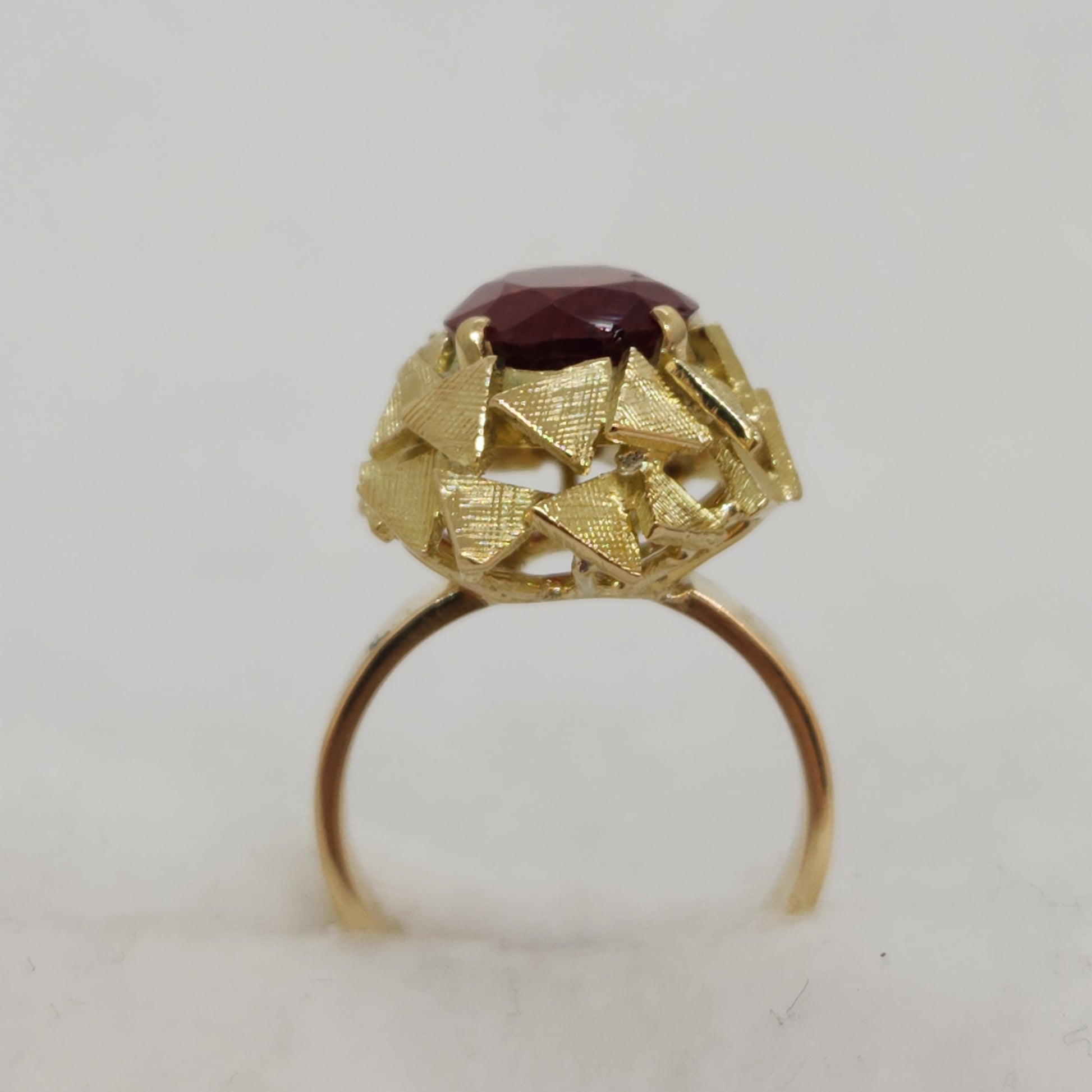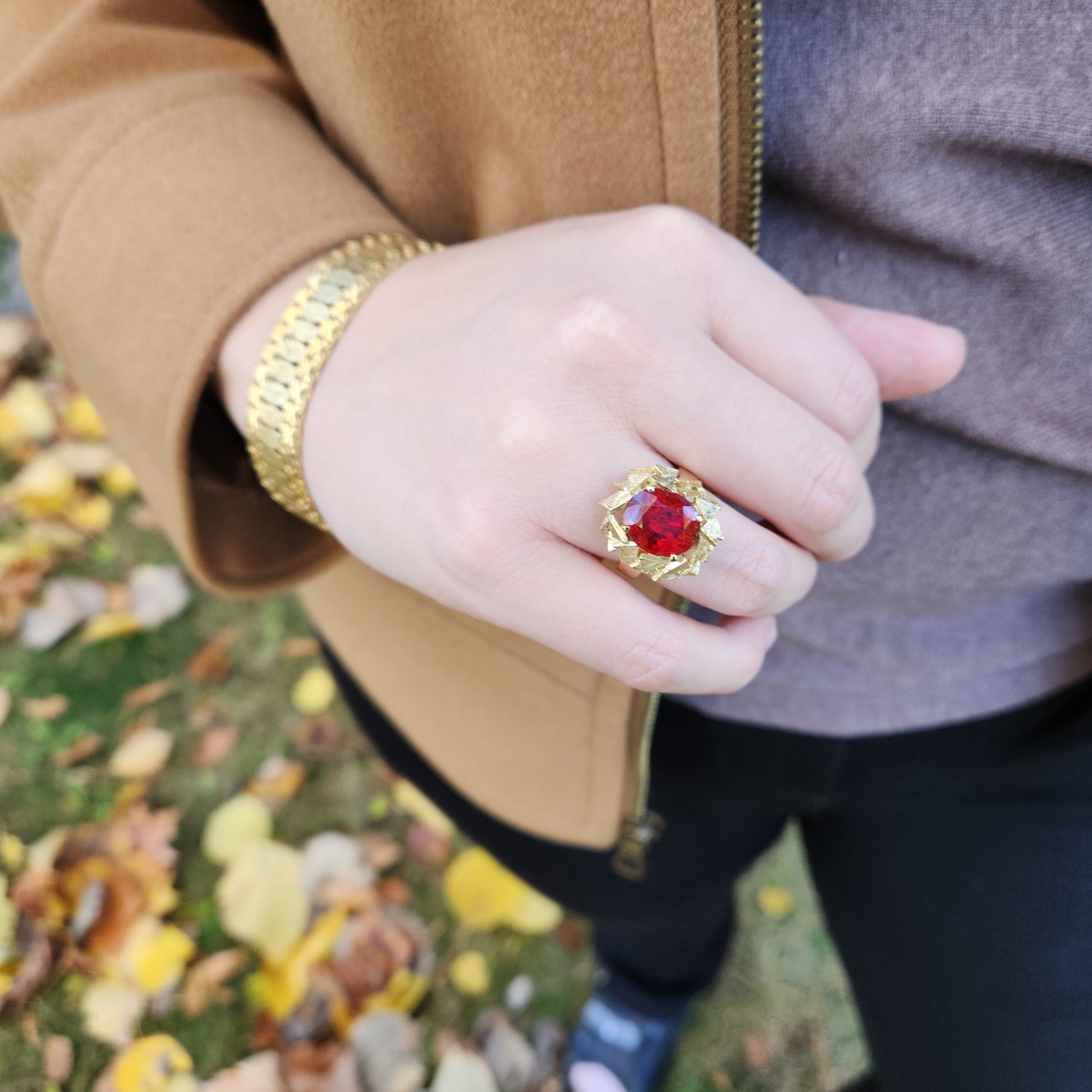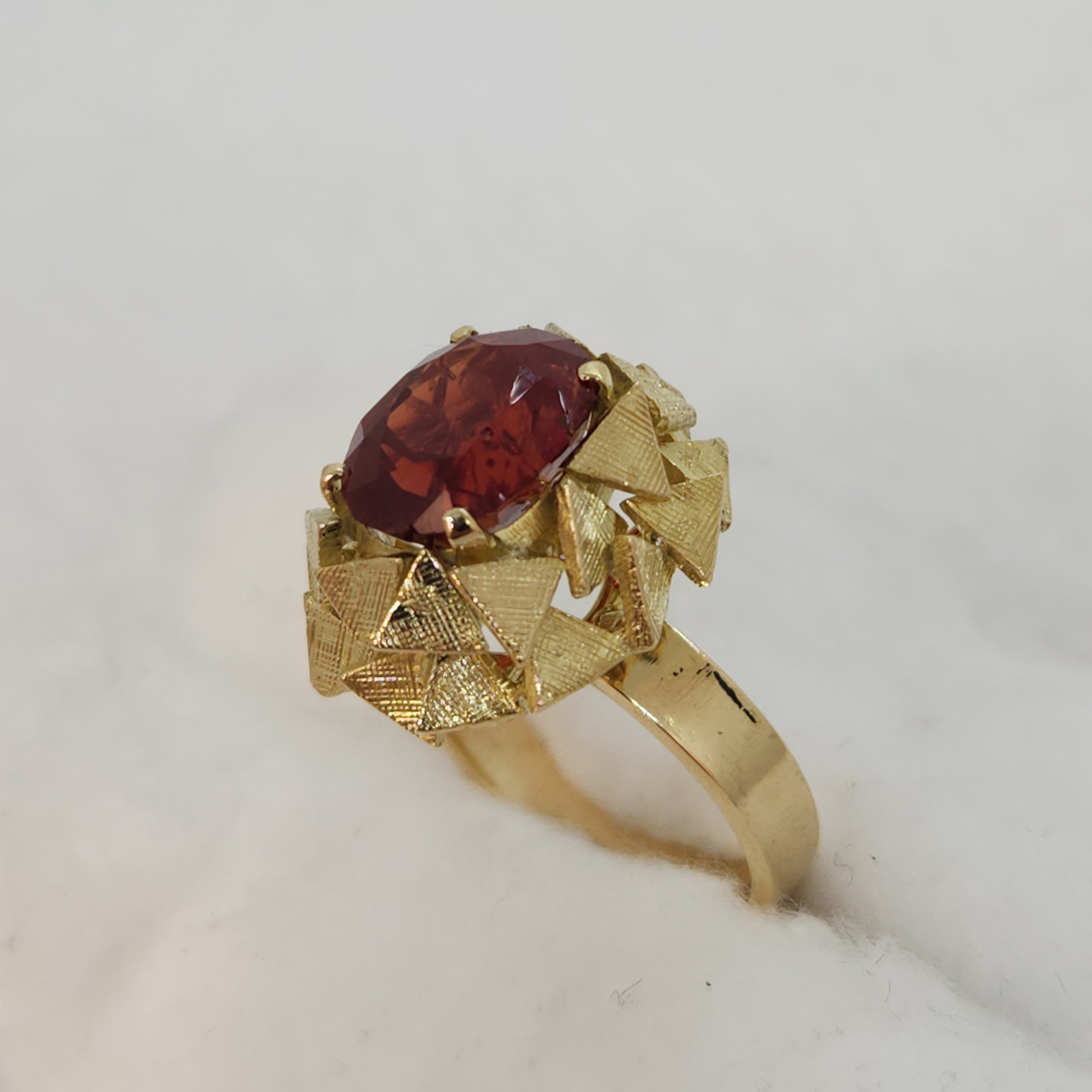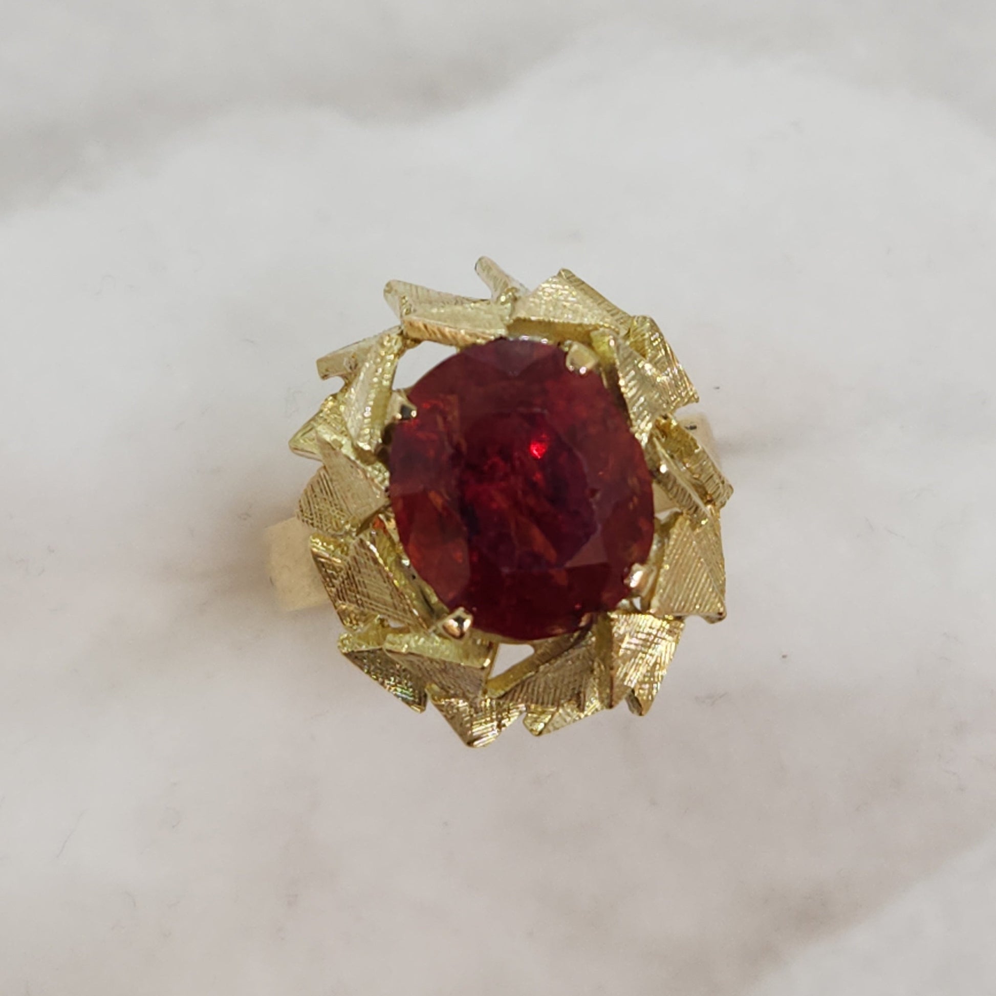 This particular ring is circa 1960's-70's, made in the brutalist style, a movement that was a reaction against the traditional elegance of jewellery. Designers wanted to embrace raw, unpolished and architectural aesthetics. We see these triangle shapes, with texture, their edges exposed, all designed to elevate this gemstone. The spinel's colour is a burnt orange mixed with a bit of red. The stone is so vibrant, and if you look deeper you can see some natural inclusions, they add character and life to this gemstone. This is a signature ring that will get you noticed