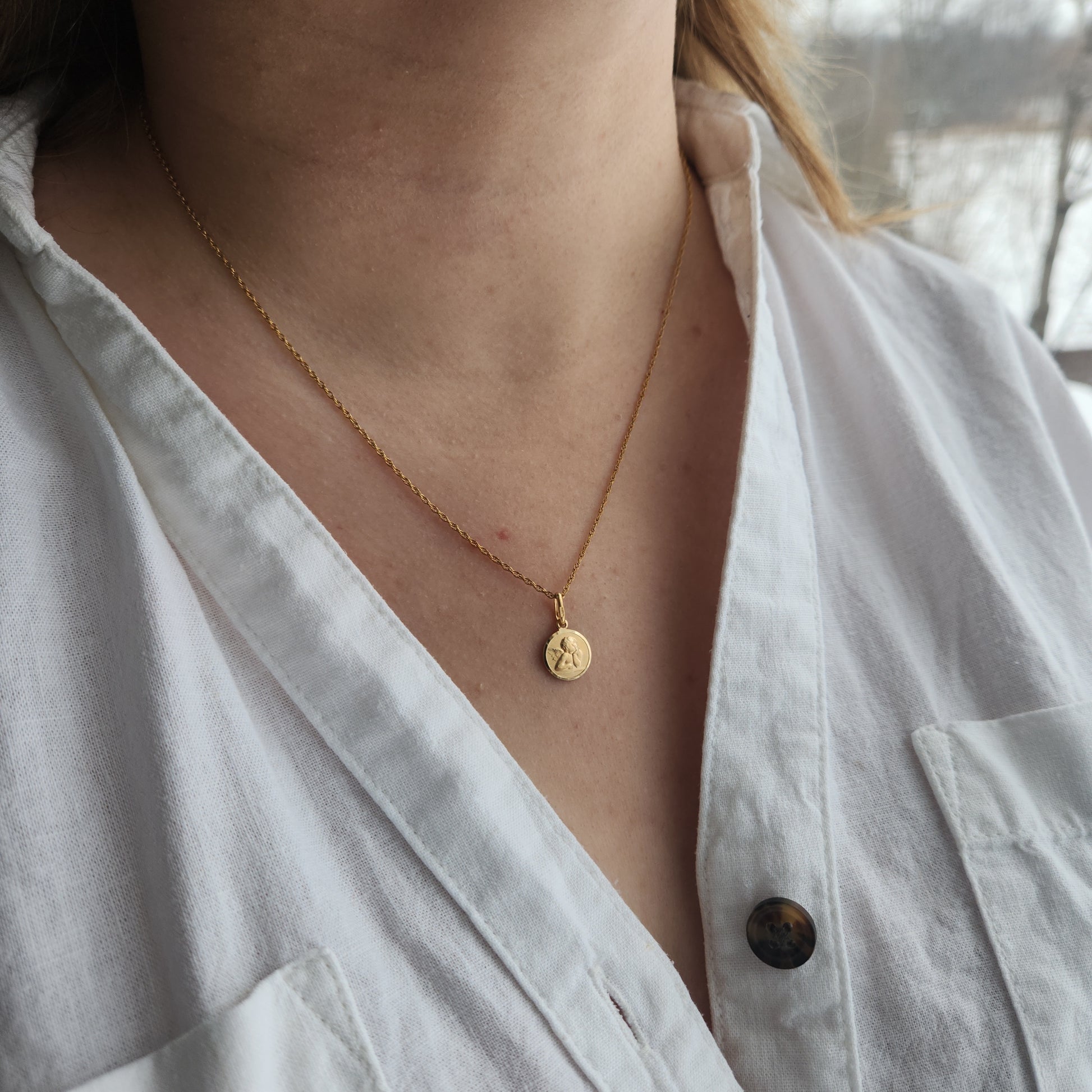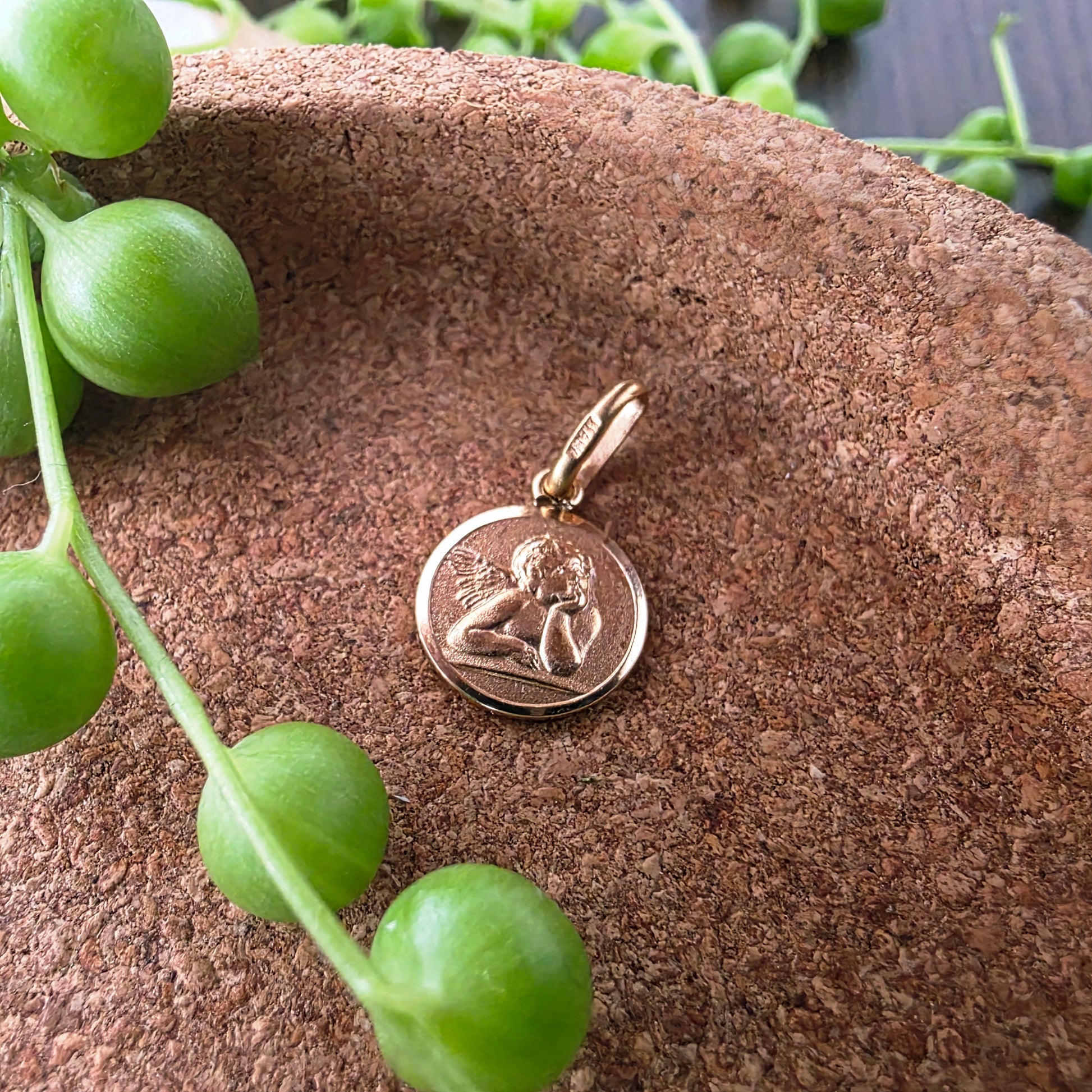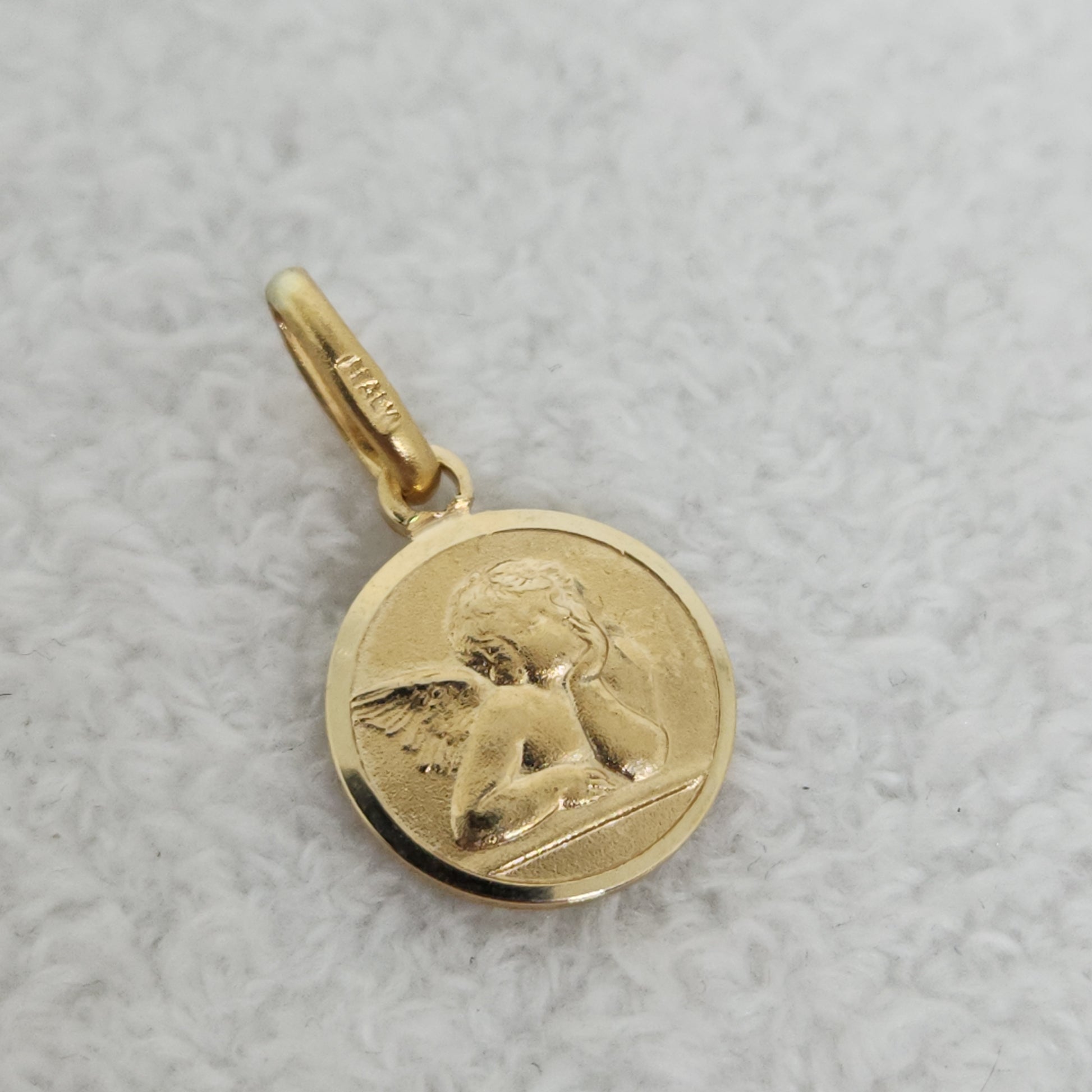 A tiny golden disc emblazoned with a simple angelic figure. A symbol of protection and guidance.