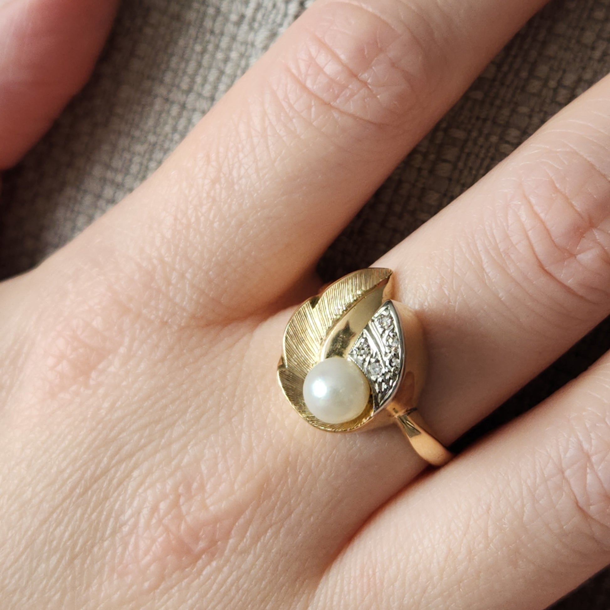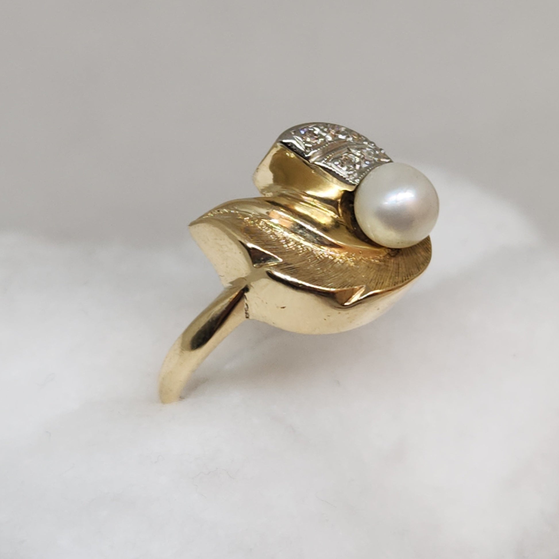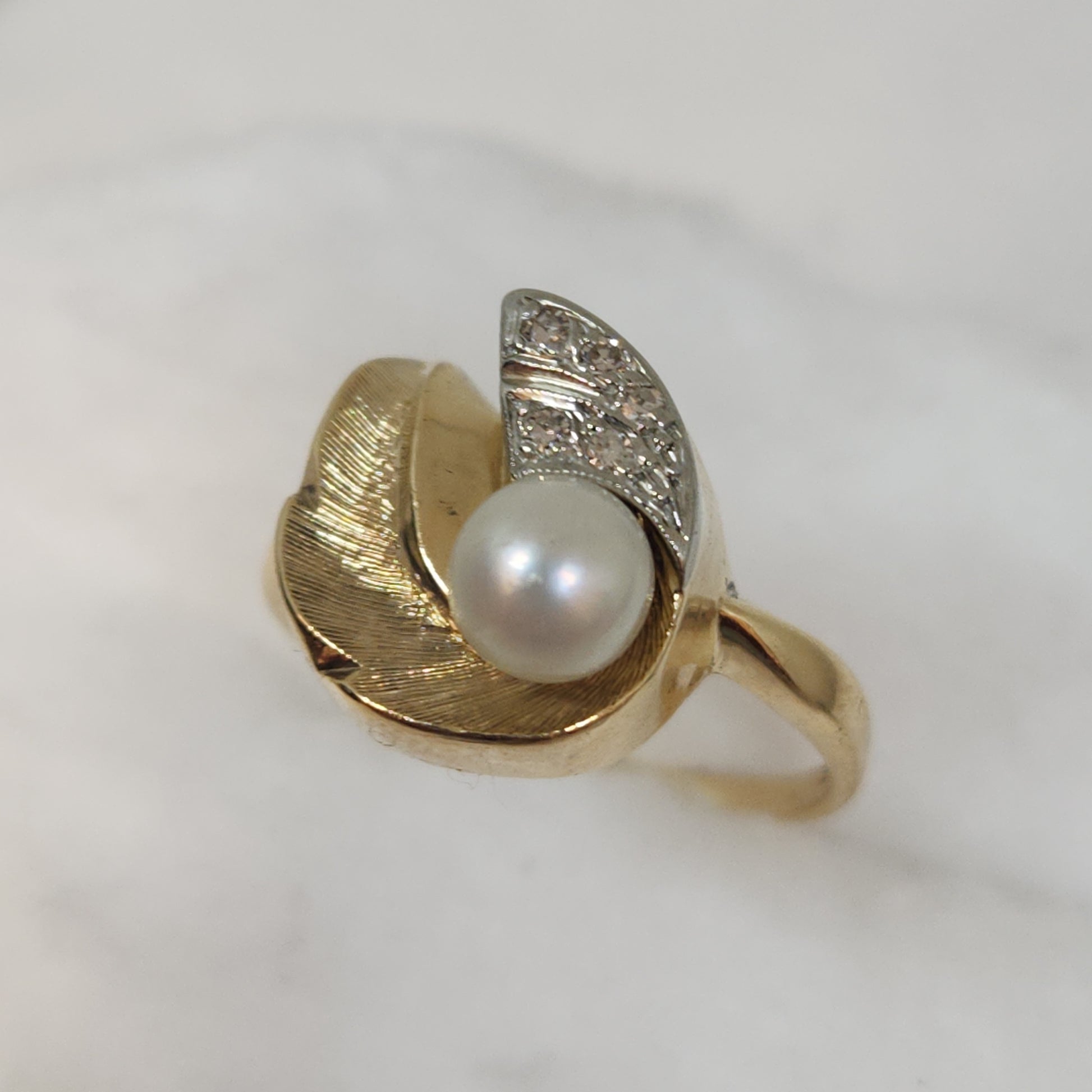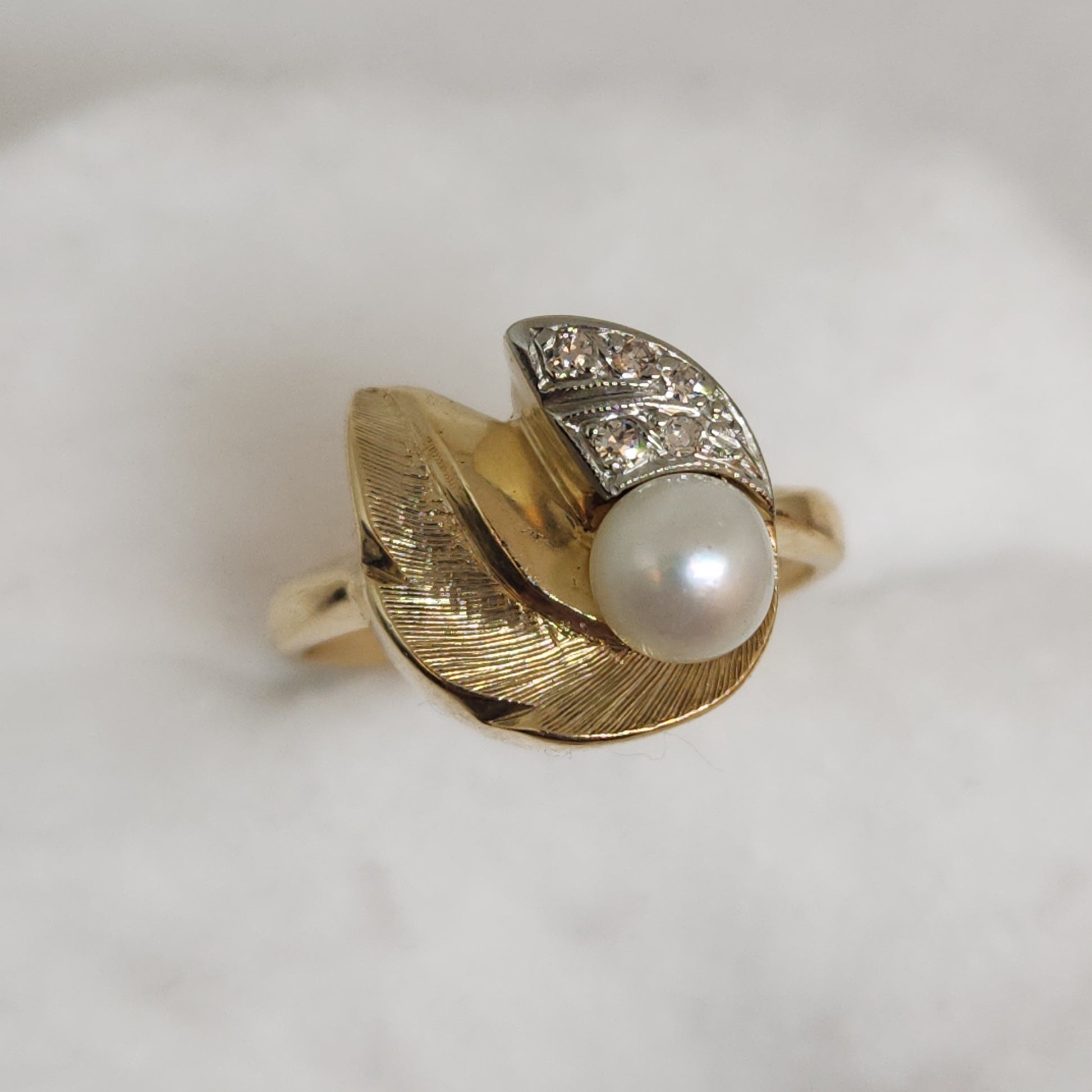 A little fantasy and history in this one. The leaf has beautiful hand engraved texture, as well as the detail surrounding the diamonds. The goldsmith creating this one had a nature vision that flows across the leaf. Circa 1950's.