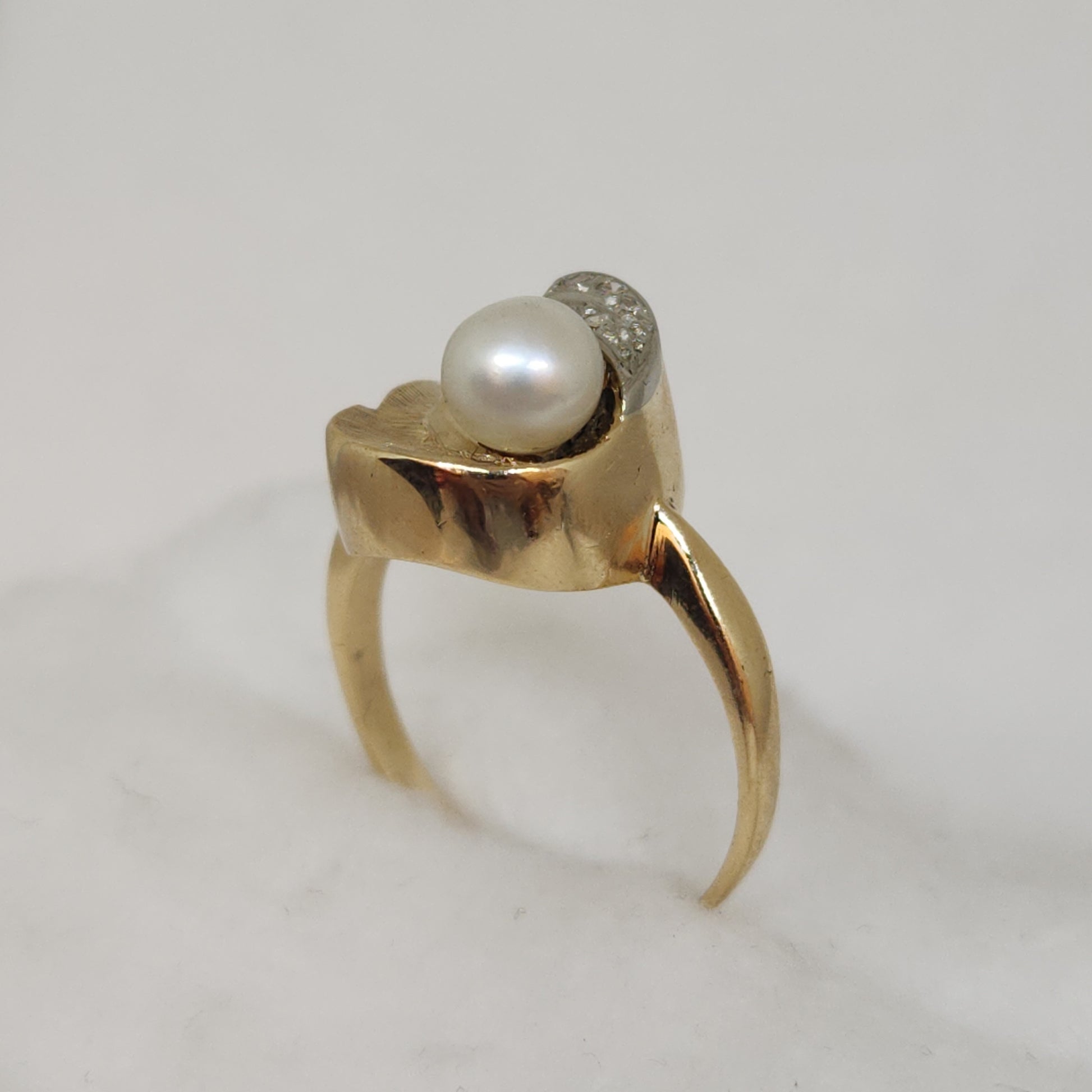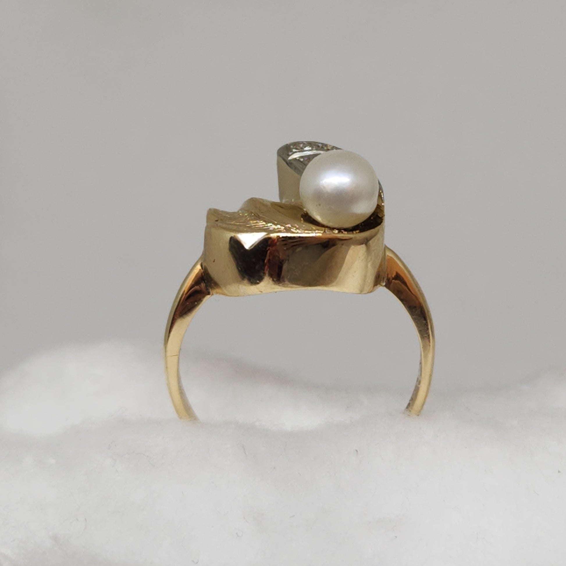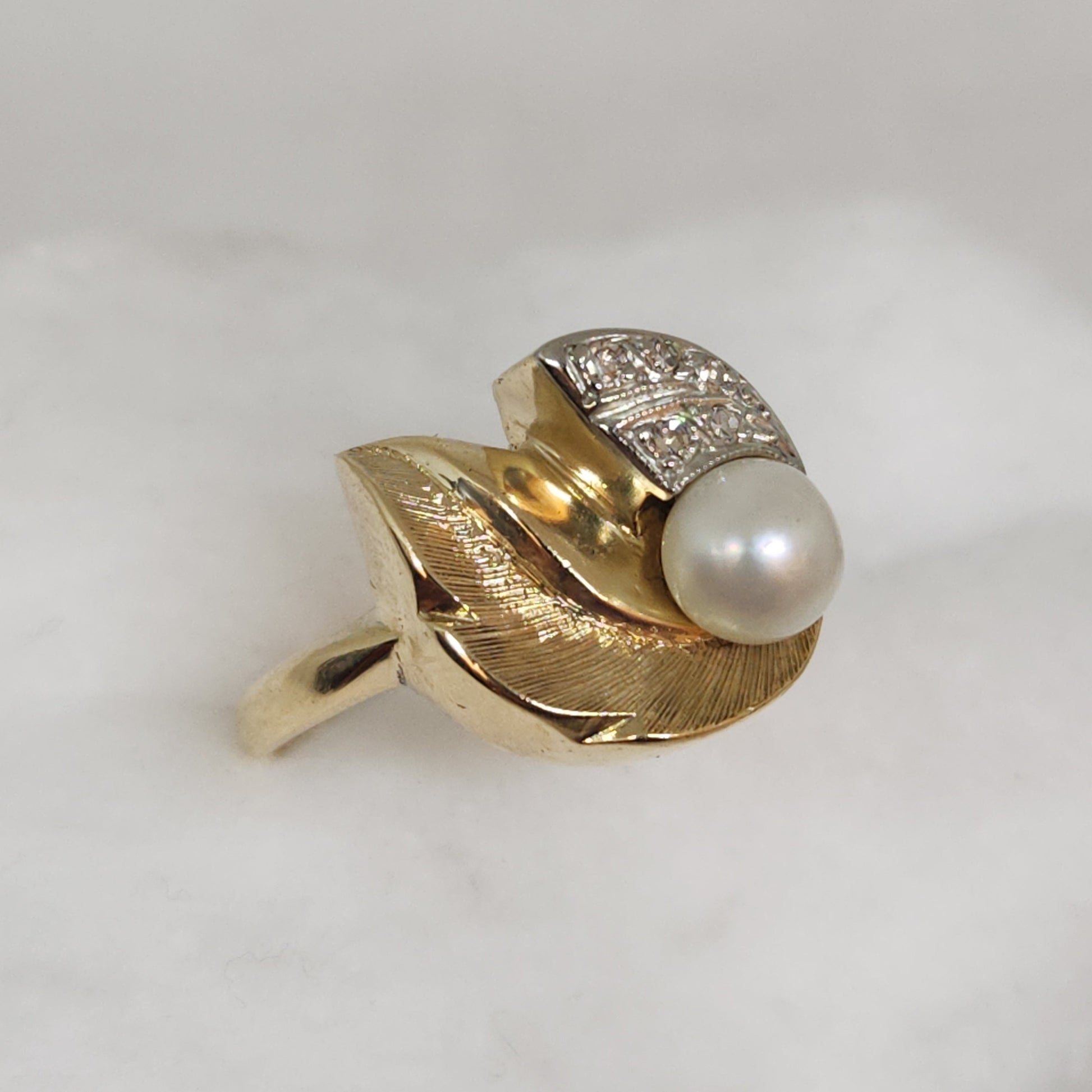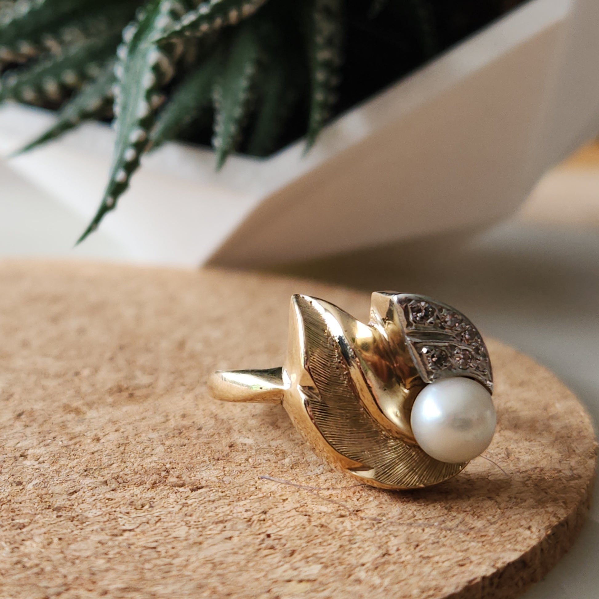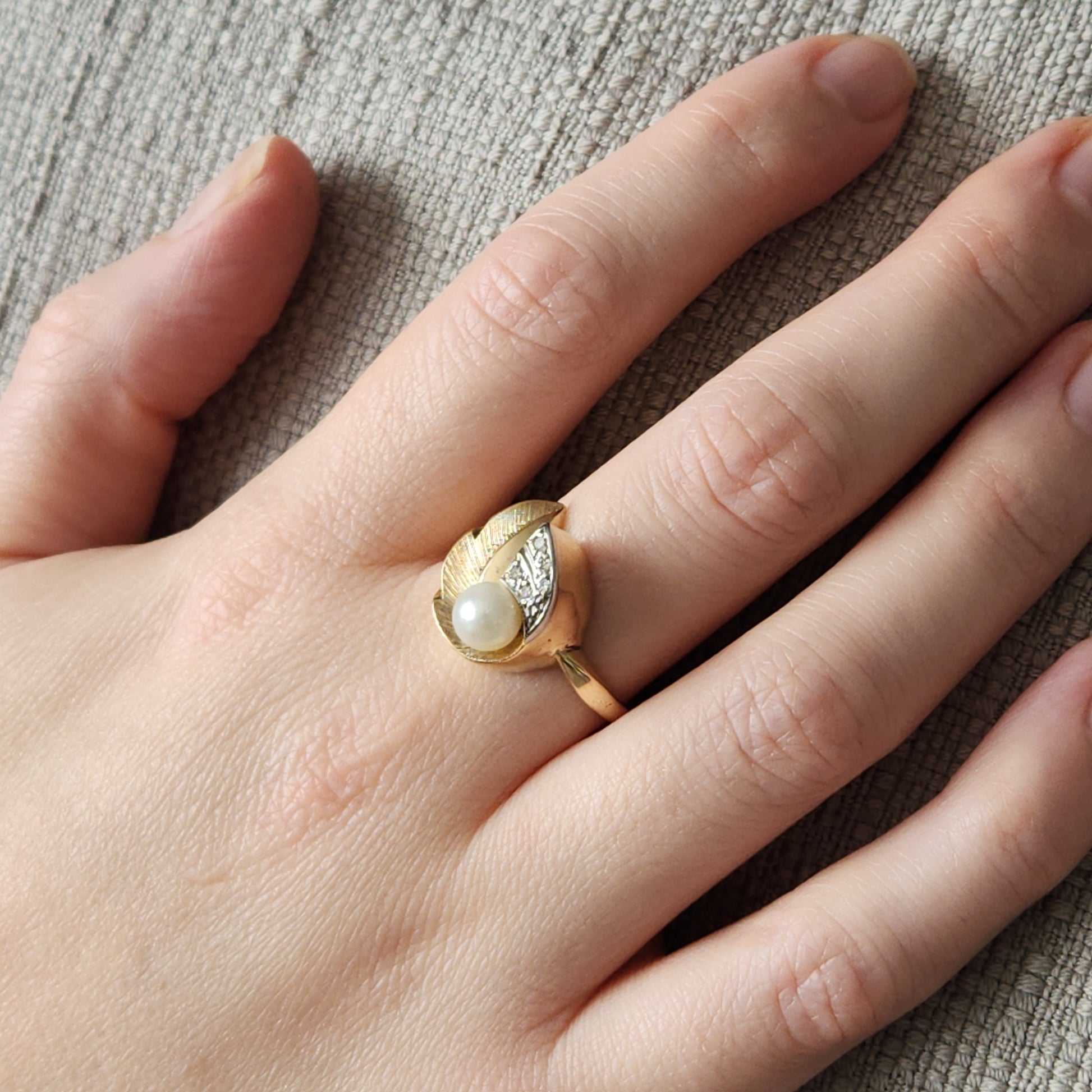 A little fantasy and history in this one. The leaf has beautiful hand engraved texture, as well as the detail surrounding the diamonds. The goldsmith creating this one had a nature vision that flows across the leaf. Circa 1950's.