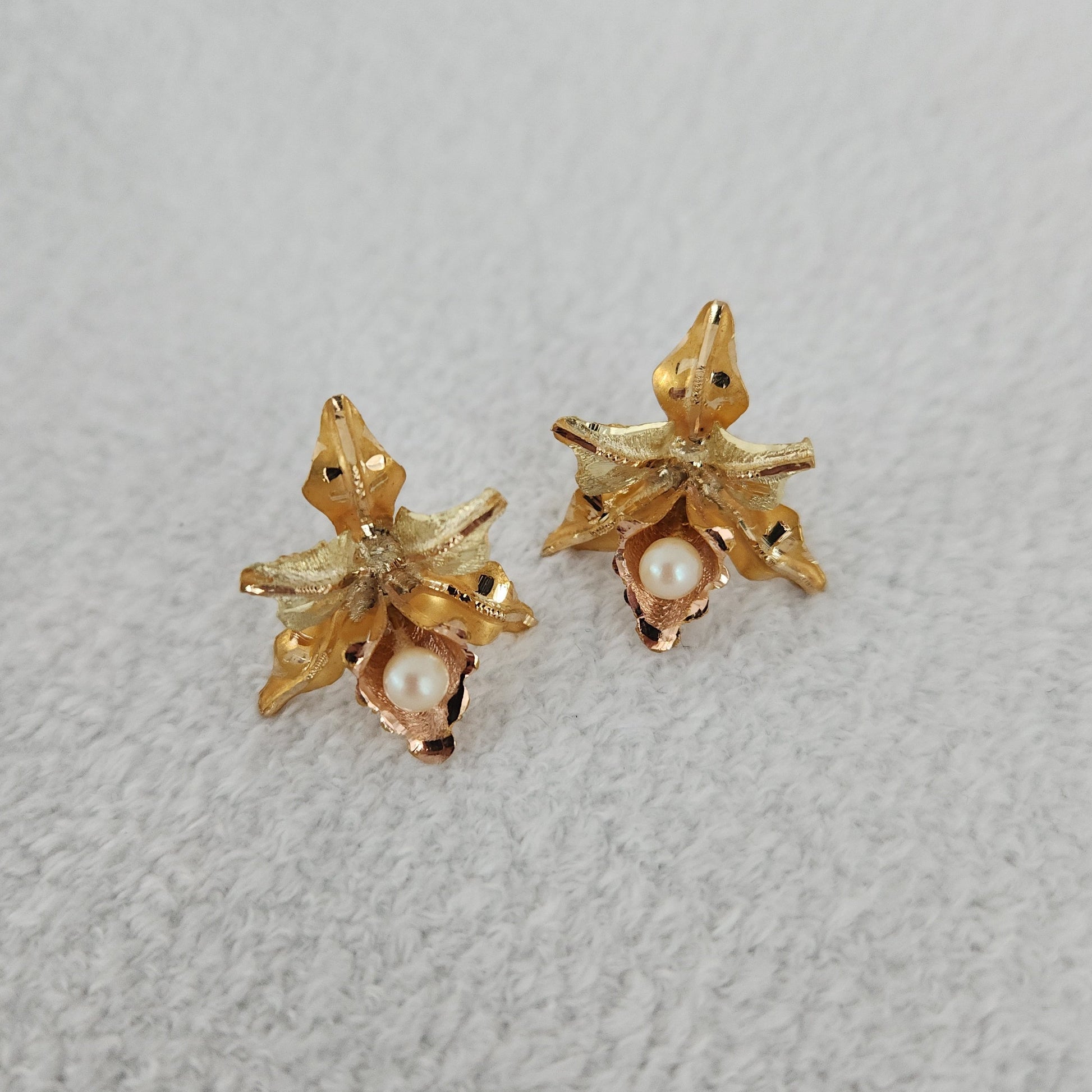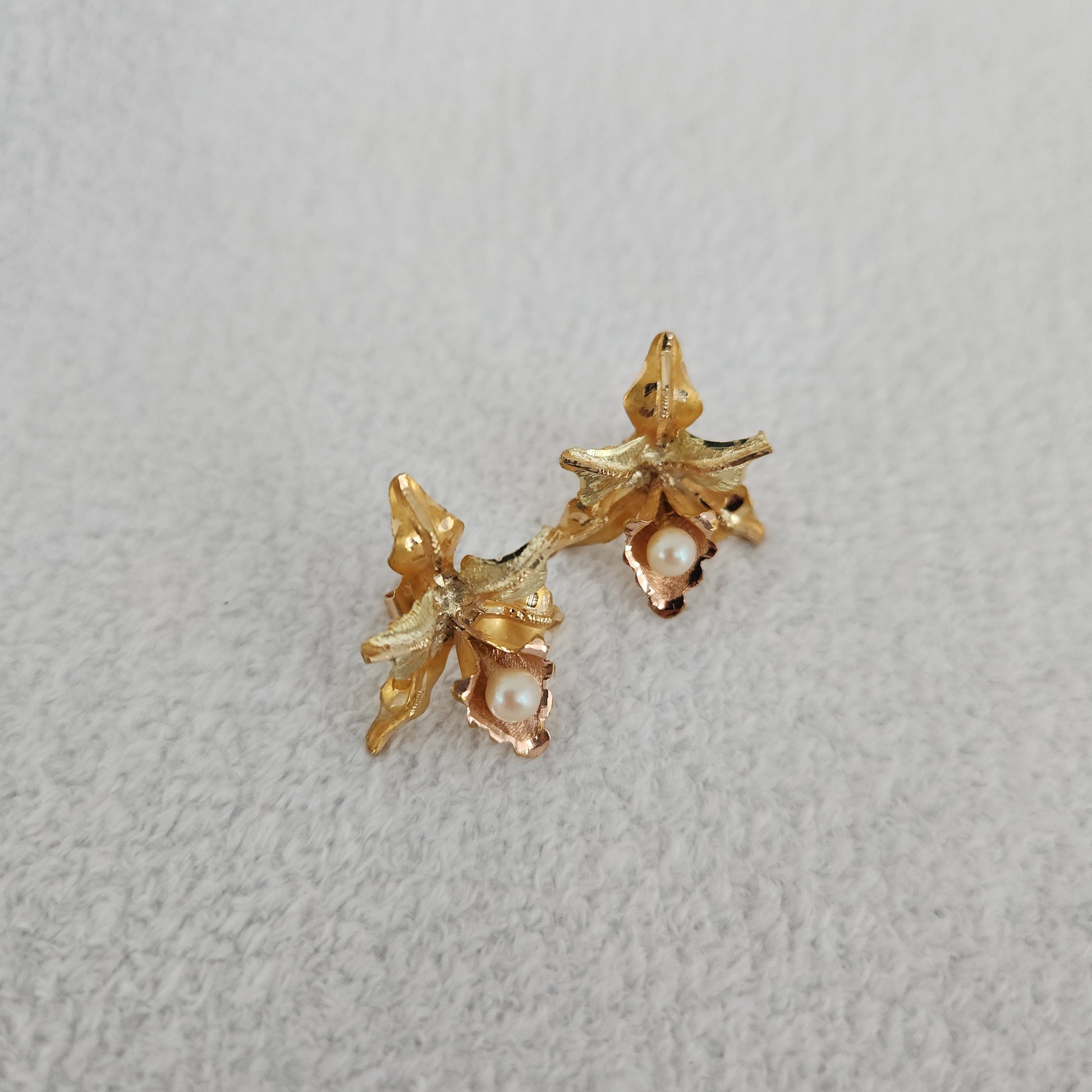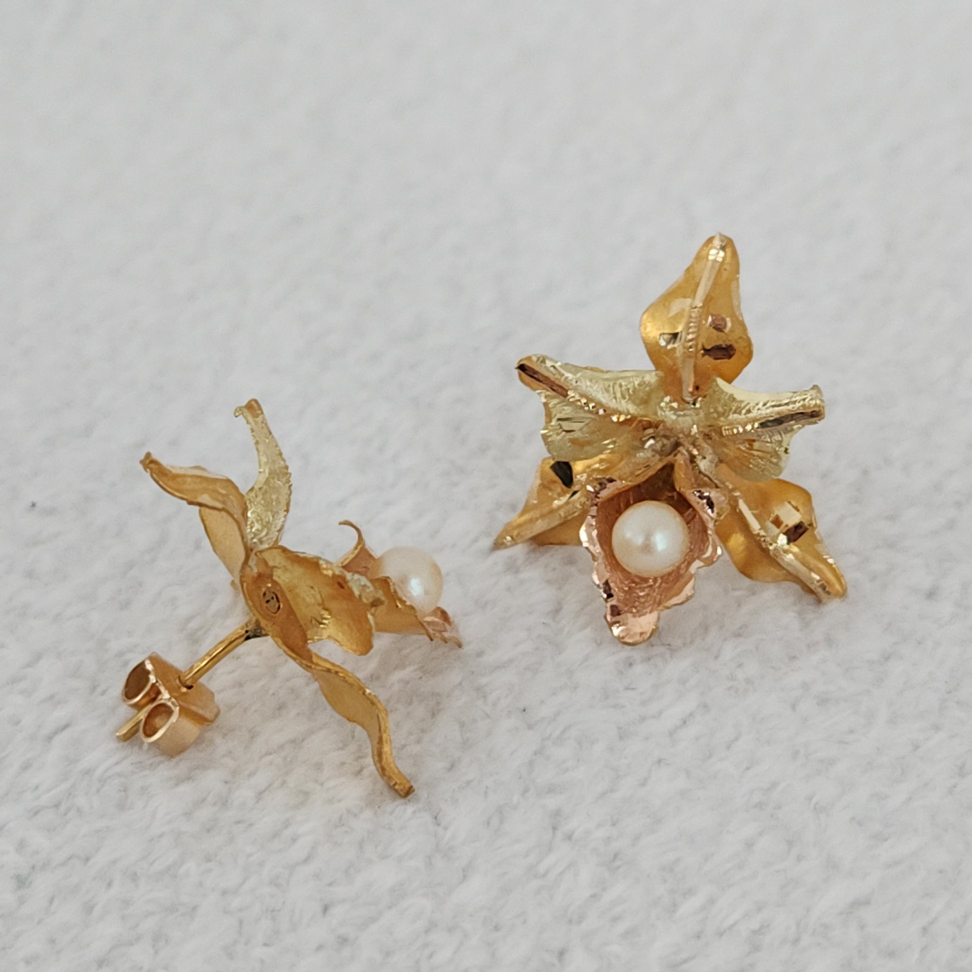 A pair of detailed realistic orchids, each anointed with a small akoya pearl that hangs as a dewdrop on the lip of each lower petal. The dimension these have...eye-catching from any angle. These earrings also incorporate three different hues of gold, rose gold, yellow gold, and a cooler toned yellow gold.