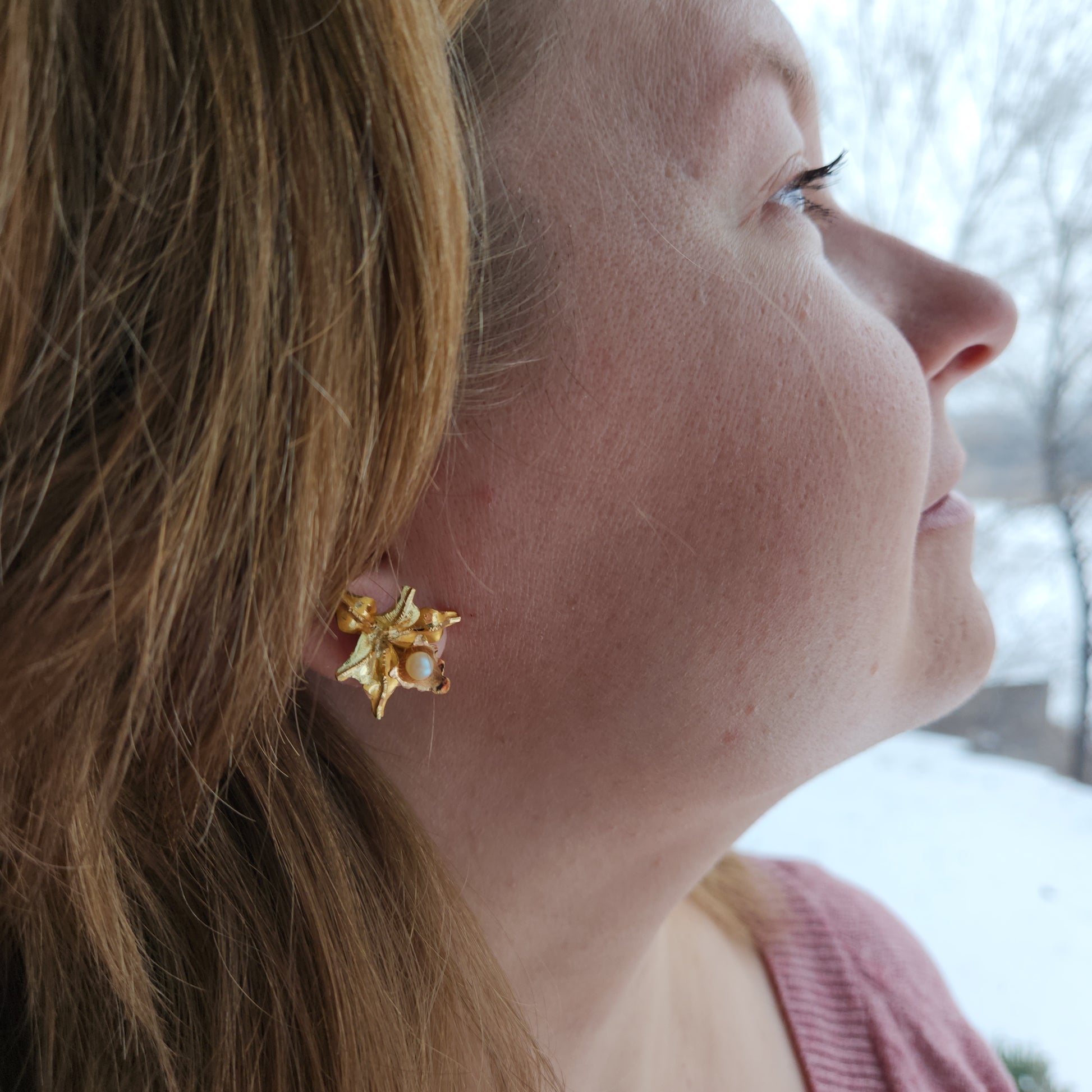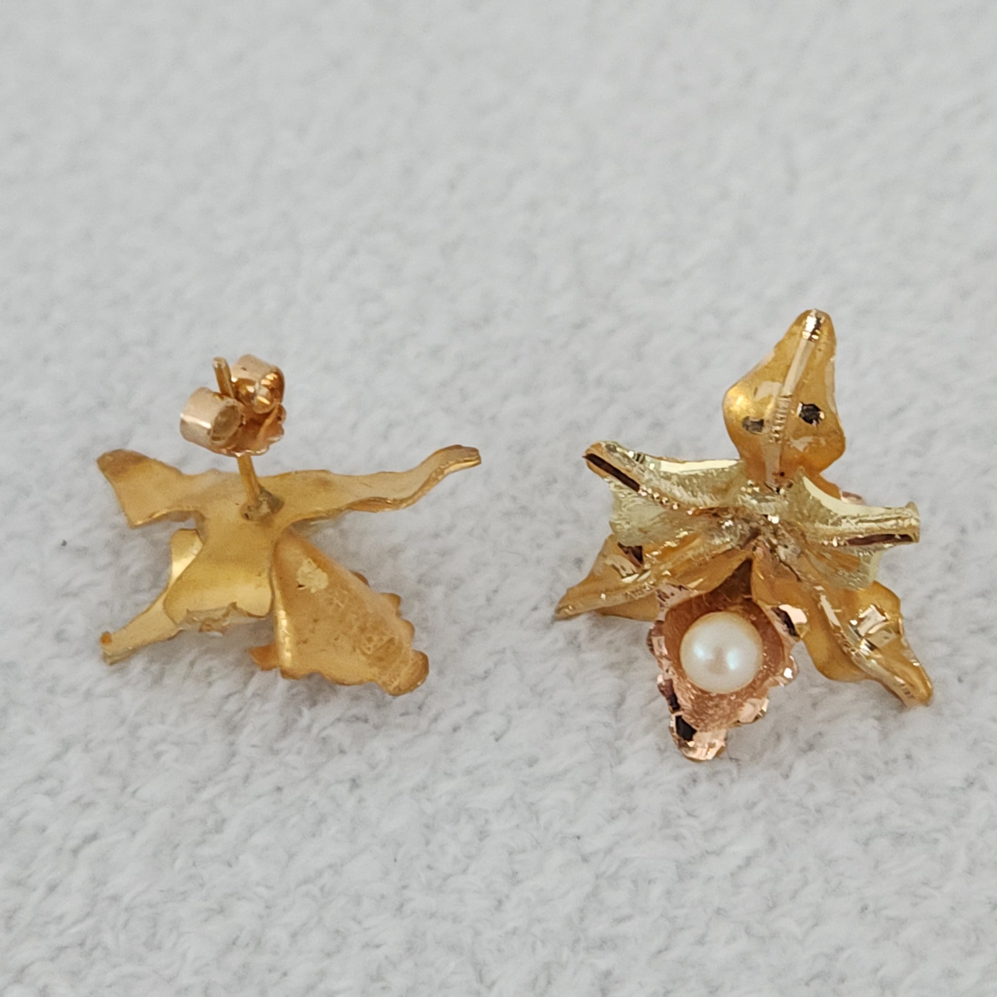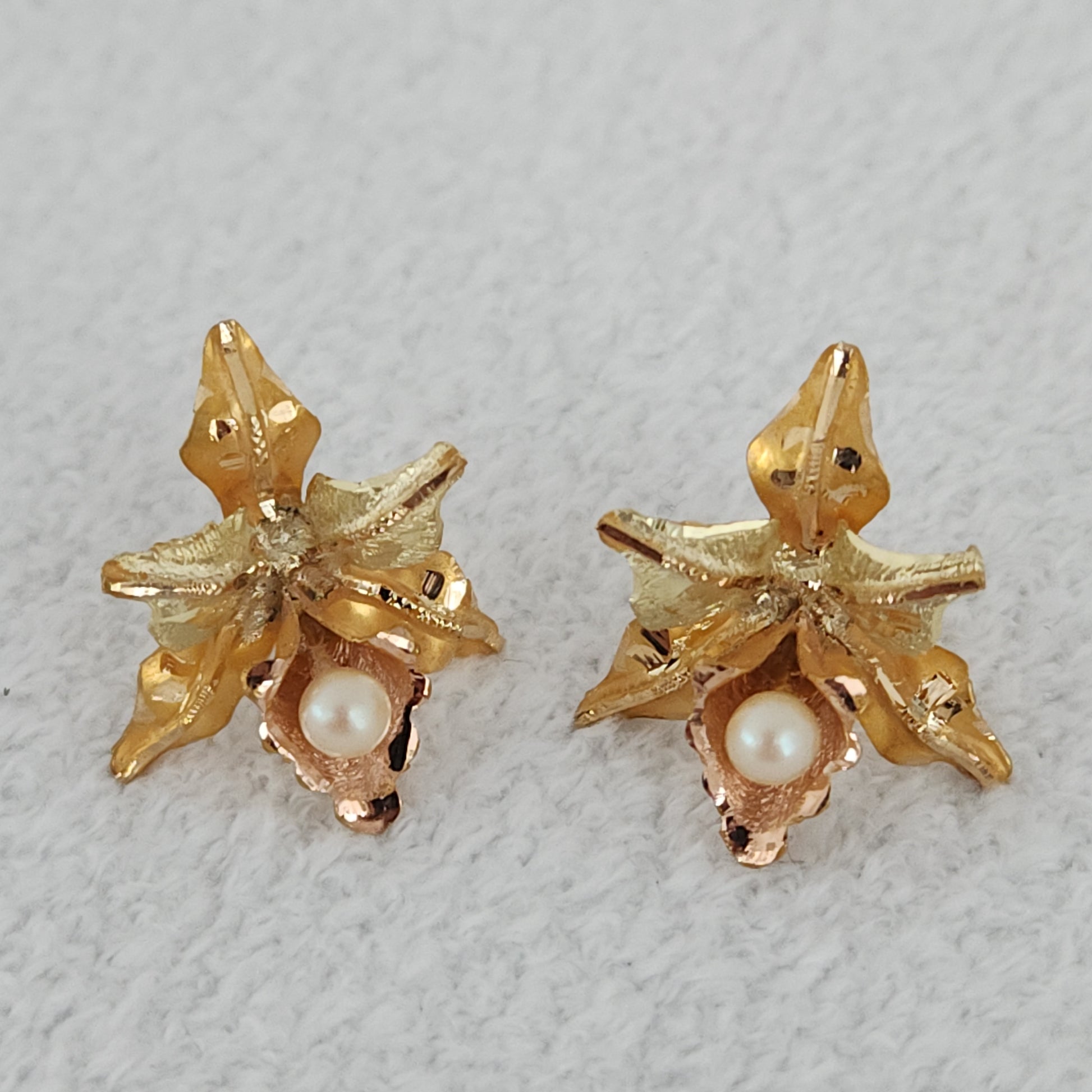 A pair of detailed realistic orchids, each anointed with a small akoya pearl that hangs as a dewdrop on the lip of each lower petal. The dimension these have...eye-catching from any angle. These earrings also incorporate three different hues of gold, rose gold, yellow gold, and a cooler toned yellow gold.