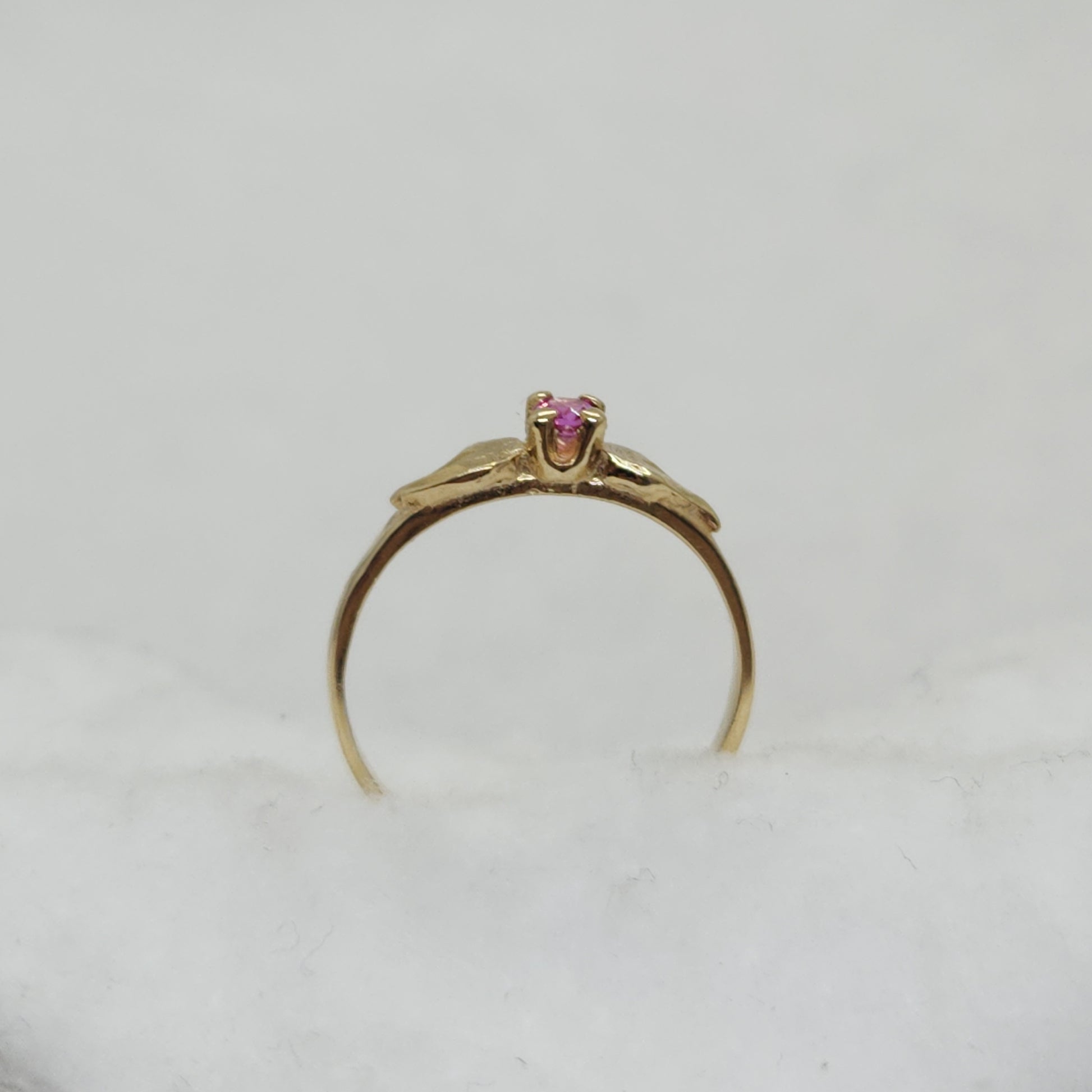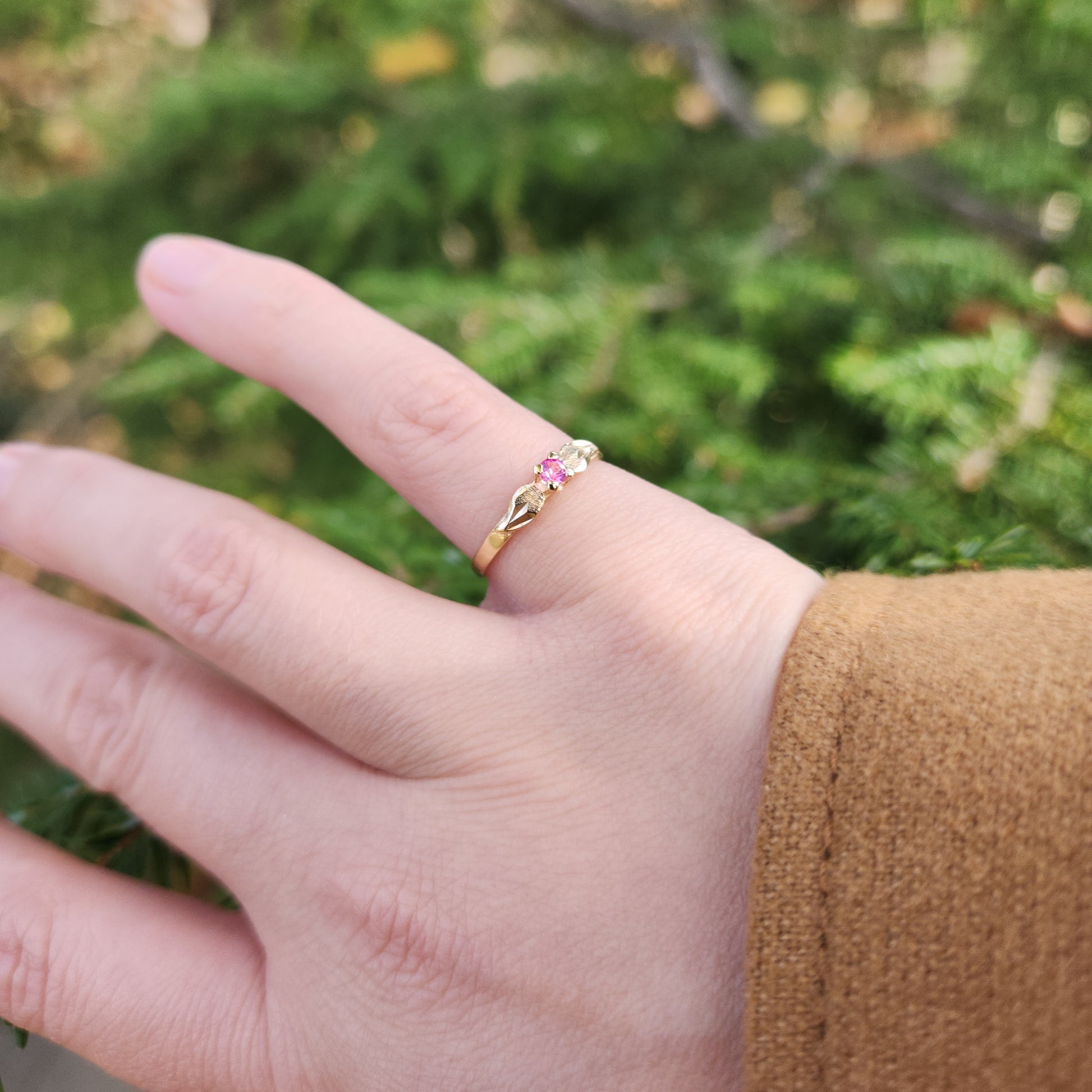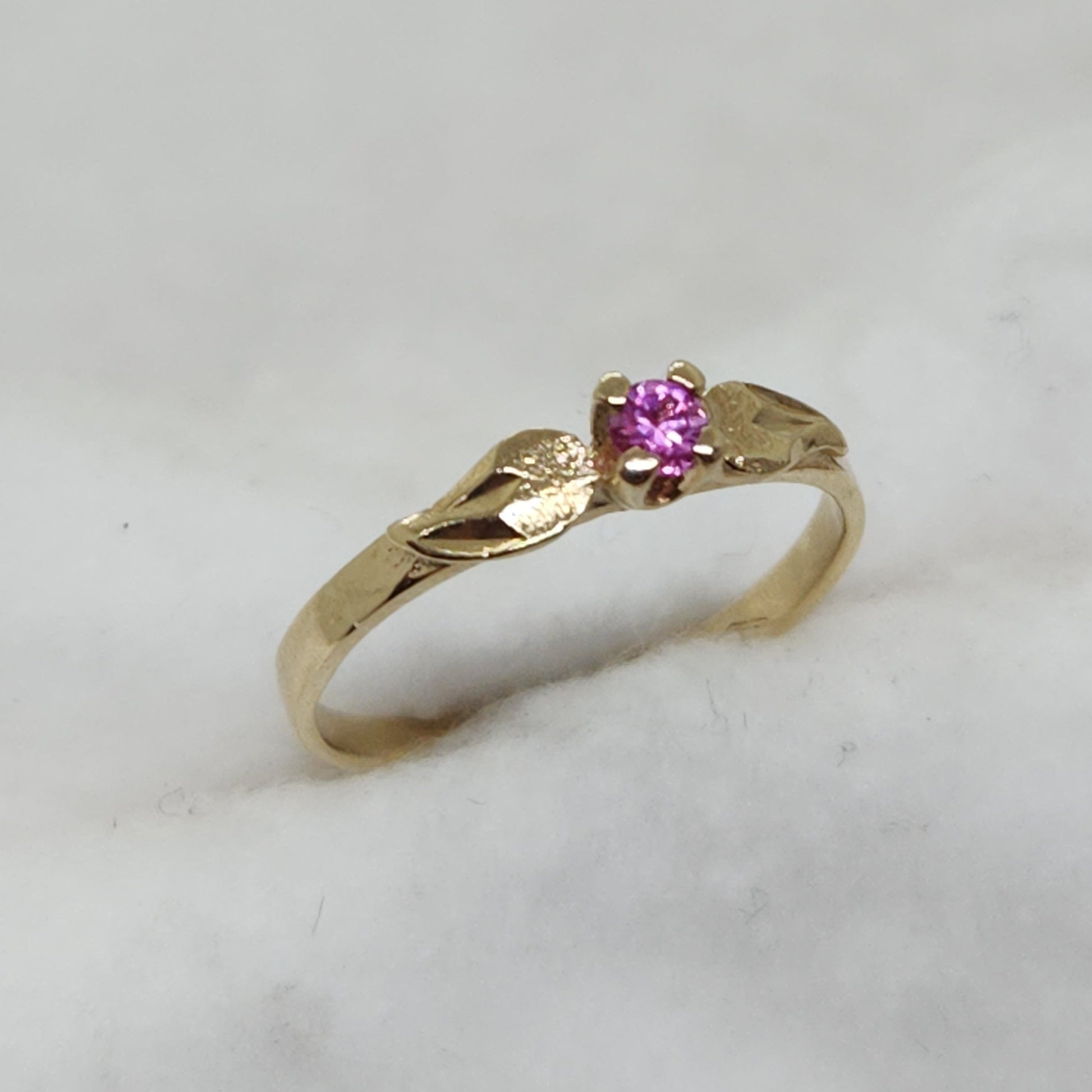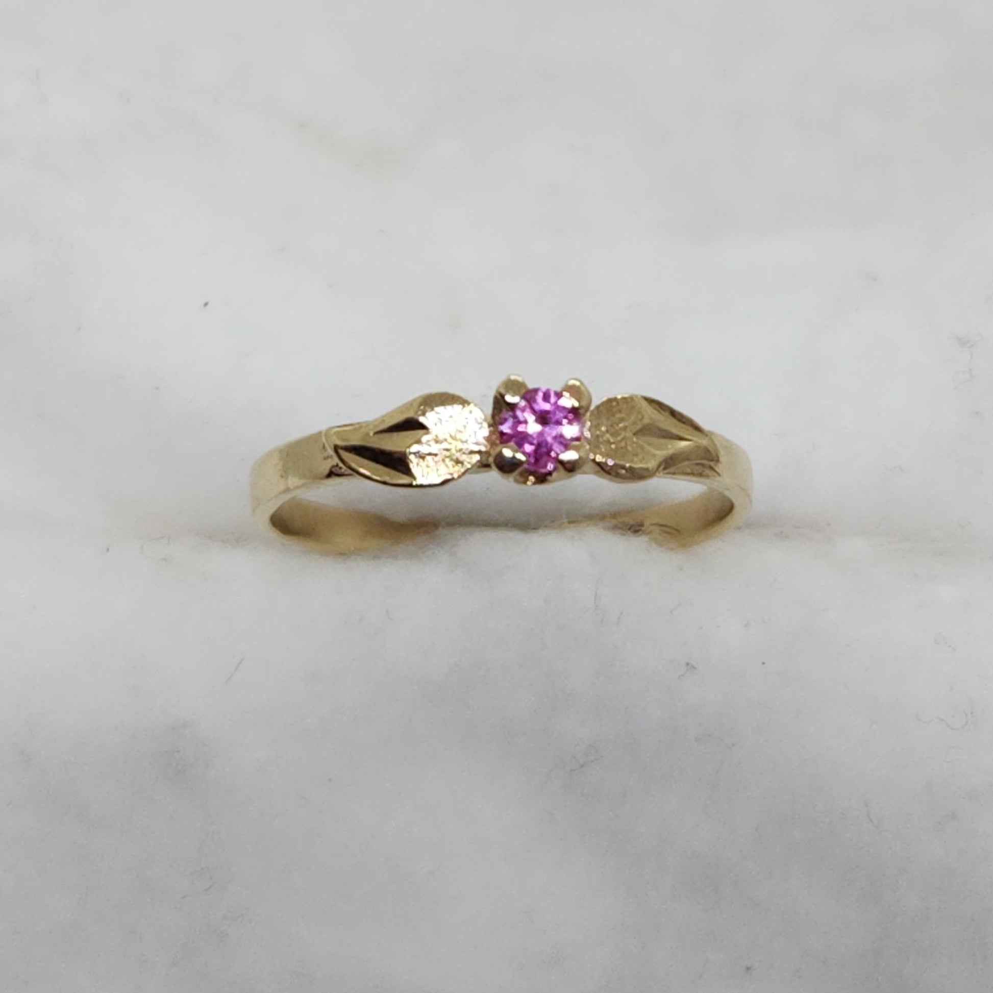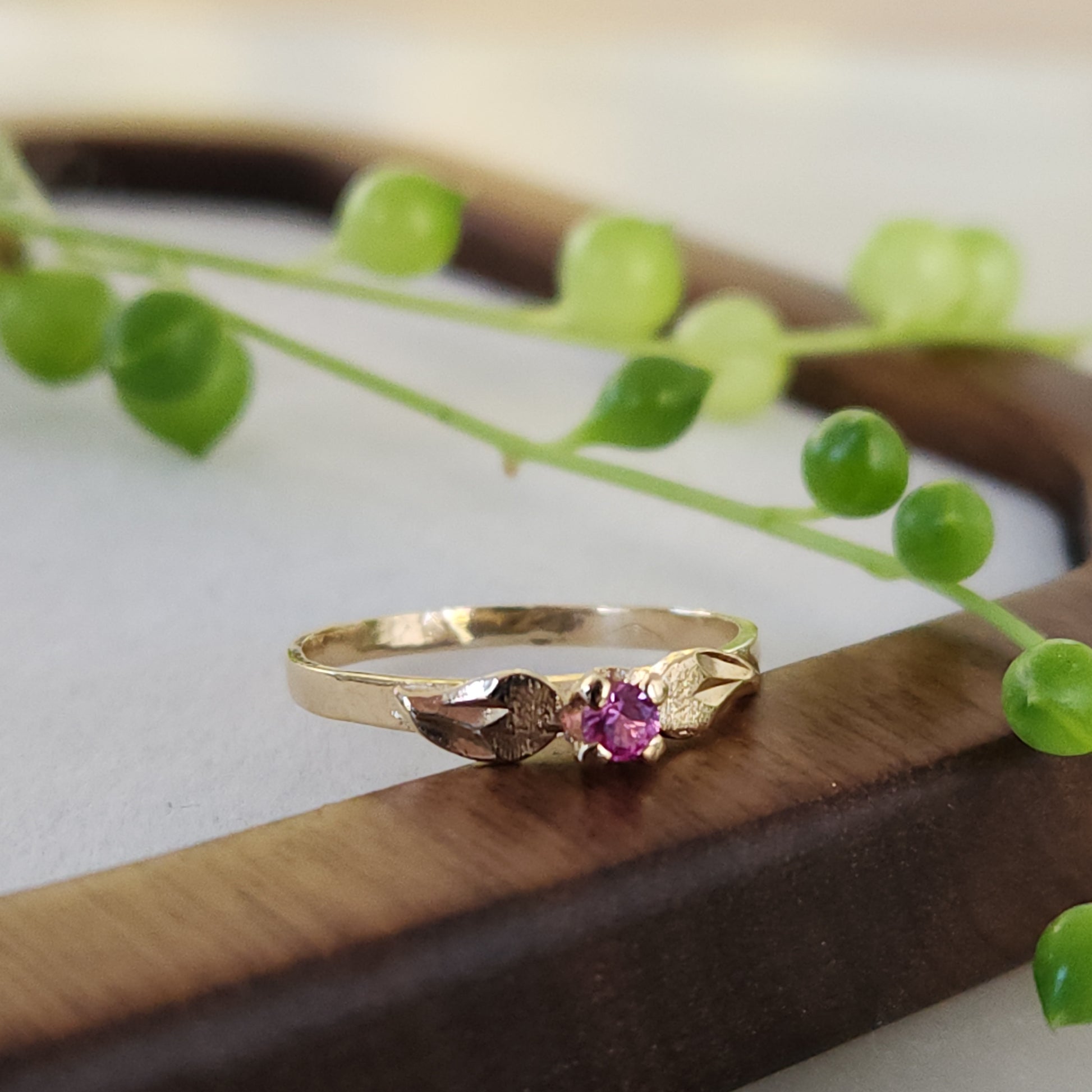 A pinky ring for the littlest finger! The soft pink stone is like a little flower with golden leaves on each side.