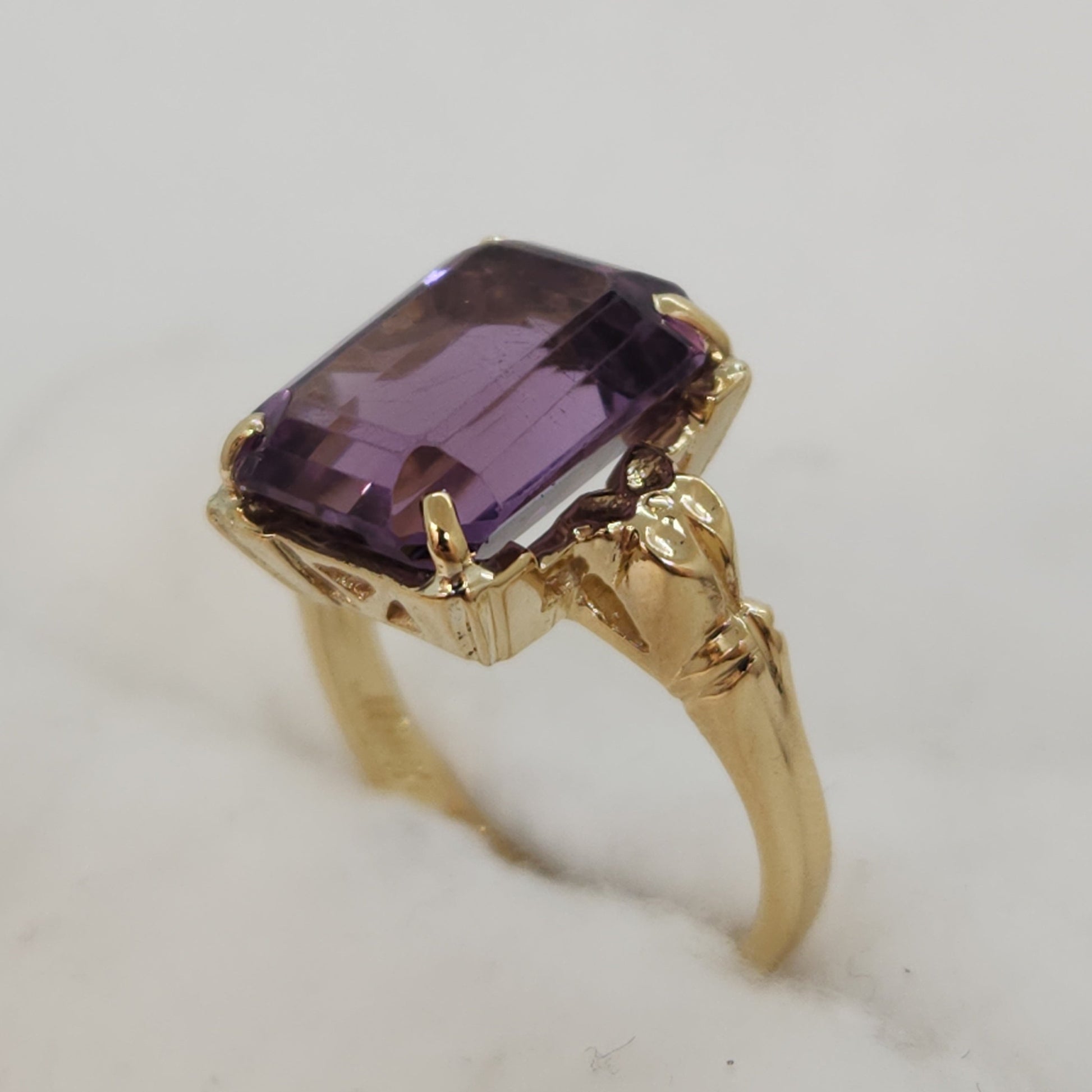 A gorgeous and striking amethyst, it's a warm shade of violet. With this sizing, it's a statement piece. But oh, what's that...that little detail on the sides...it's a little golden flower on each side. The perfect little detail you get to enjoy each time you stop to admire this beauty on your hand. Amethyst is the February birthstone.