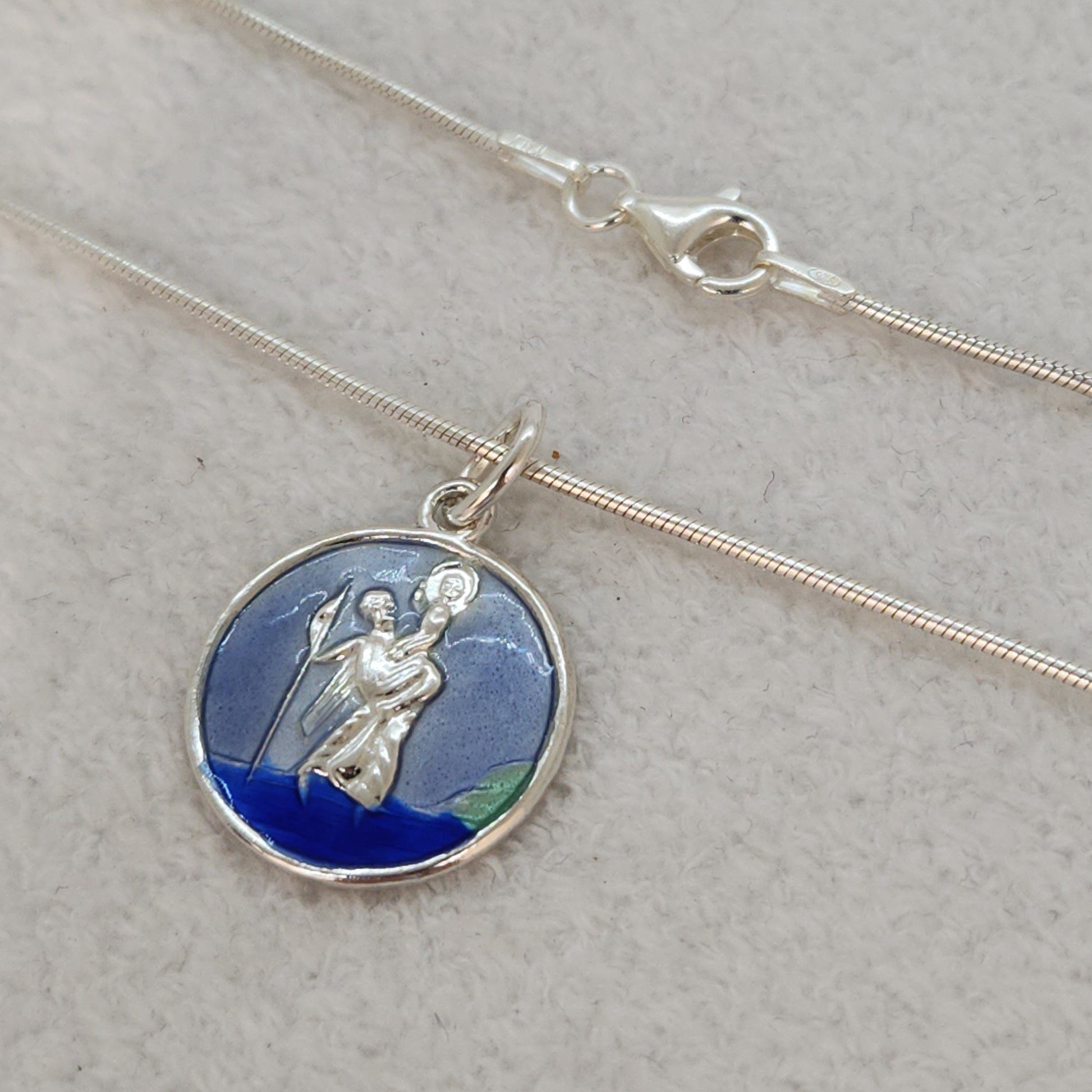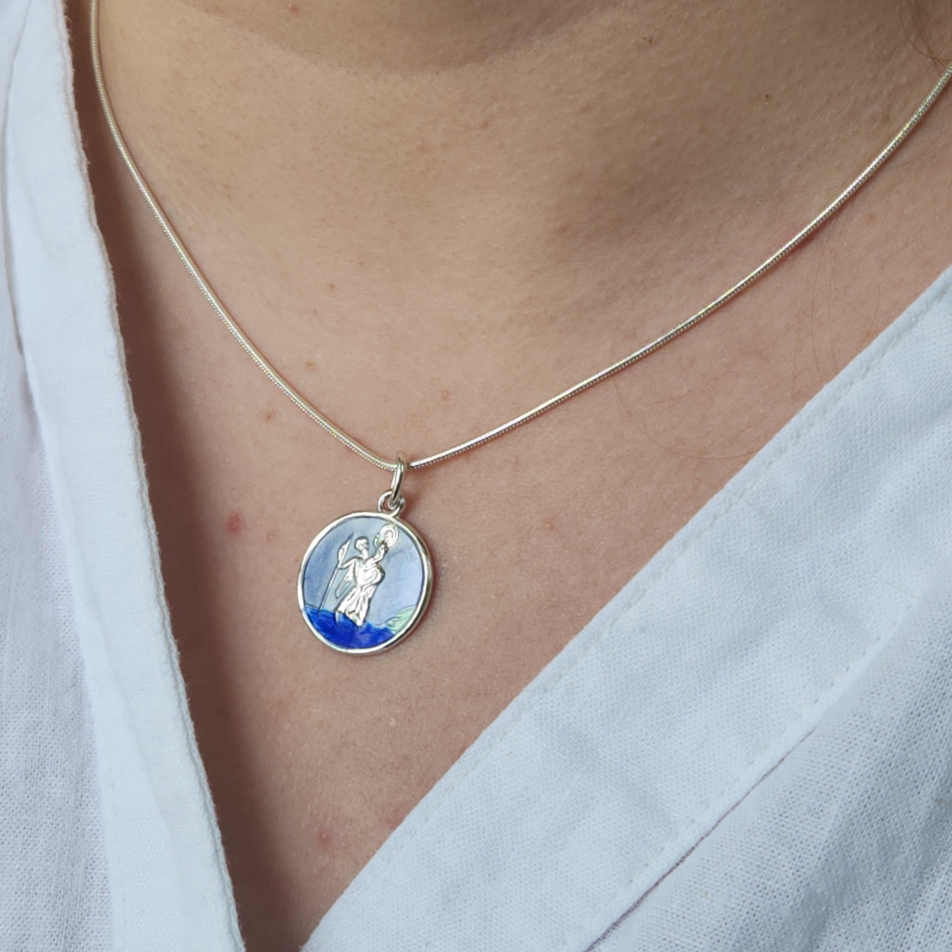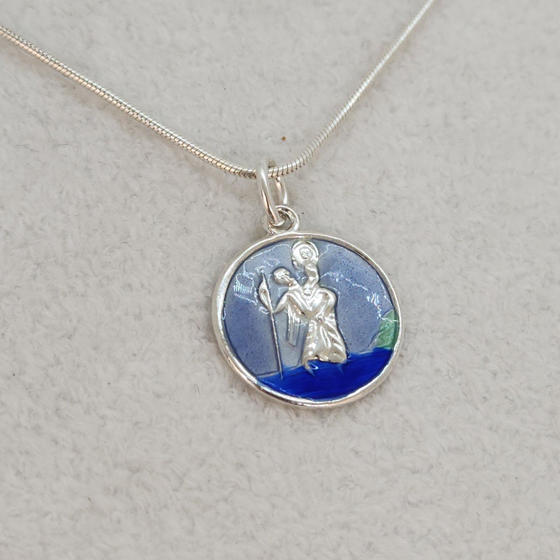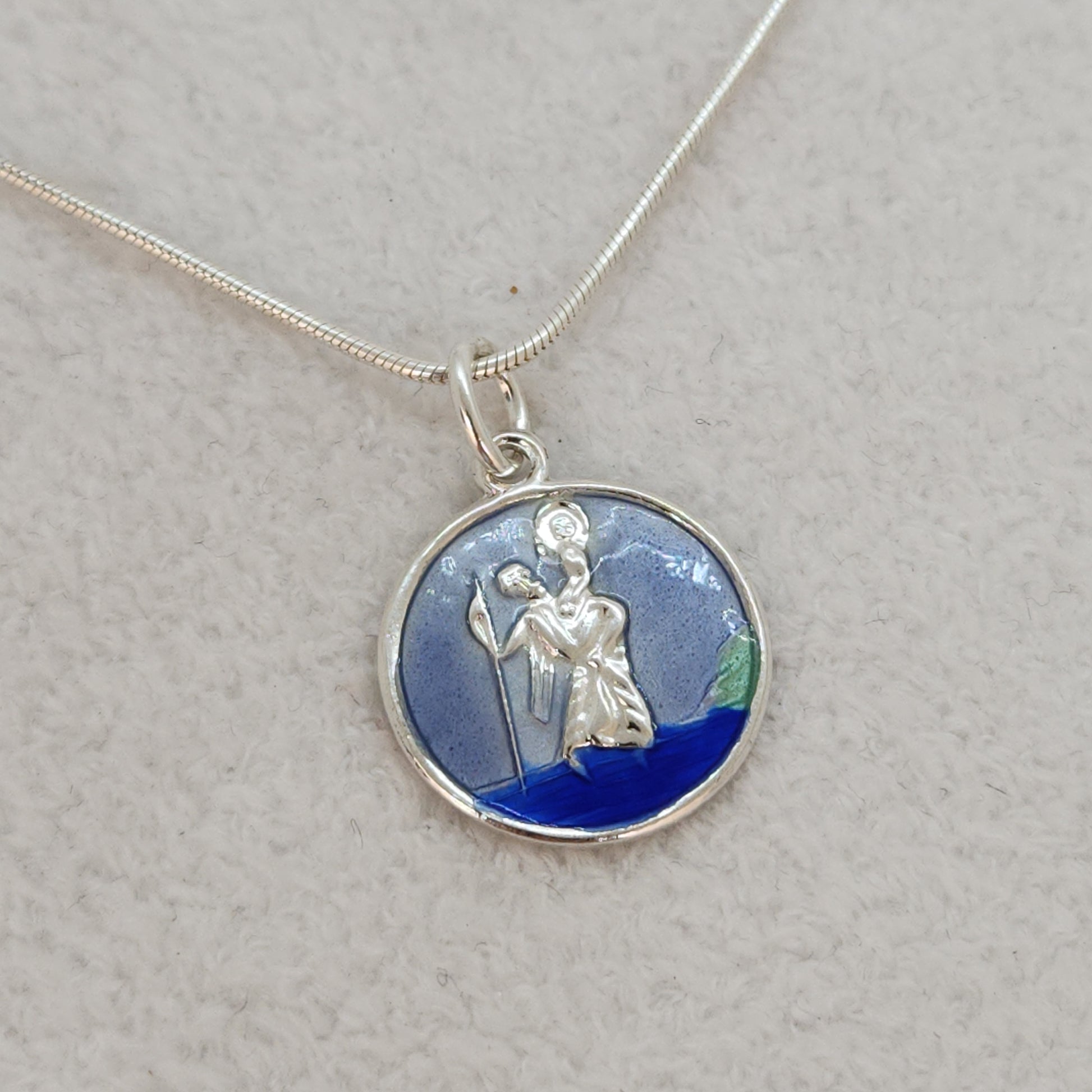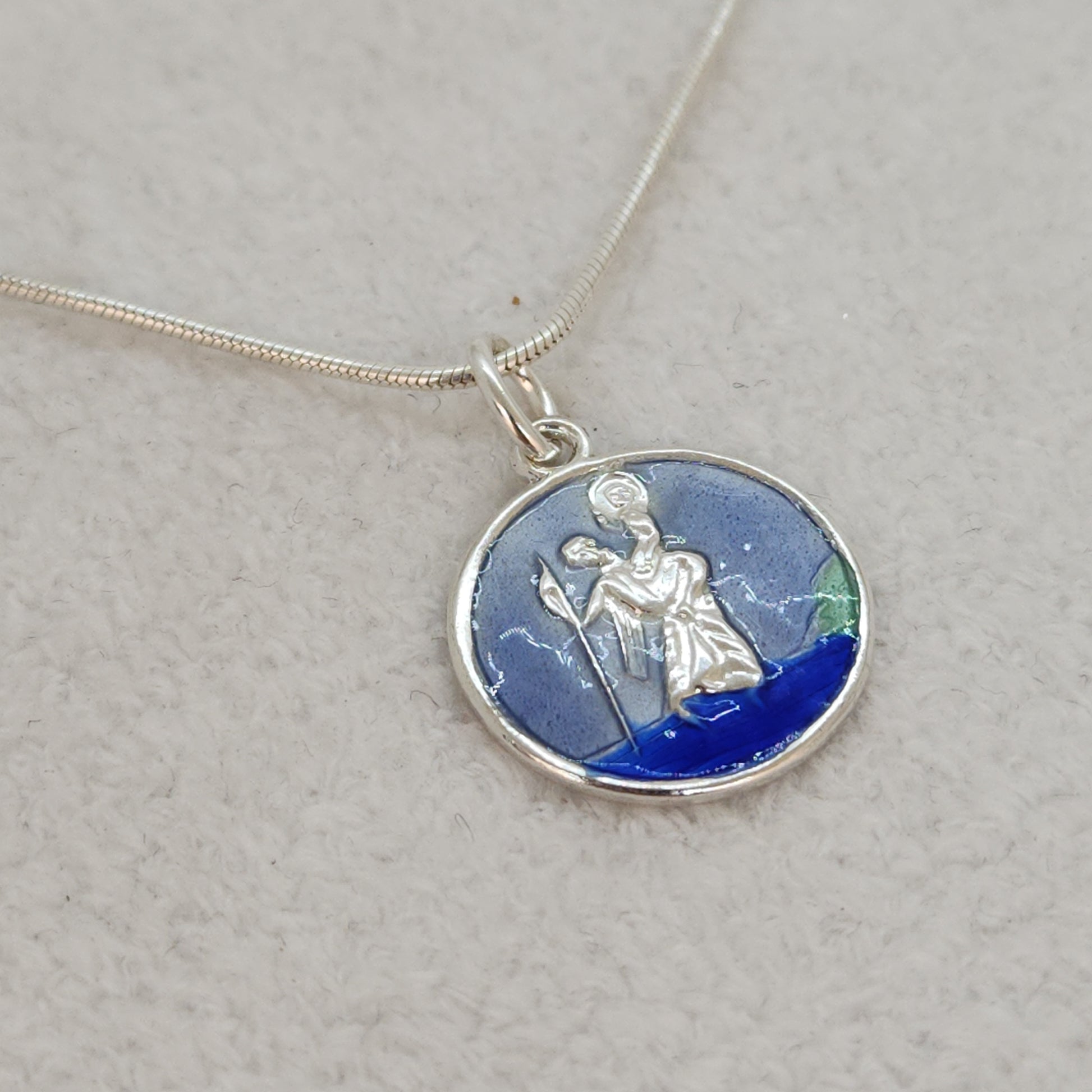 A silver St. Christopher's pendant, this is a perfect gift for someone who is going on a trip, as a symbol of safety in their travels. The colorful enamel details create a striking look!