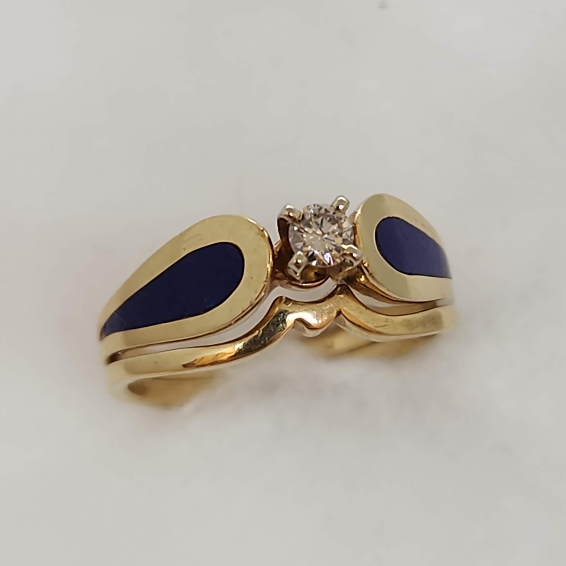 This unique piece, featuring a diamond inlaid with Lapis is perfect for someone that wants a ring that is distinctive. The lapis is a deep cobalt blue/purple tone that leans towards the darker range. A custom fitted matching band completes this special wedding set.