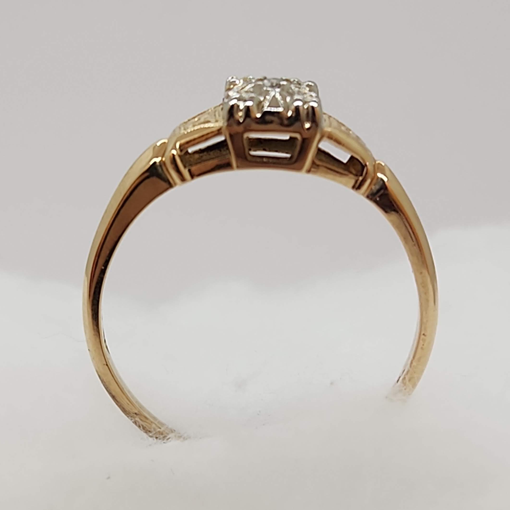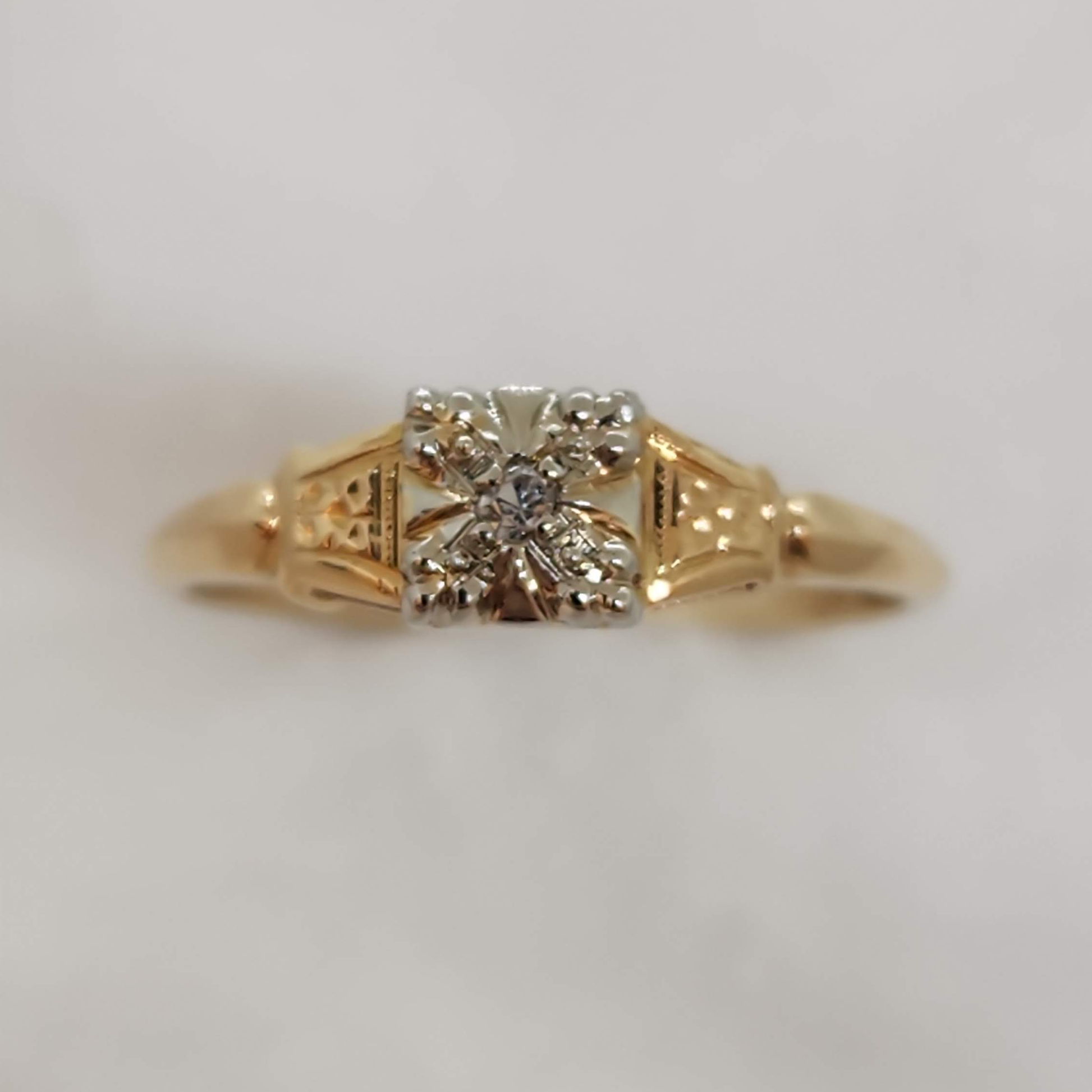 This vintage ring is rife with small details! Engraving along the top and sides, combined with a square plaque setting for the diamond are core 50's jewellery elements. Originally an engagement ring, today this would make a lovely promise ring or right hand ring, adding some sparkle to your hand!