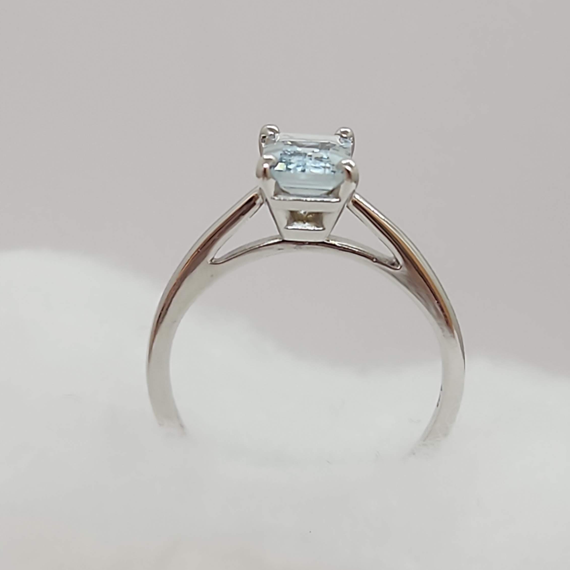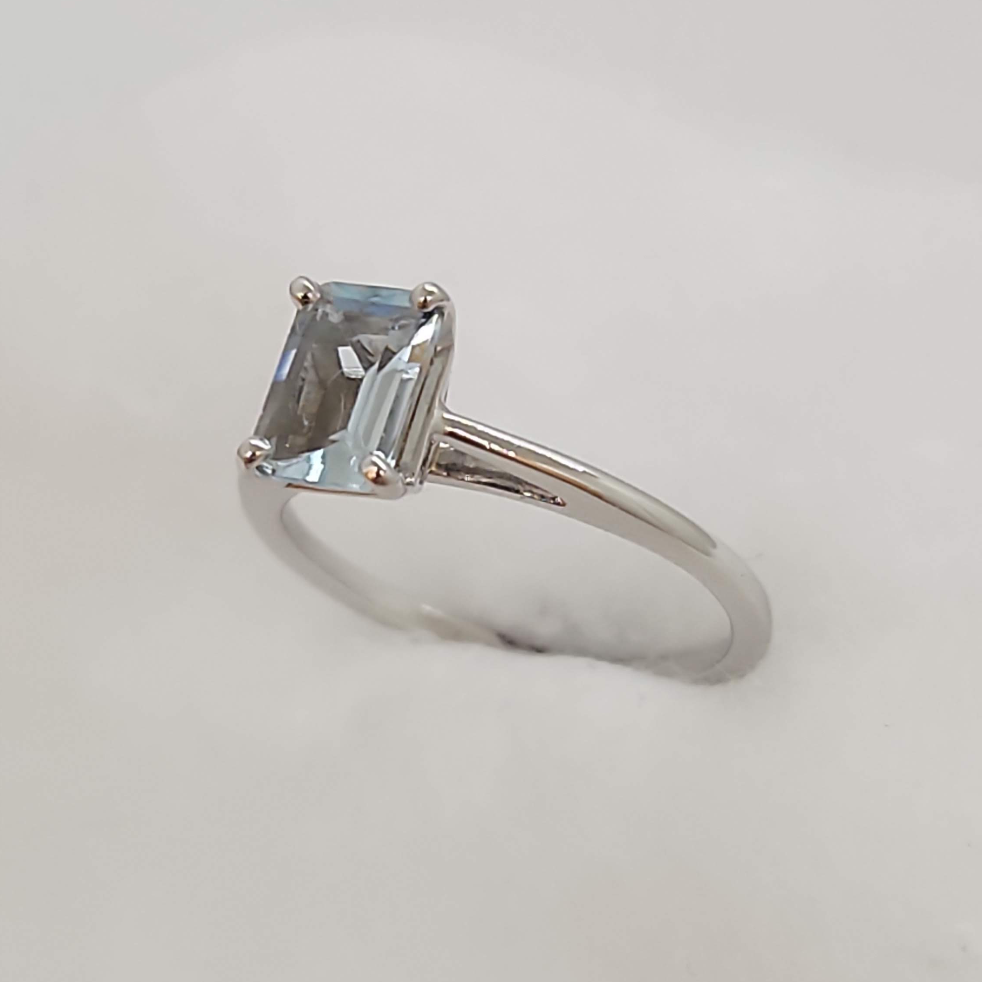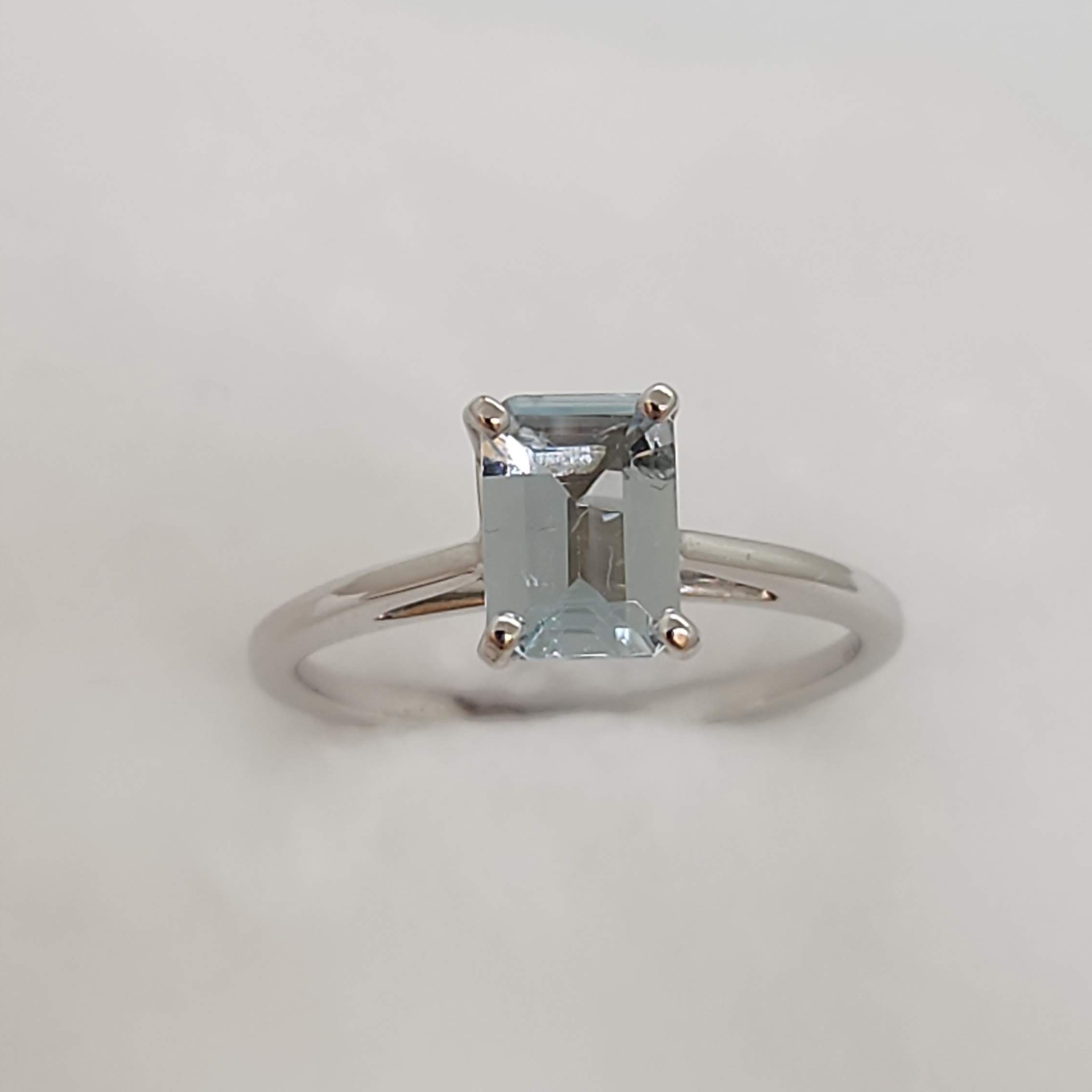 The serenely colored aquamarine invokes the tranquility of its namesake, the sea. In fact, the name “aquamarine” is derived from the Latin word aqua, meaning water, and marina, meaning the sea. This is an emerald cut stone, it's sleek band showcases the beauty of this gem. Aquamarine is the March birthstone and the 19th year anniversary stone. This ring could also be a nice alternative to diamond engagement ring.