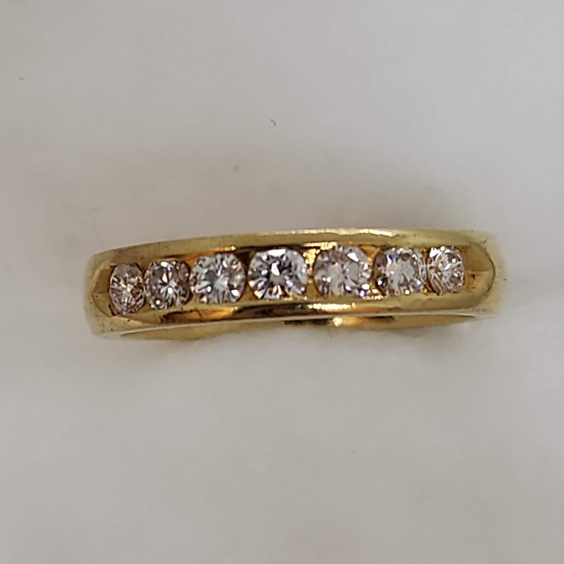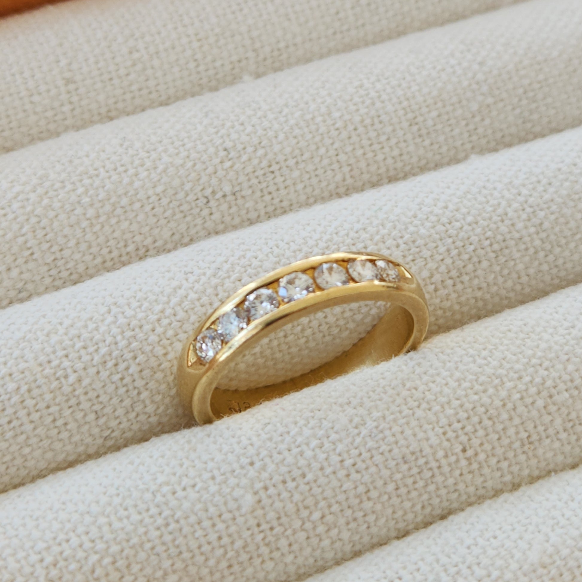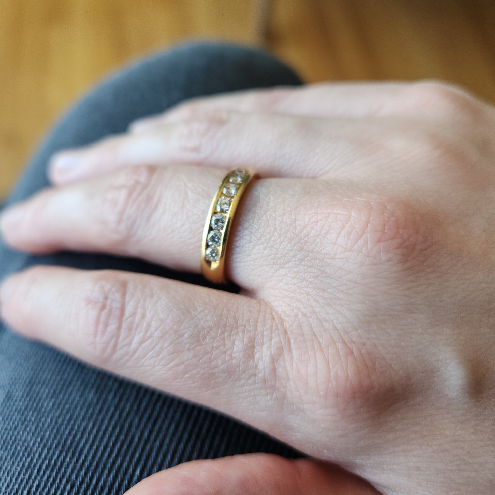 The rich tone of 18kt seem to make the diamonds sparkle just a little more. A classic diamond channel-set band, perfect on it's own or paired with other rings. This would also make a lovely wedding band. Sturdy and low profile, well constructed for an active lifestyle.