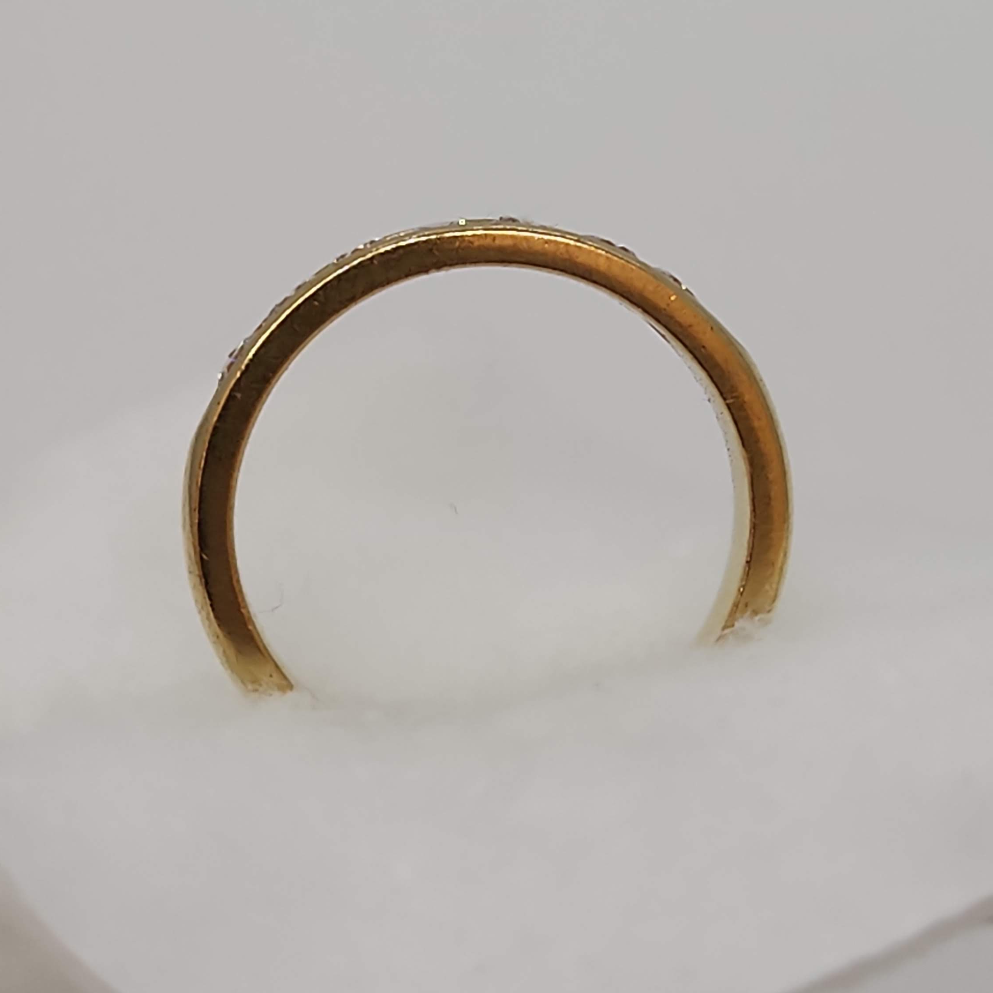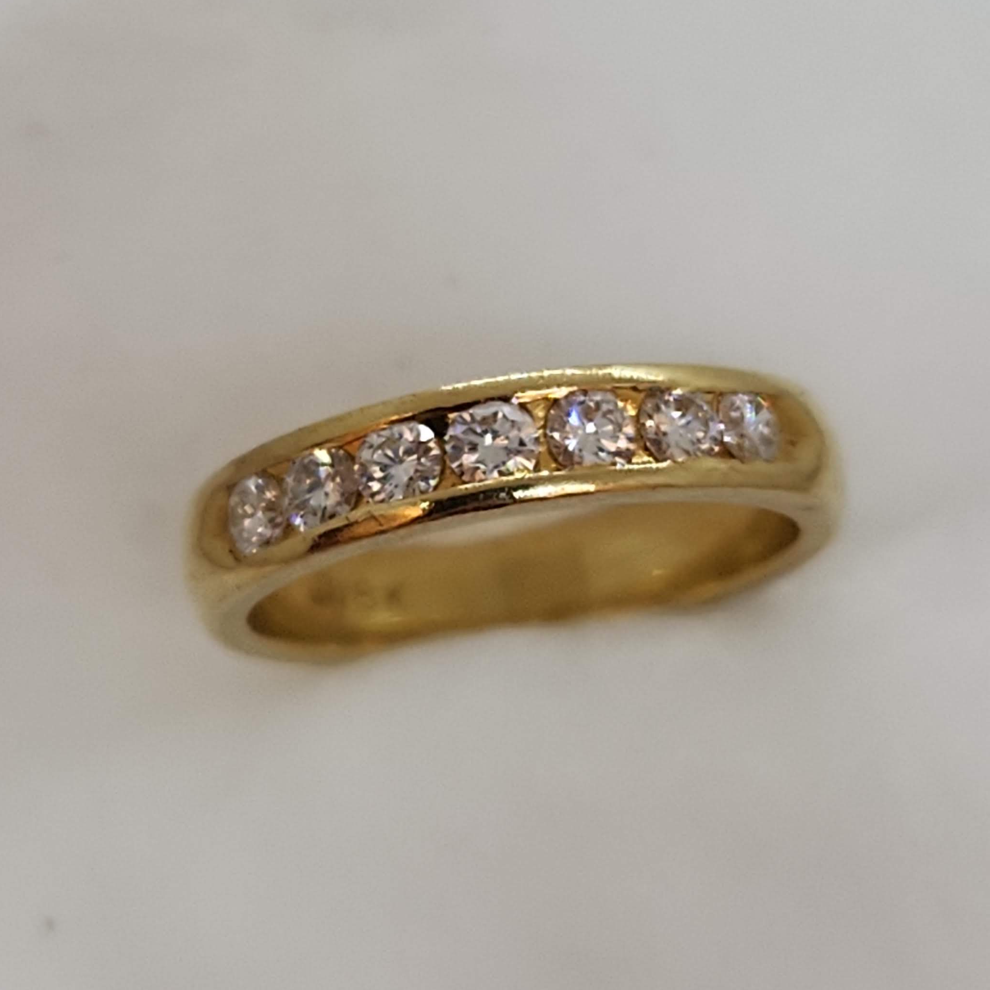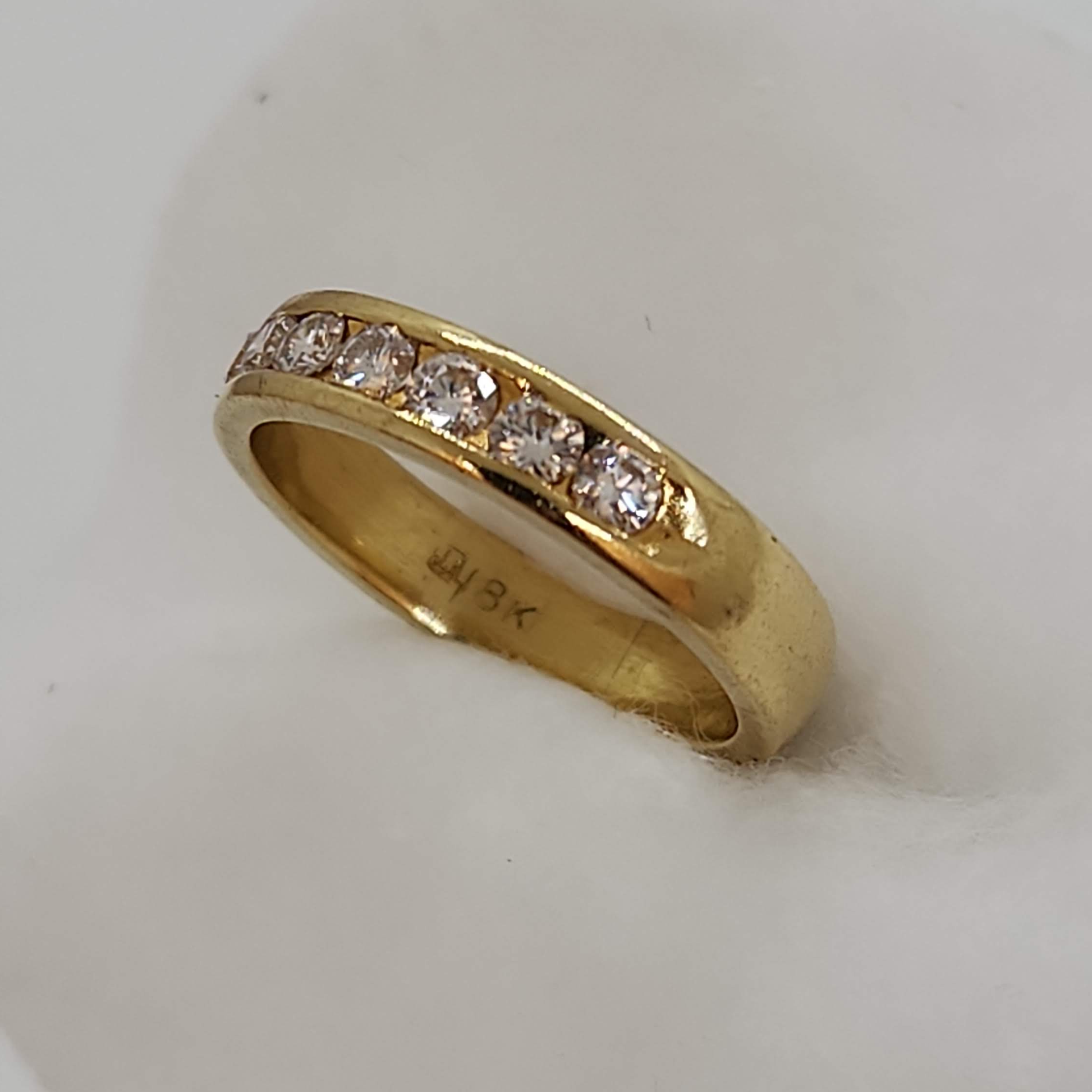 The rich tone of 18kt seem to make the diamonds sparkle just a little more. A classic diamond channel-set band, perfect on it's own or paired with other rings. This would also make a lovely wedding band. Sturdy and low profile, well constructed for an active lifestyle.