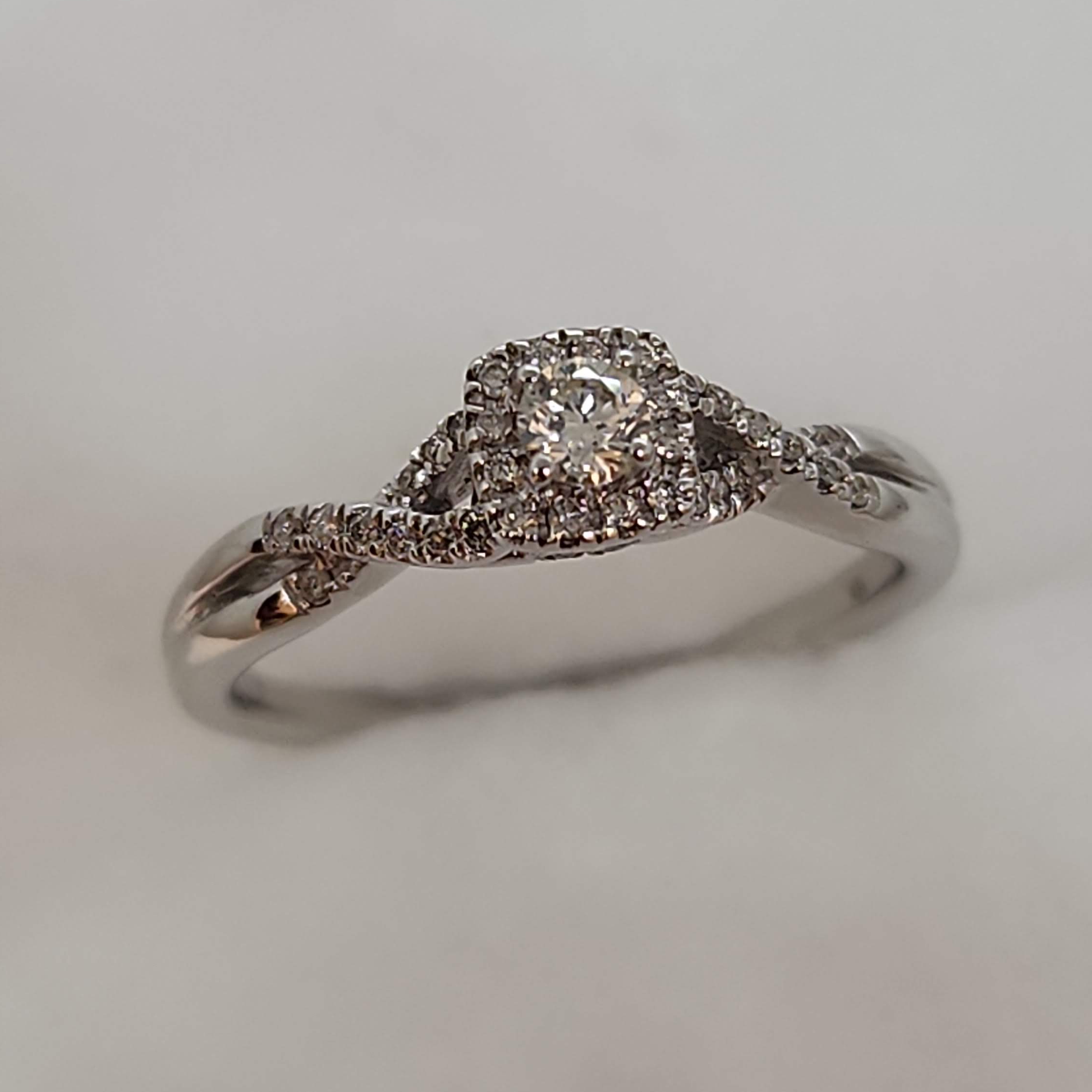 There's no such thing as too much glitter! This ring is full of sparkly details. A halo surrounds the central diamond, an infinity design on the sides is diamond encrusted and don't forget about the diamond detail on the side gallery of this ring. A beautiful engagement or promise ring.