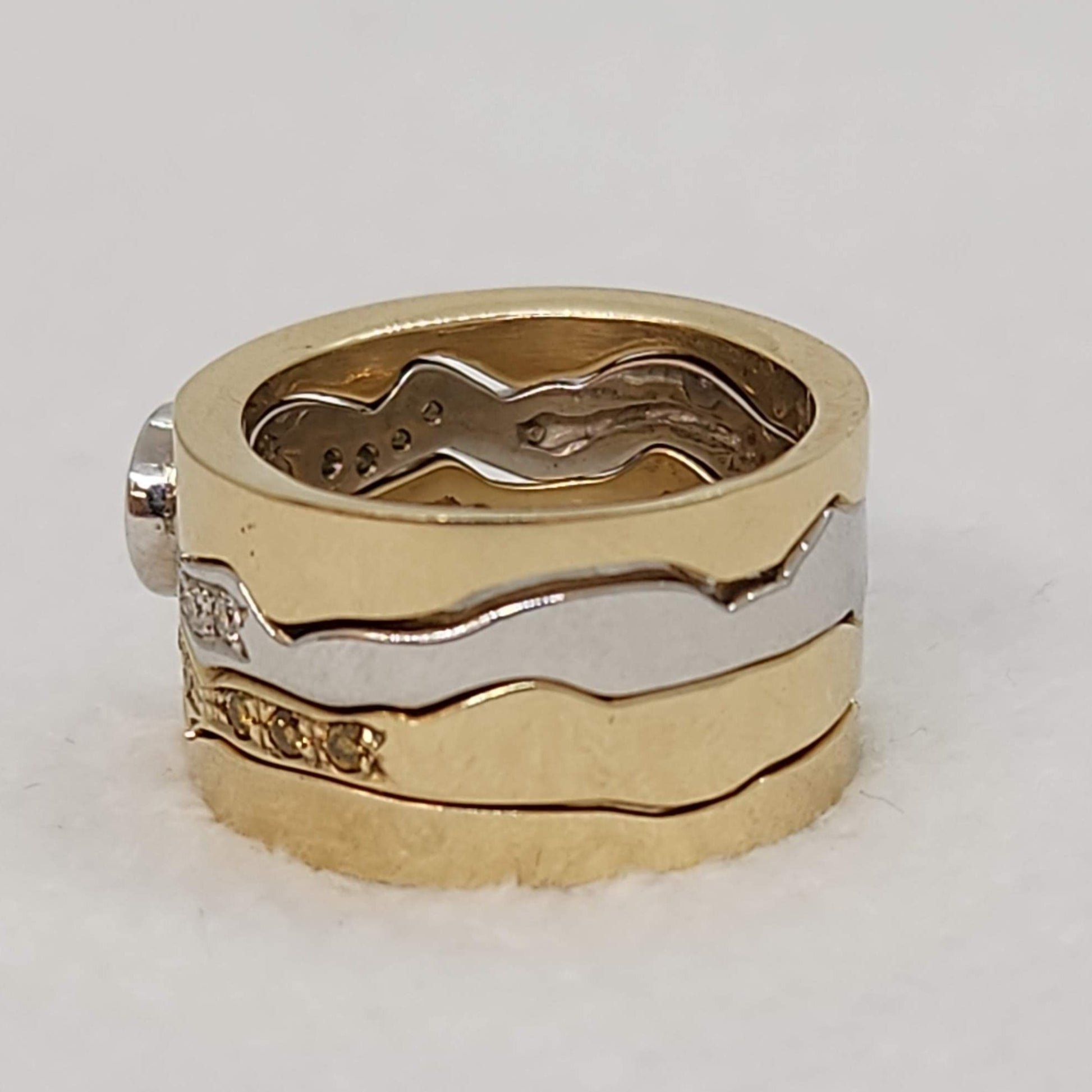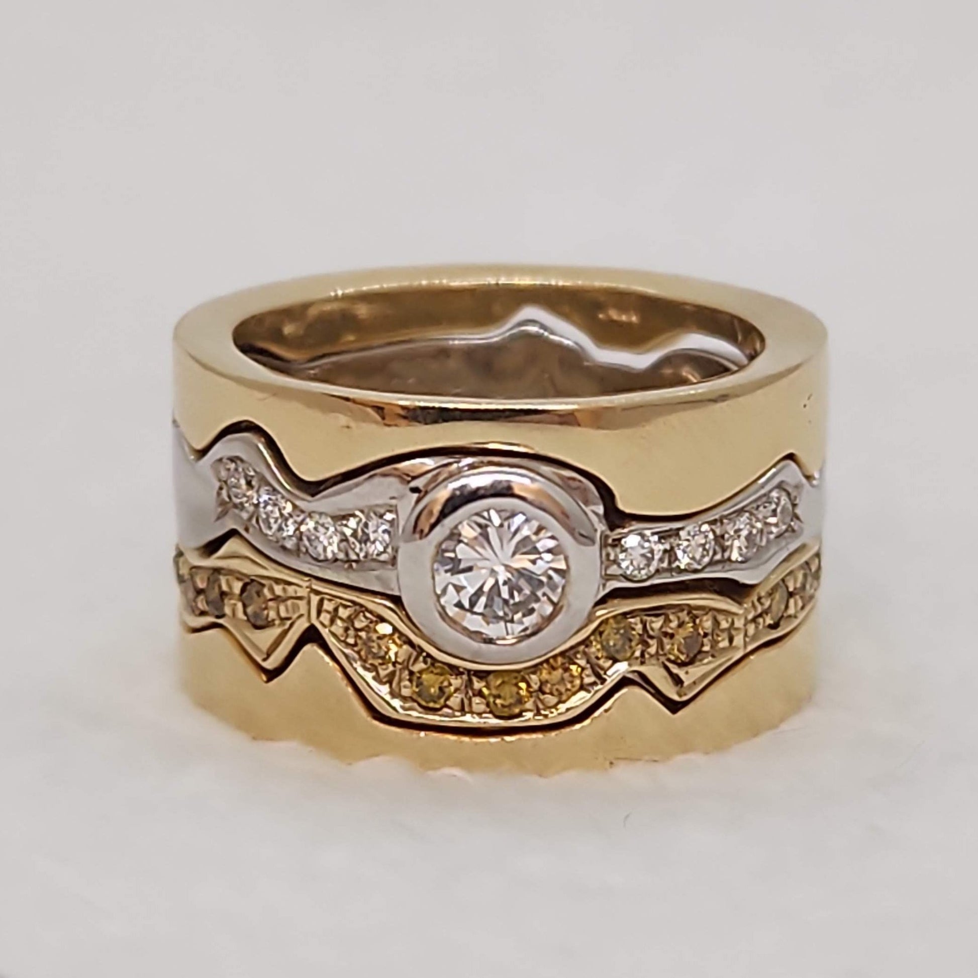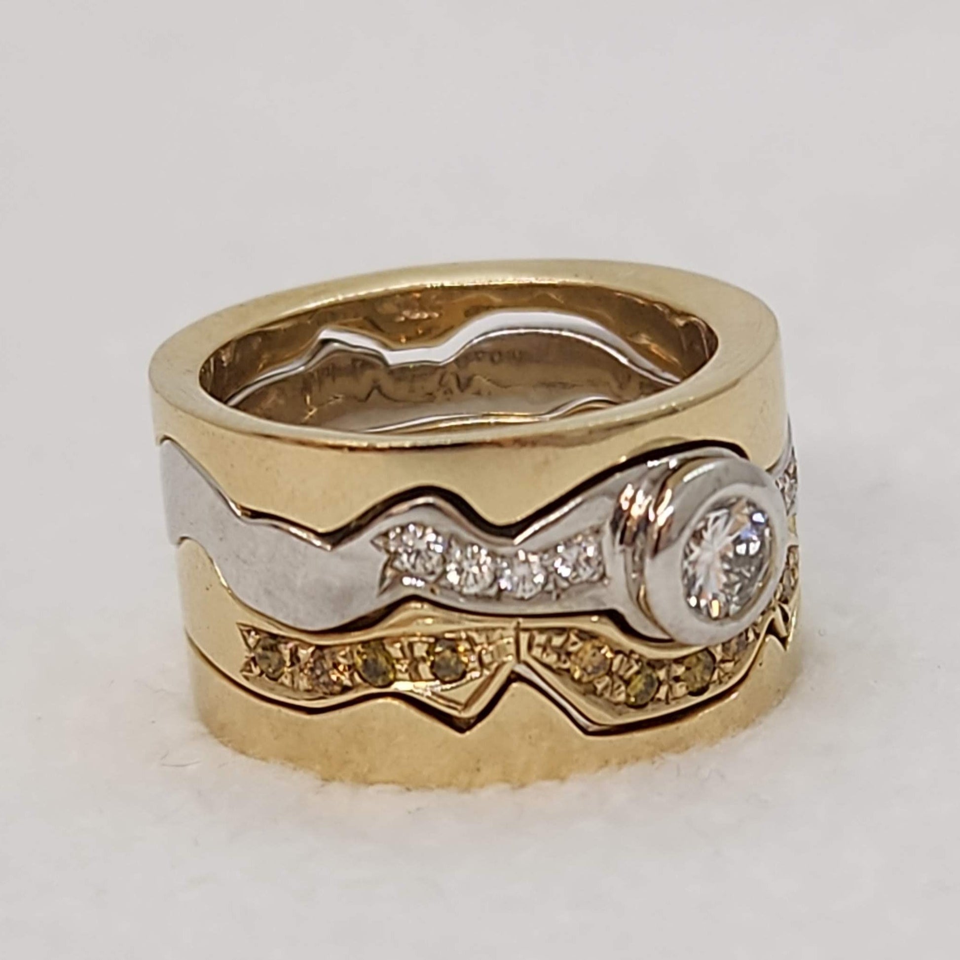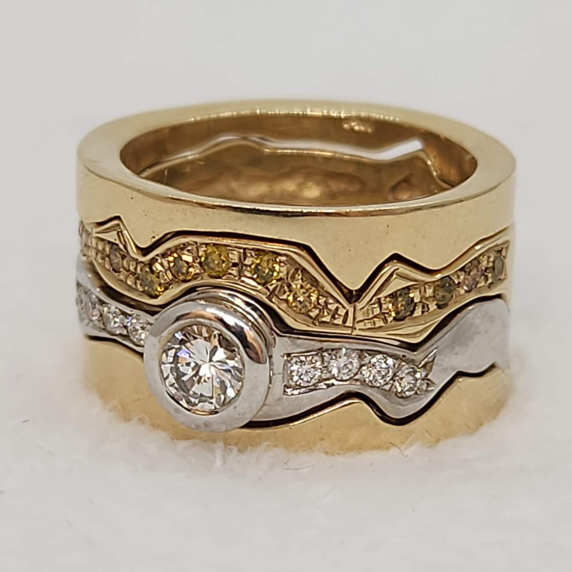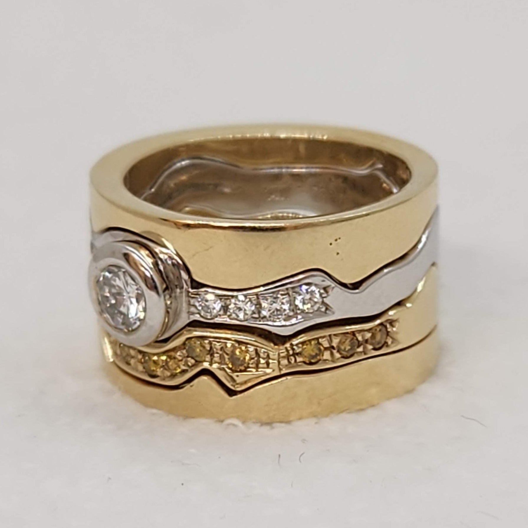 Inspired by the Canadian Rockies, this stacking set captures the snow capped mountains and the striking glaciers. Designed and made by Marigold Design Studio, this is a very special set of four rings all made to fit with each other. You can choose to wear just a few at a time, creating a different look from day to day. We've paired white diamonds set in white gold, and a warm yellow diamond set in yellow gold. So many unique details to enjoy in this piece!