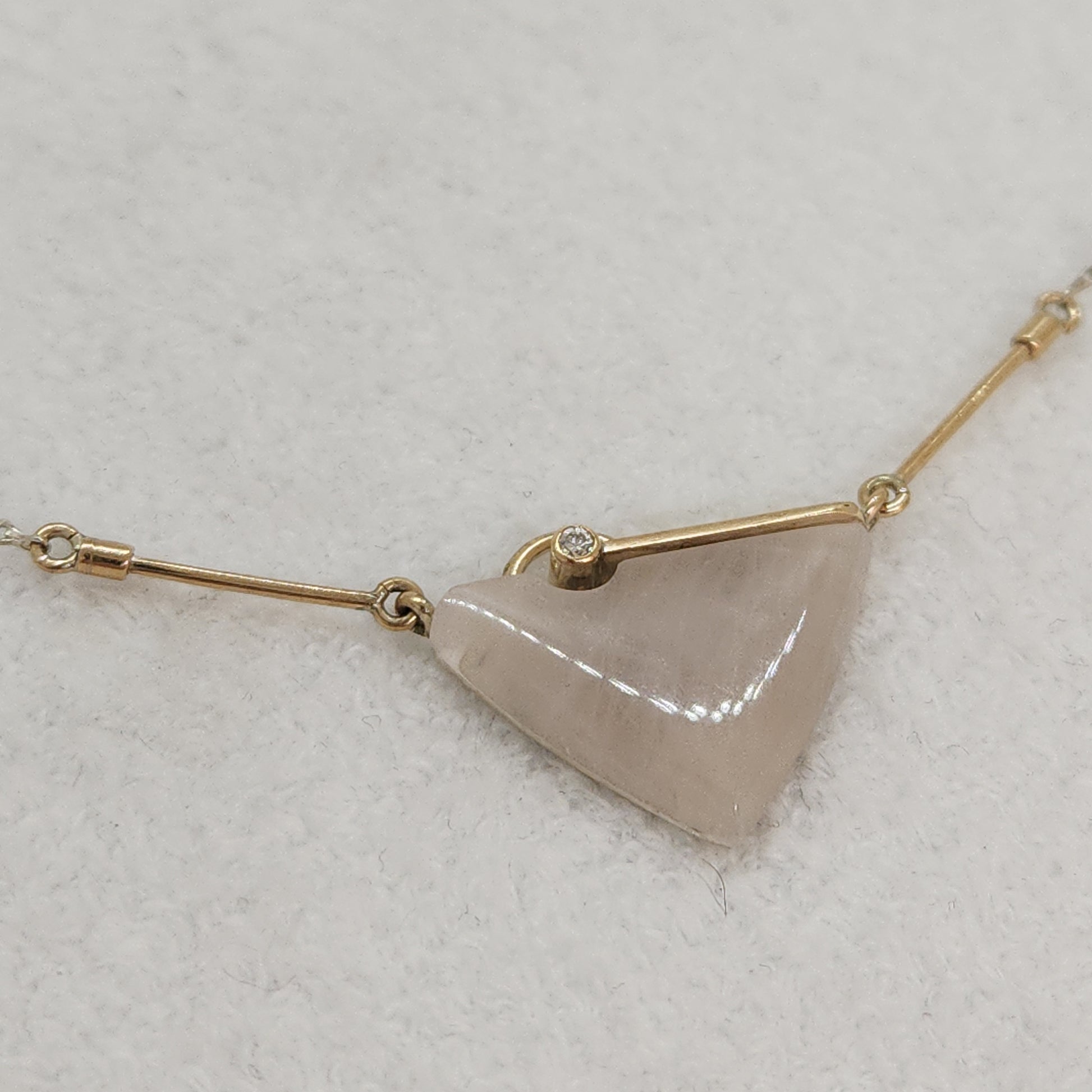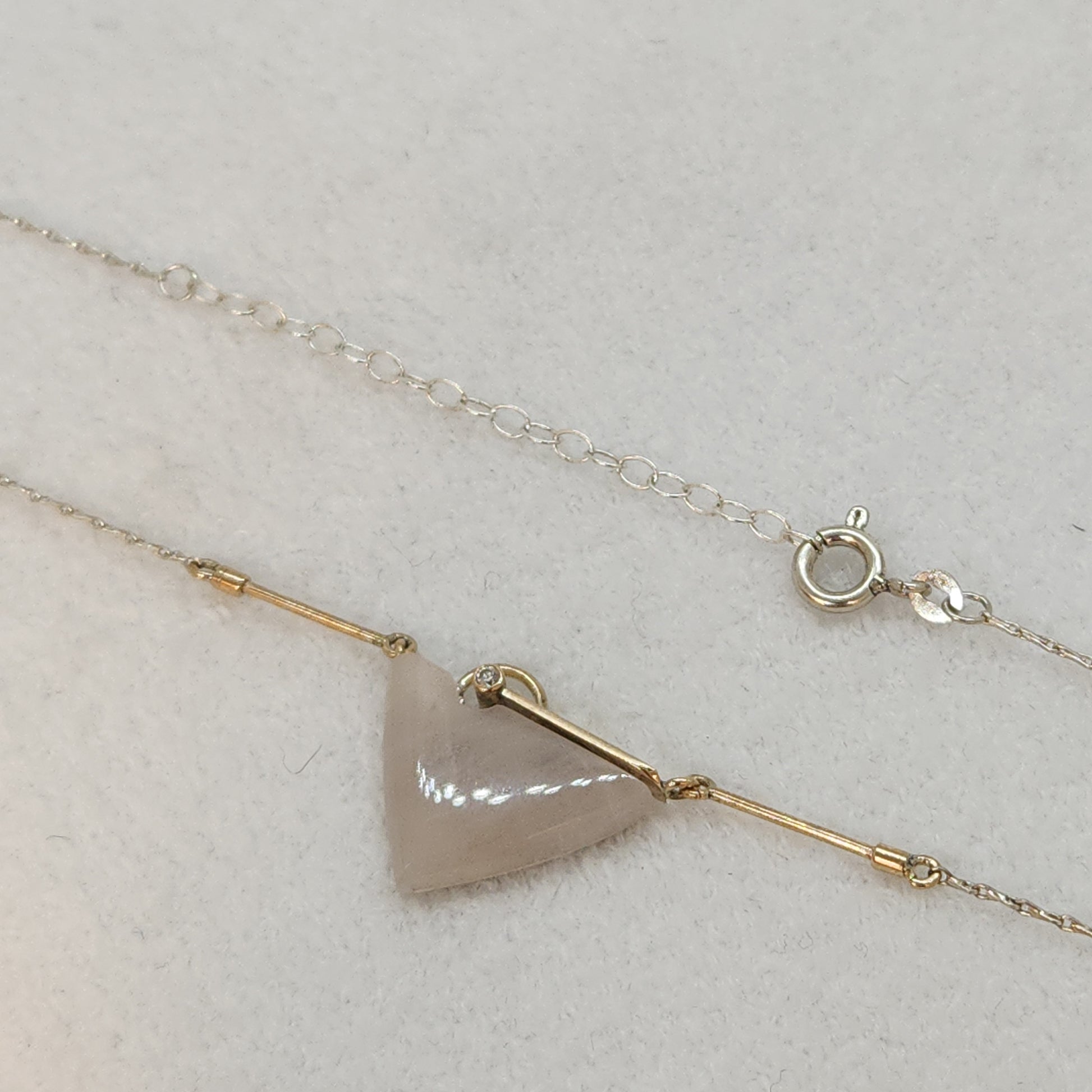 A Scandanavian vibe. This is handmade, with a combination of yellow gold and sterling silver. A uniquely cut Rose Quartz creates such a unique focal point. Rose quartz is known as a healing crystal and the stone of unconditional love. It's believed by some to emit strong vibrations of love, which are thought to: support emotional and relationship healing. inspire compassion. boost feelings of peace and calm.
