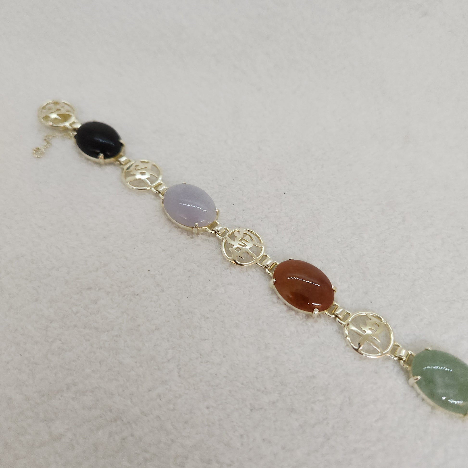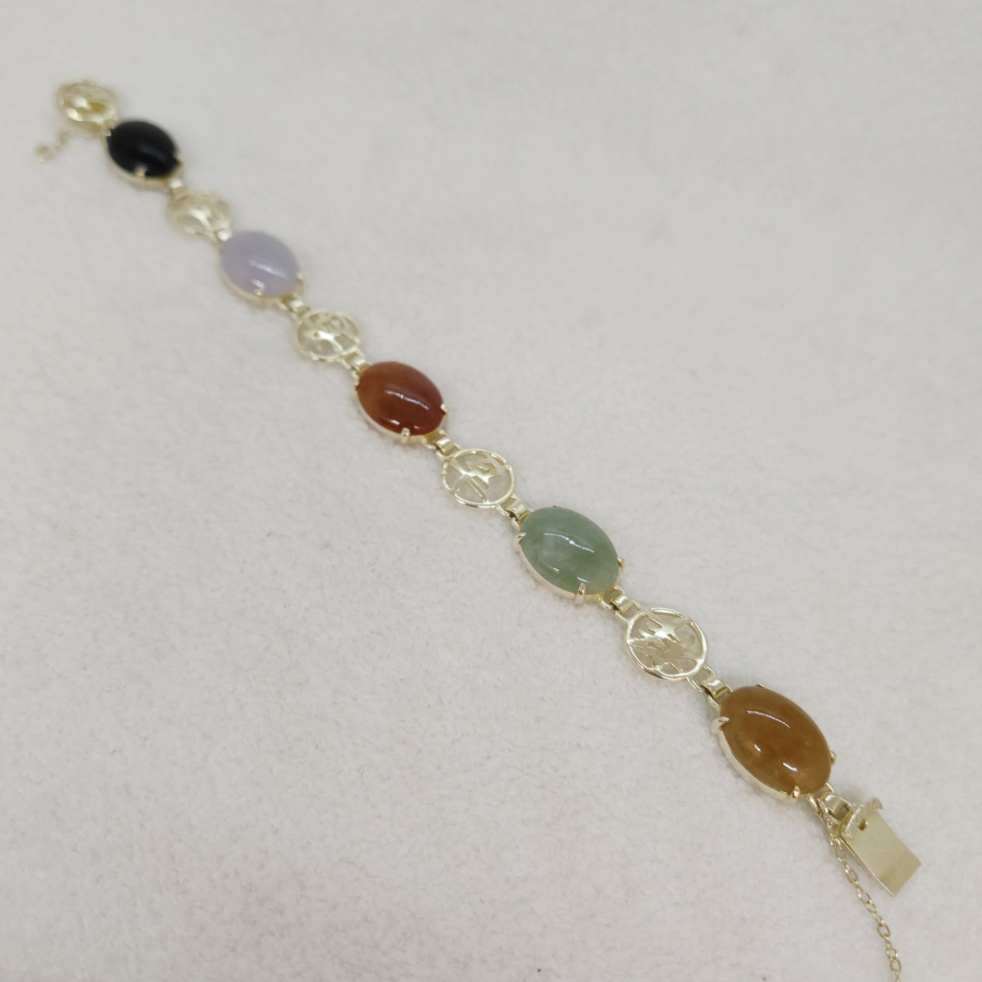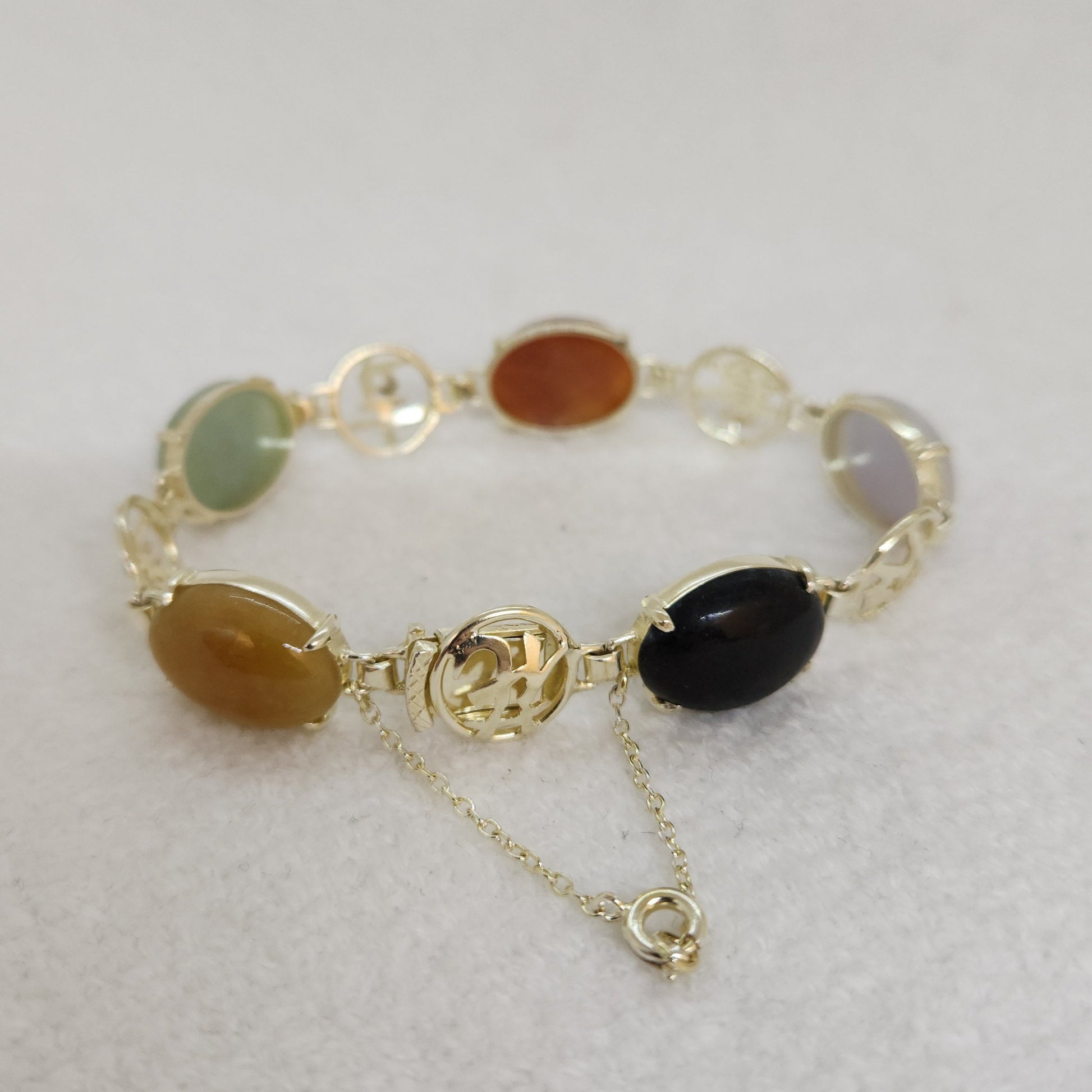 Did you know that Jade is found in colours other than green? This bracelet captures them all! Having all of these shades in one piece makes this a collector's item. It's stamped made in Hong Kong and has a safety catch for security.