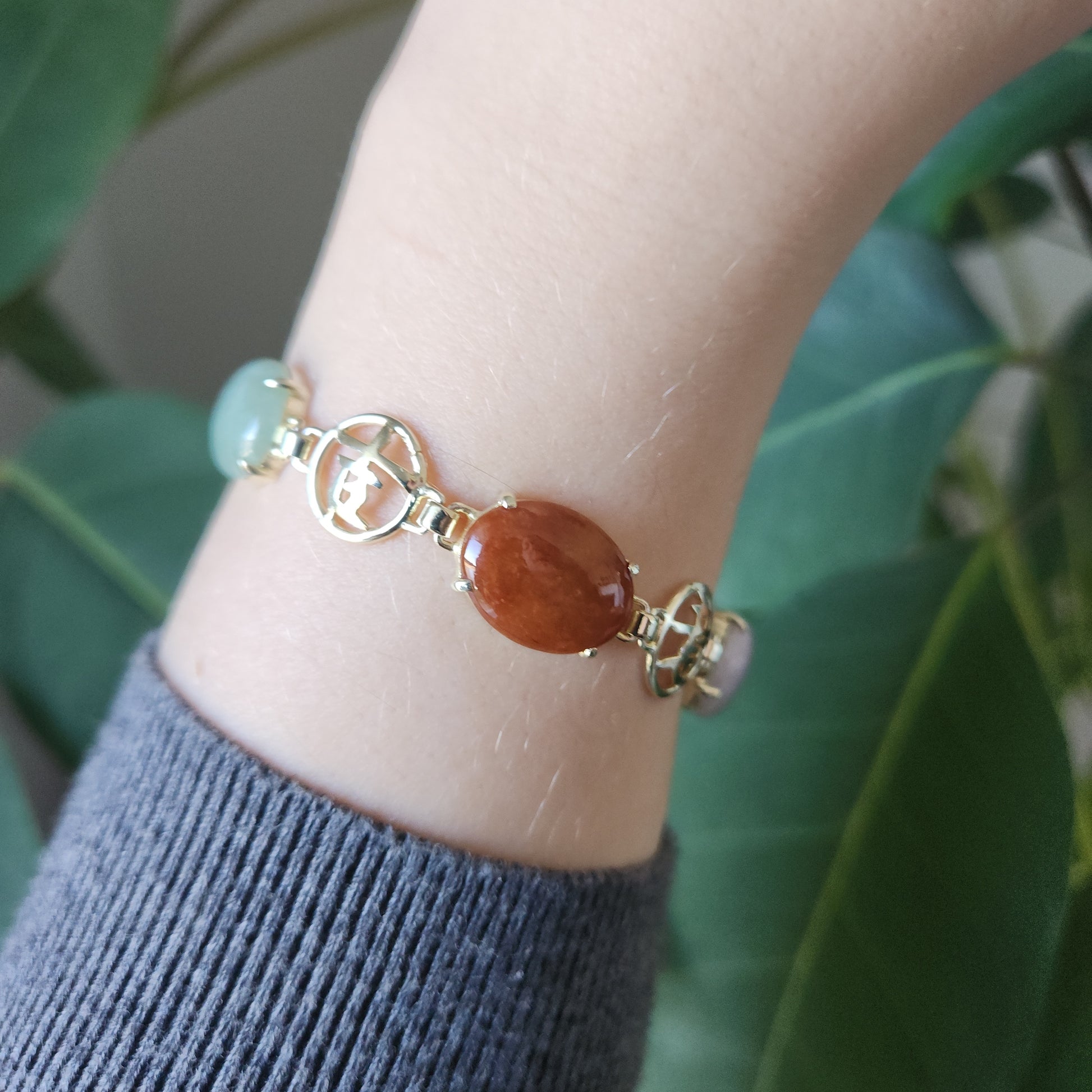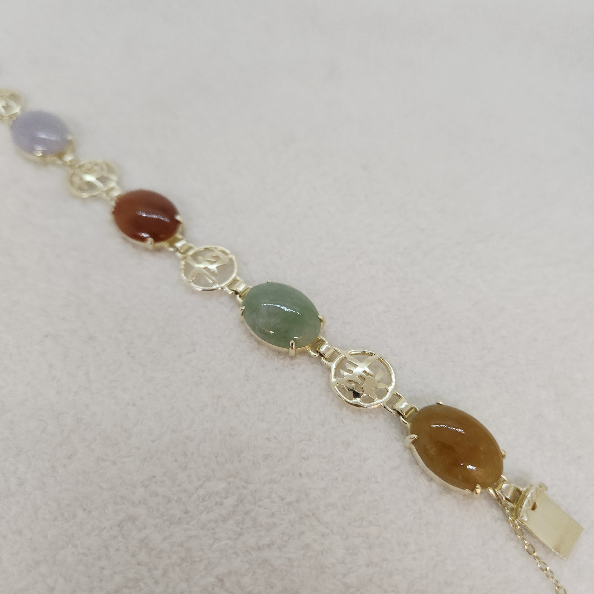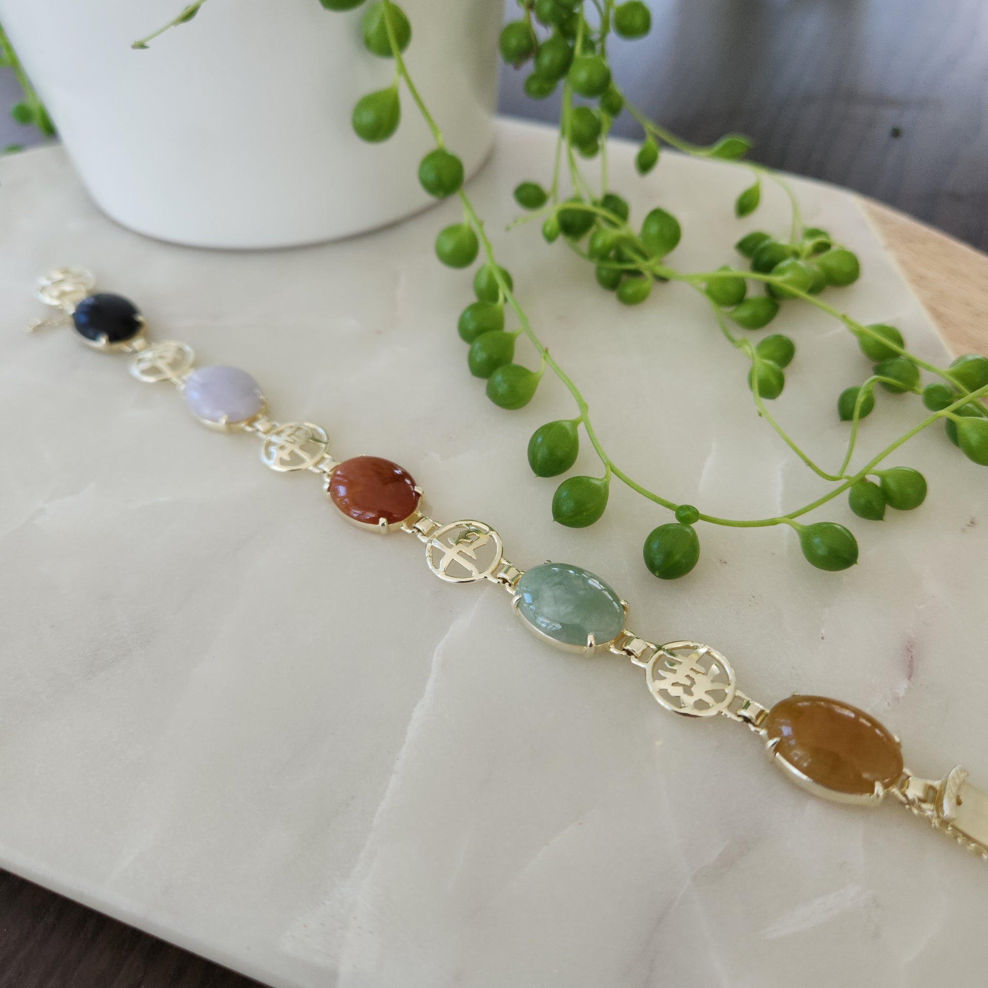 Did you know that Jade is found in colours other than green? This bracelet captures them all! Having all of these shades in one piece makes this a collector's item. It's stamped made in Hong Kong and has a safety catch for security.