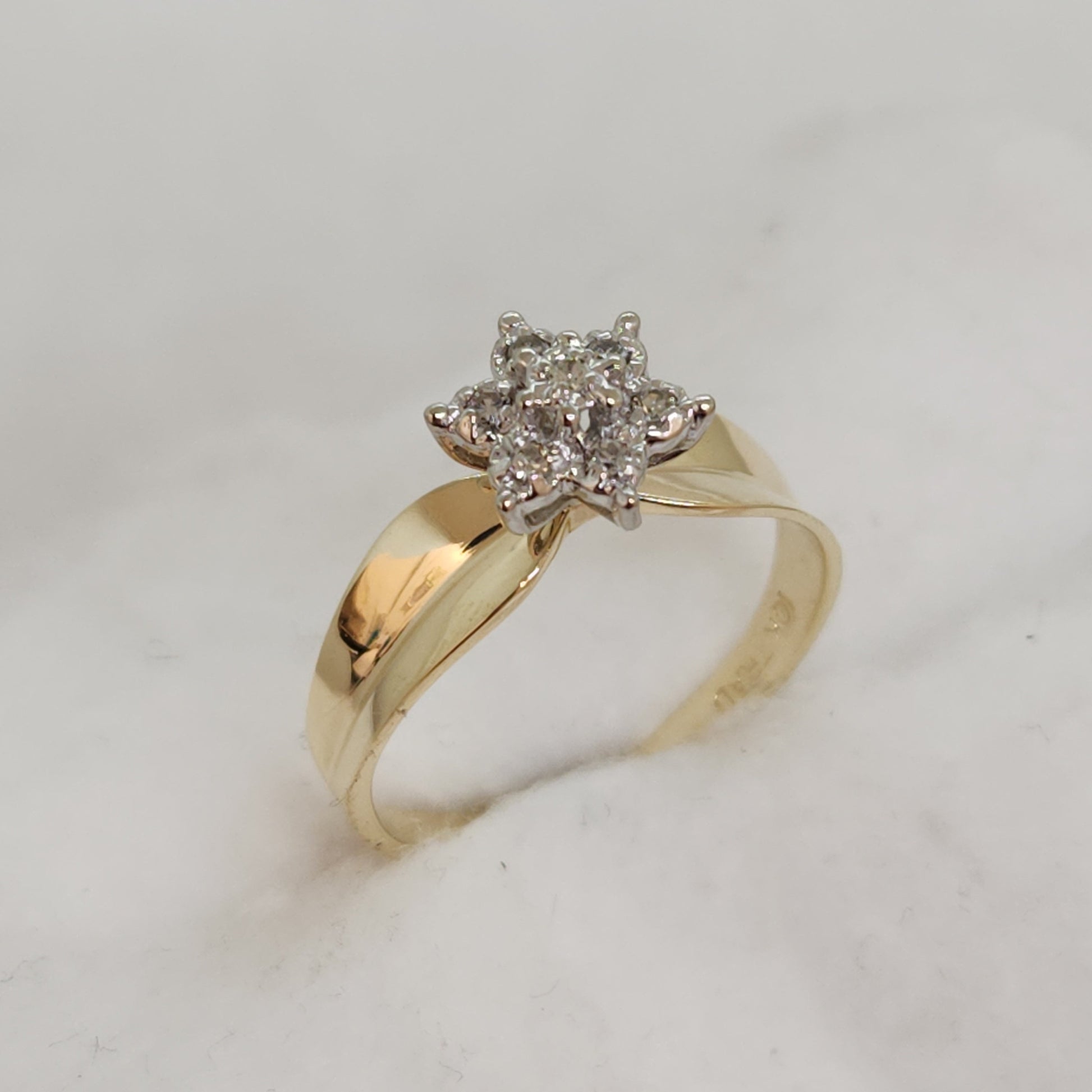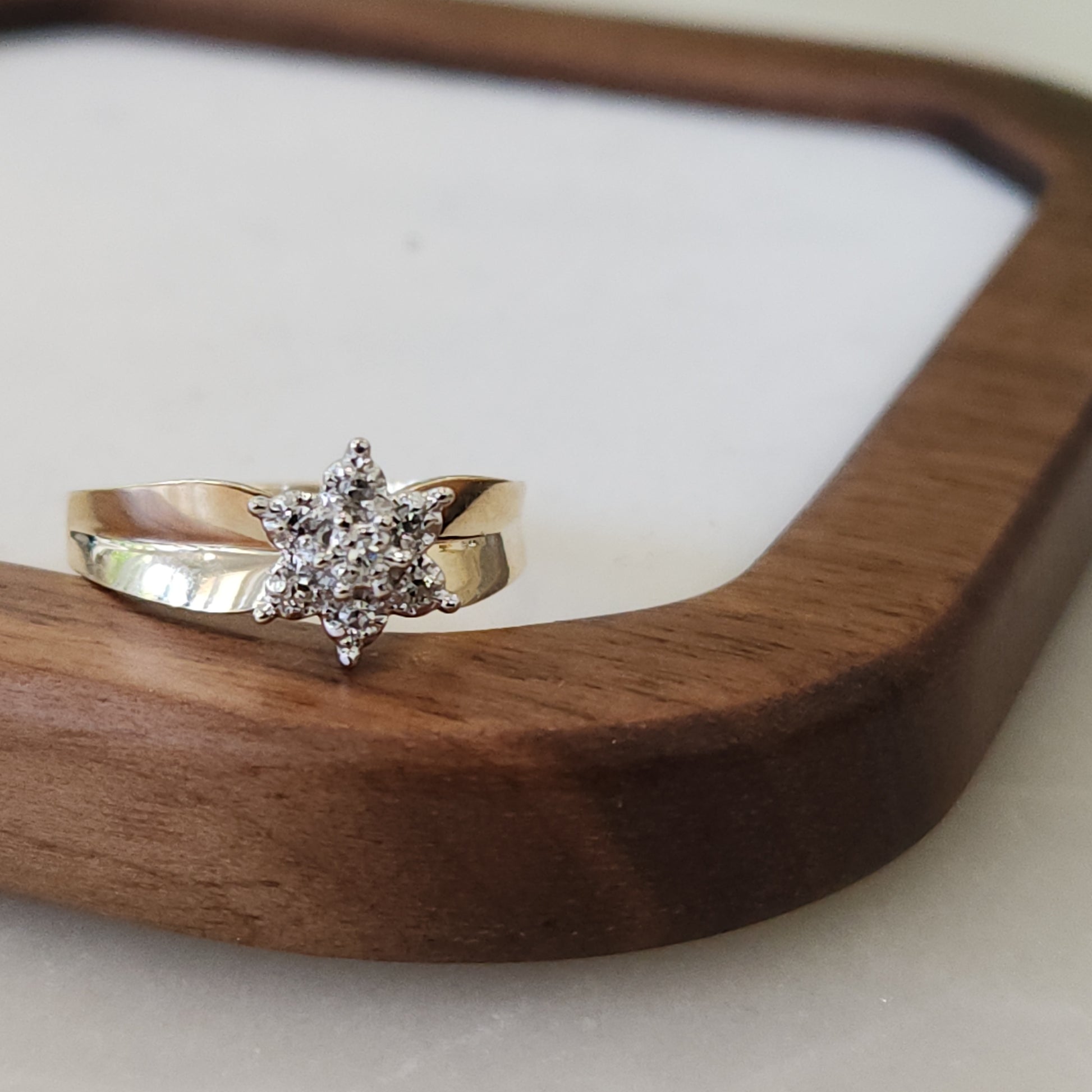 Dainty and feminine, this ring is light and comfortable. We love the slightly folded/fluted band, highlighting the diamond snowflake. An easy ring to wear everyday.
