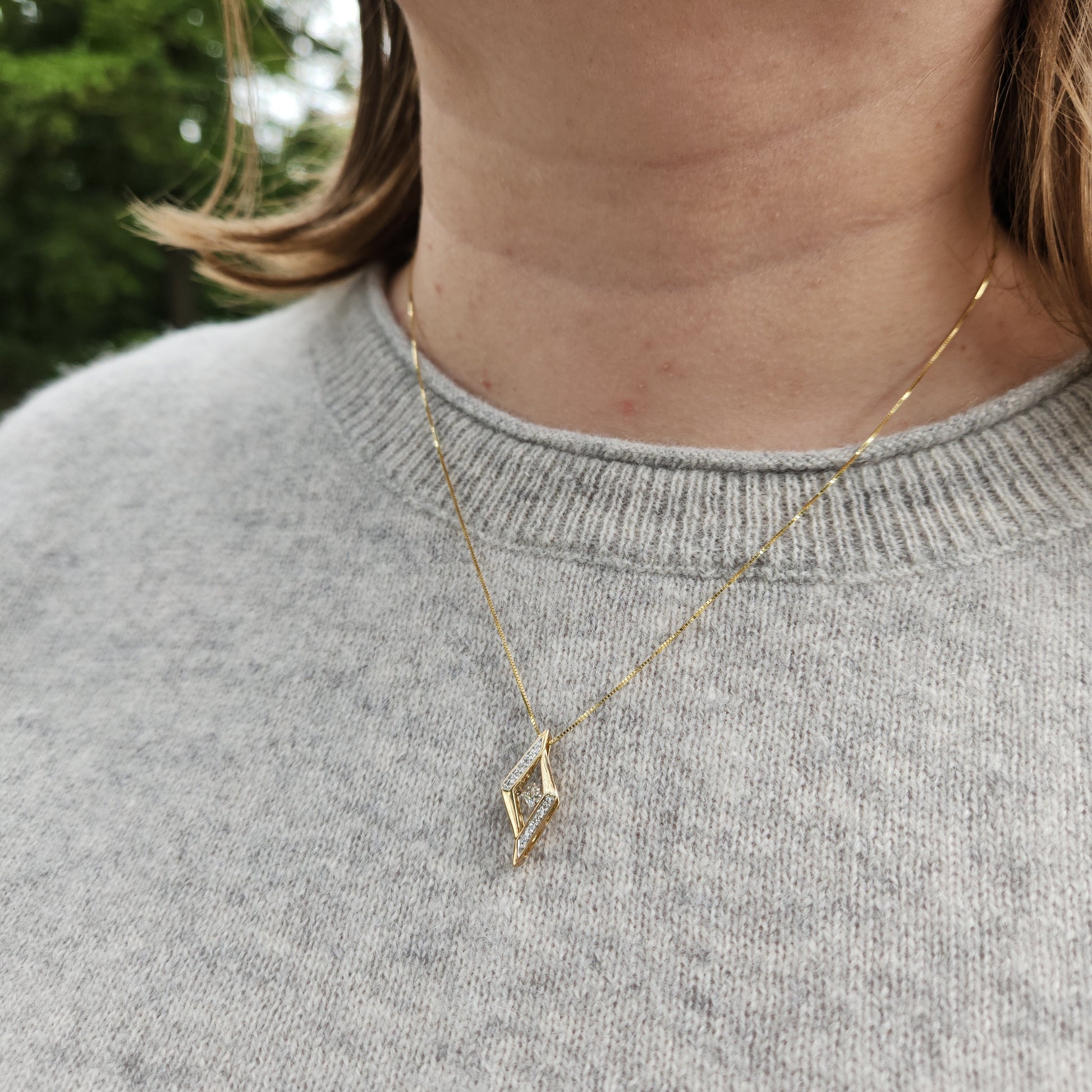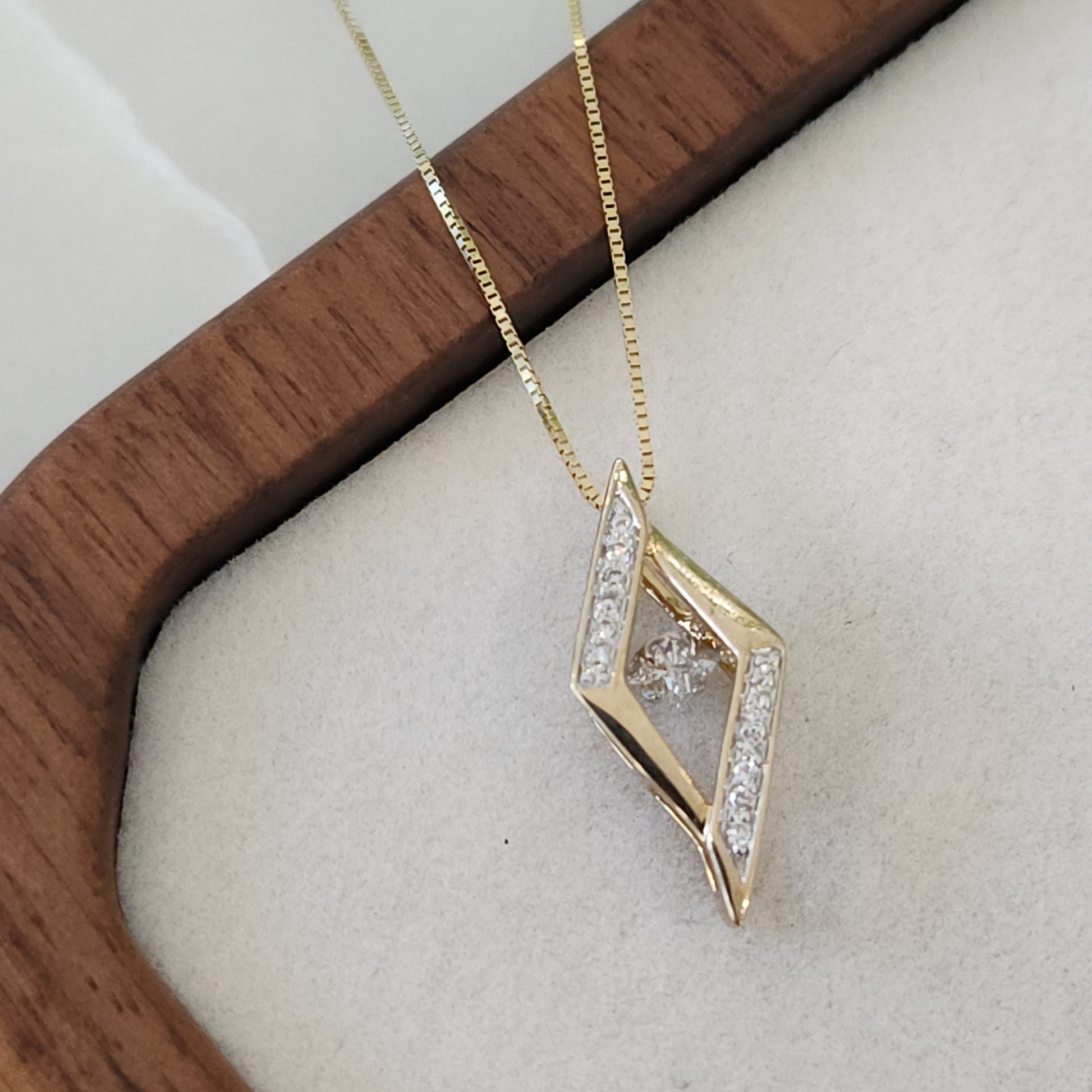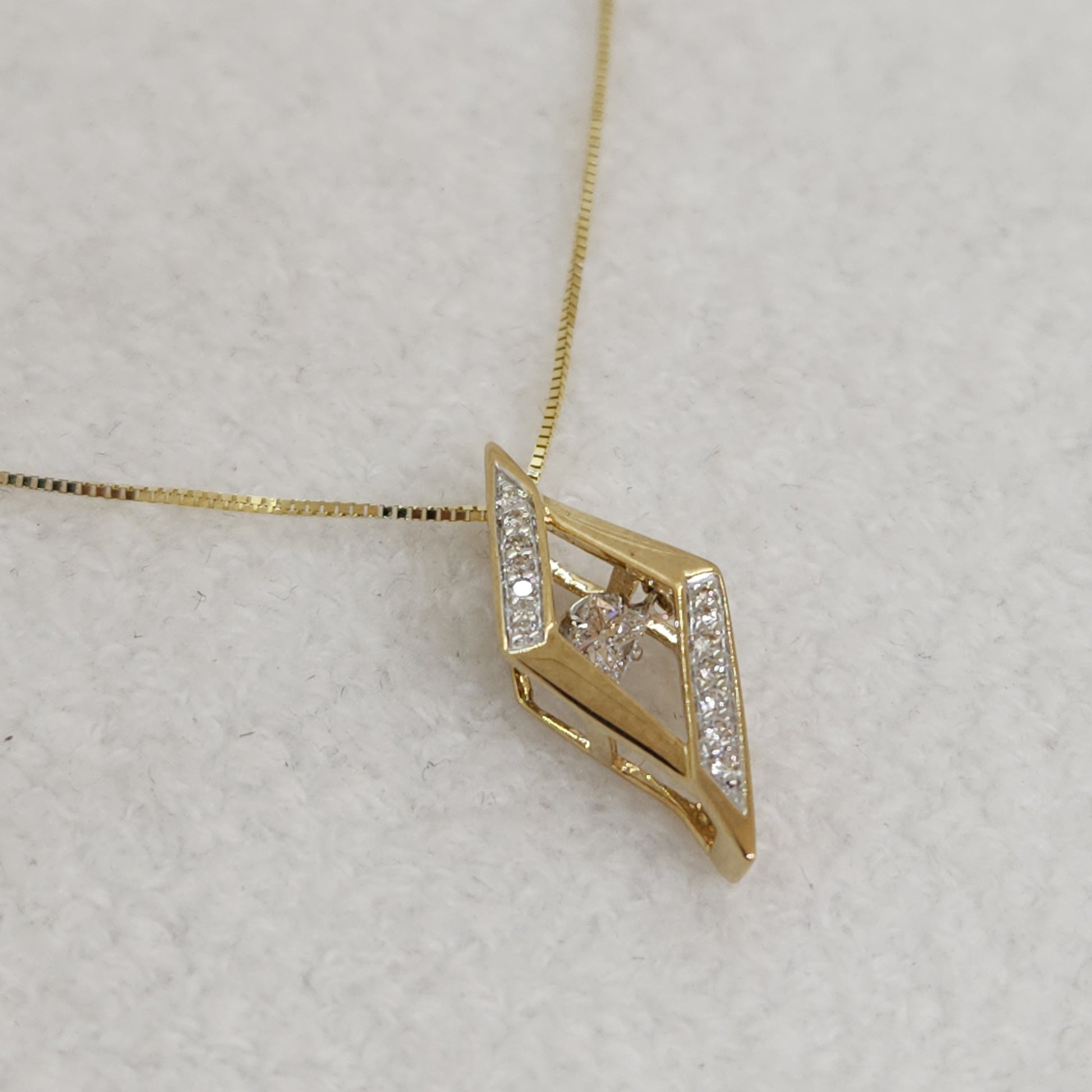 What makes this diamond pendant different from all the others? The central diamond, a princess cut is suspended on a bar - it moves as you move. The glint of this diamond will flash as you move about your day. We love that this design is unique, talk about maximum sparkle!
