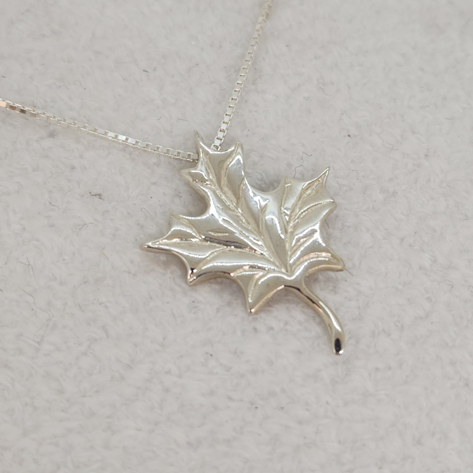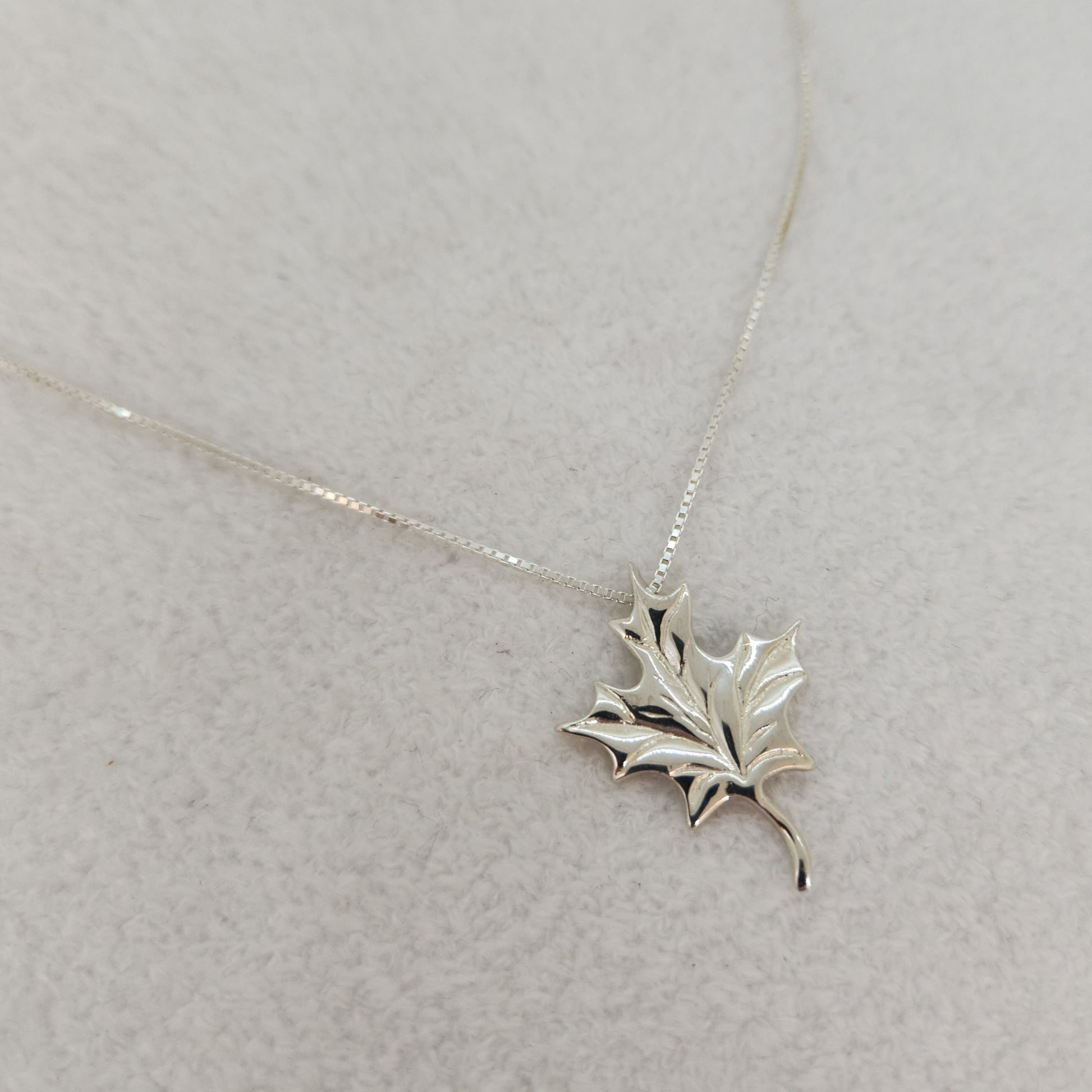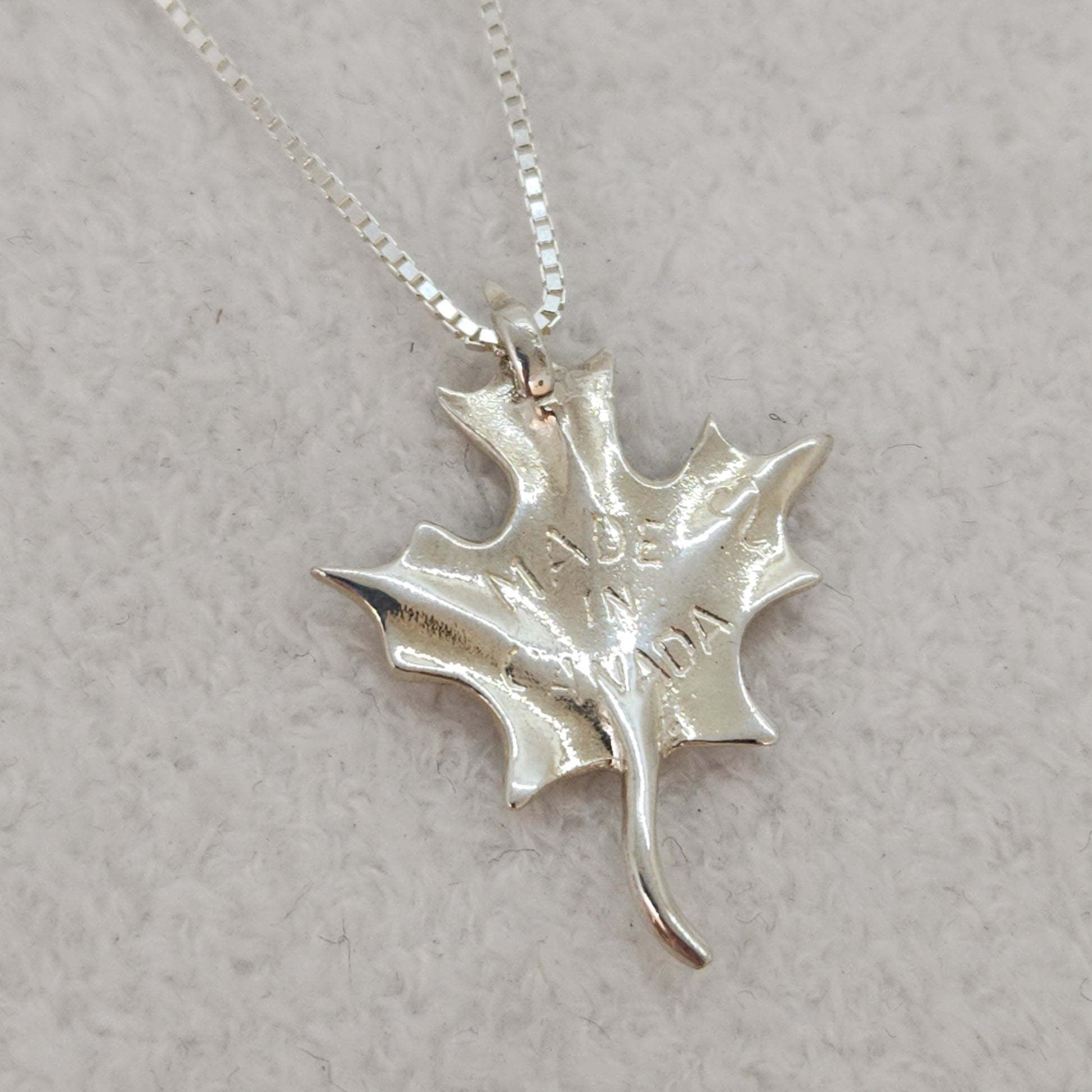 A maple leaf - synonymous with our Canadian heritage. Unmistakable even from a distance, this maple leaf looks as though it's dancing in the wind whilst suspended on this sleek box chain. Designed and made by Marigold Design Studio as part of our Canadiana Collection