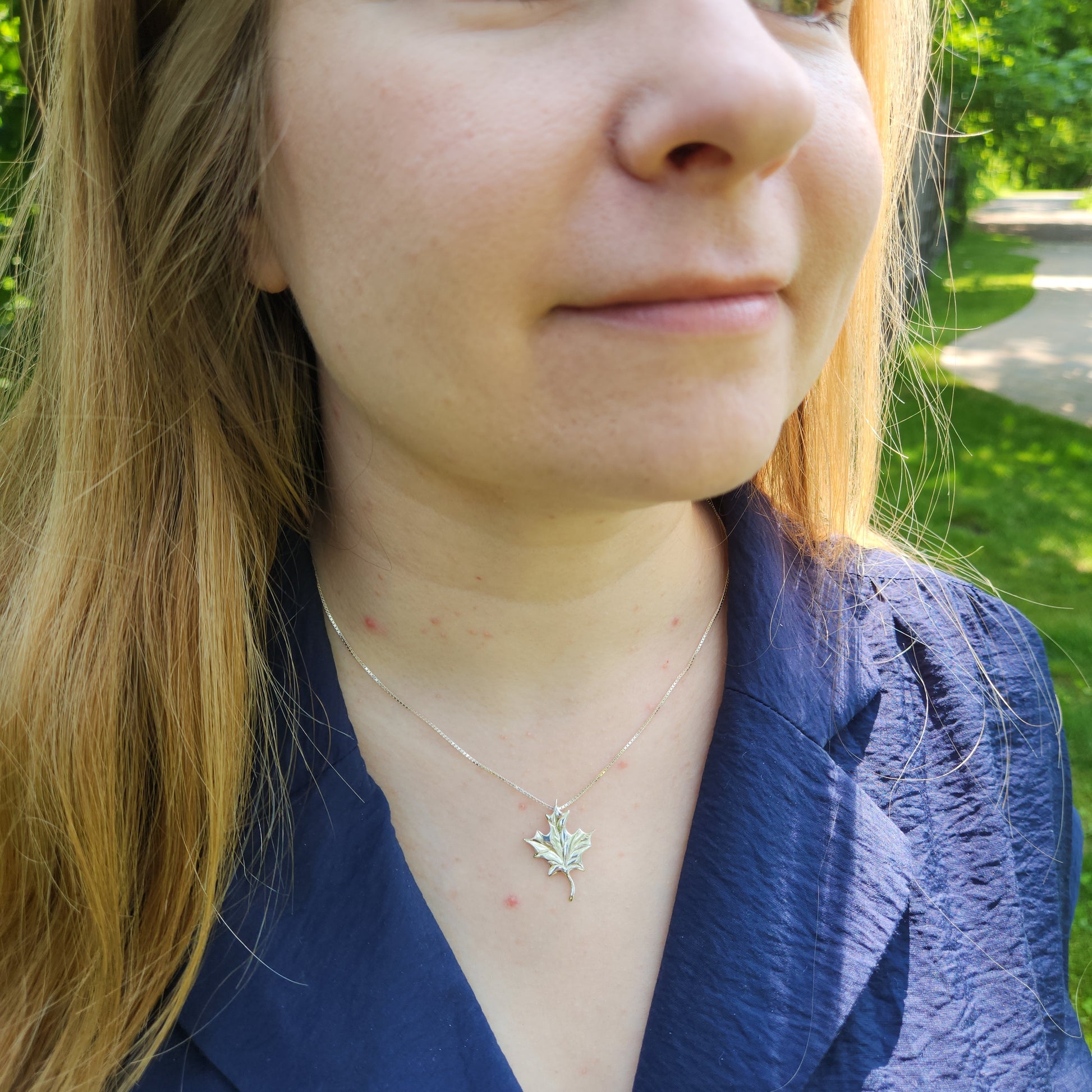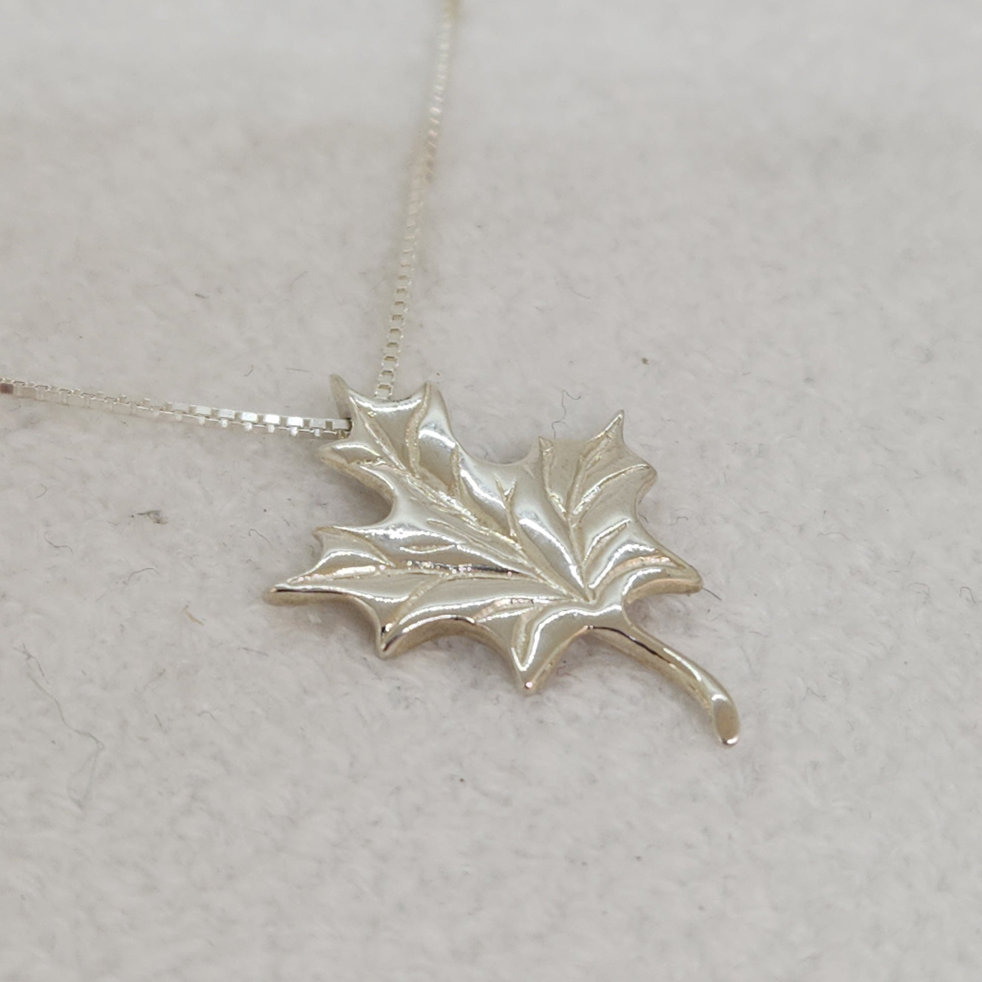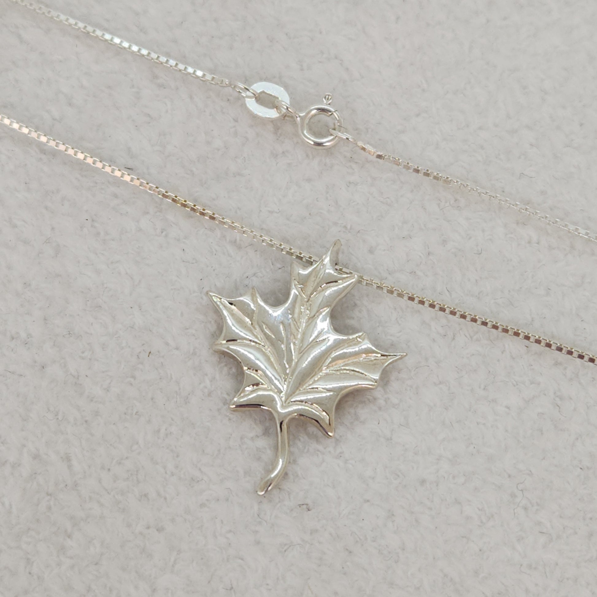 A maple leaf - synonymous with our Canadian heritage. Unmistakable even from a distance, this maple leaf looks as though it's dancing in the wind whilst suspended on this sleek box chain. Designed and made by Marigold Design Studio as part of our Canadiana Collection